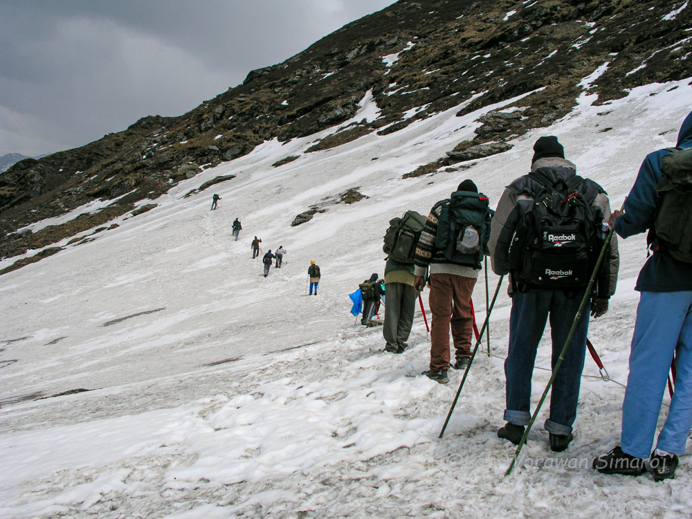 One of the highlights of the trek occurred on the fourth day when we actually got to walk on the snow. The guide and his staff prepared safety lines for us whenever we had to traverse the snowy slopes of the mountain trail. Slipping was of course unavoidable, but we had to make sure that we didn’t slip over a cliff from which rescue would be Impossible. It looked so dangerous but the safety was there. It was great fun, especially for those of us who live in countries that never experience snow.