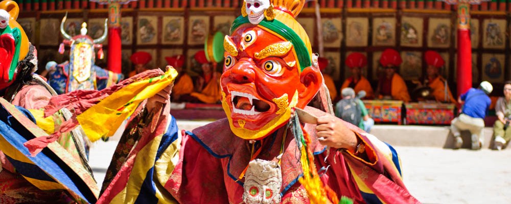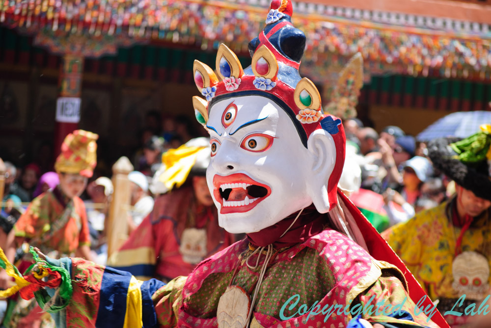 โชคดีที่การเดินทางมาถึงของฉันในช่วงเวลานี้ ตรงกับช่วงที่มีงานเทศกาลหน้ากากที่สำคัญของวัดเฮมิส (Hemis Gompa) อันลือชื่อพอดี ในงานเทศกาลที่ชื่อว่า Tse-Chu Festival จัดขึ้นเพื่อเฉลิมฉลองวันประสูติของคุรุรินโปเช หรือเรียกอีกชื่อหนึ่งว่าพระปัทมสมภวะ (Padmasambahya) พระลามะองค์แรกที่เผยแพร่ศาสนาพุทธเข้าสู่ทิเบตและดินแดนใกล้เคียงอื่นๆ ตัววัดเป็นวัดลามะในนิกายหมวกแดง (Nyingmapa) สร้างขึ้นตั้งแต่สมัยต้นคริสตศตวรรษที่ 17 และเป็นที่เก็บผ้าพระบฎ Thangka ผ้าที่ปักไหมเป็นลวดลายทางพุทธศาสนาแบบทิเบตที่มีขนาดใหญ่ที่สุดในลาดักห์ ว่ากันว่าจะนำออกมาแสดงในช่วงงานเทศกาลนี้ทุกๆ 12 ปี (กำหนดครั้งต่อไปปี ค.ศ. 2016) งานเทศกาลจะจัดขึ้นตามปฏิทินจันทรคติของทิเบต โดยจะมีขึ้น 3 วัน ถือเป็นหนึ่งในงานเฉลิมฉลองที่ยิ่งใหญ่ประจำปีงานหนึ่ง ฉันเลือกเข้าชมงานในวันที่ 2 เพื่อหลีกเลี่ยงผู้ศรัทธาจำนวนมหาศาลที่มักจะมาถึงกันในวันแรก อย่างไรก็ดี จากทางเดินขึ้นที่มีการออกร้านรวงต่างๆมากมาย สู่ลานประกอบพิธีในวัด ยังคงเบียดเสียดด้วยผู้คนจากทั่วสารทิศ ทั้งผู้ศรัทธาชาวพื้นเมืองและนักท่องเที่ยวจากที่ต่างๆทั่วทุกมุมโลก ฉันพาตัวเองหาที่เหมาะๆ ปักหลักรอชมการแสดงระบำหน้ากากอันลือชื่อของดินแดนแห่งนี้ (หากเสียเงินหรือมีบริษัทจองที่นั่งล่วงหน้า อาจได้ที่นั่งสบายๆใกล้ๆ) เมื่อเสียงสวดเริ่มดังขึ้น ตามด้วยเสียงแห่แหนของเครื่องดนตรีพื้นเมืองต่างๆ ขบวนแถวของพระลามะที่แต่งตัวใส่หน้ากากหลากสีสันก็ทะยอยออกมาแสดงระบำกลางลานอย่างดงาม การแสดงมีอยู่หลายรอบ ซึ่งแสดงเรื่องๆราวต่างๆแตกต่างกันไป โดยมีธีมหลักคือธรรมมะชนะอธรรม หรือความดีย่อมชนะความชั่วนั่นเอง หากมีโอกาสได้เดินสำรวจไปในส่วนอื่นๆของวัดในช่วงงานเทศกาลนี้ จะเห็นผู้คนหลั่งไหลมาทำบุญ และมีการทำอาหารแจกทานขนานใหญ่อยู่ที่บริเวณใกล้ๆโรงครัวด้วย กลิ่นควันจากกำยาน ผสมผสานเสียงสวดมนต์ และผู้คนที่มาร่วมทำบุญ แสดงให้เห็นถึงความศรัทธาในพุทธศาสนาที่ลงหลักปักฐานอยู่ในดินแดนแห่งนี้ตลอดระยะเวลาที่ผ่านมาและจากนี้ไป