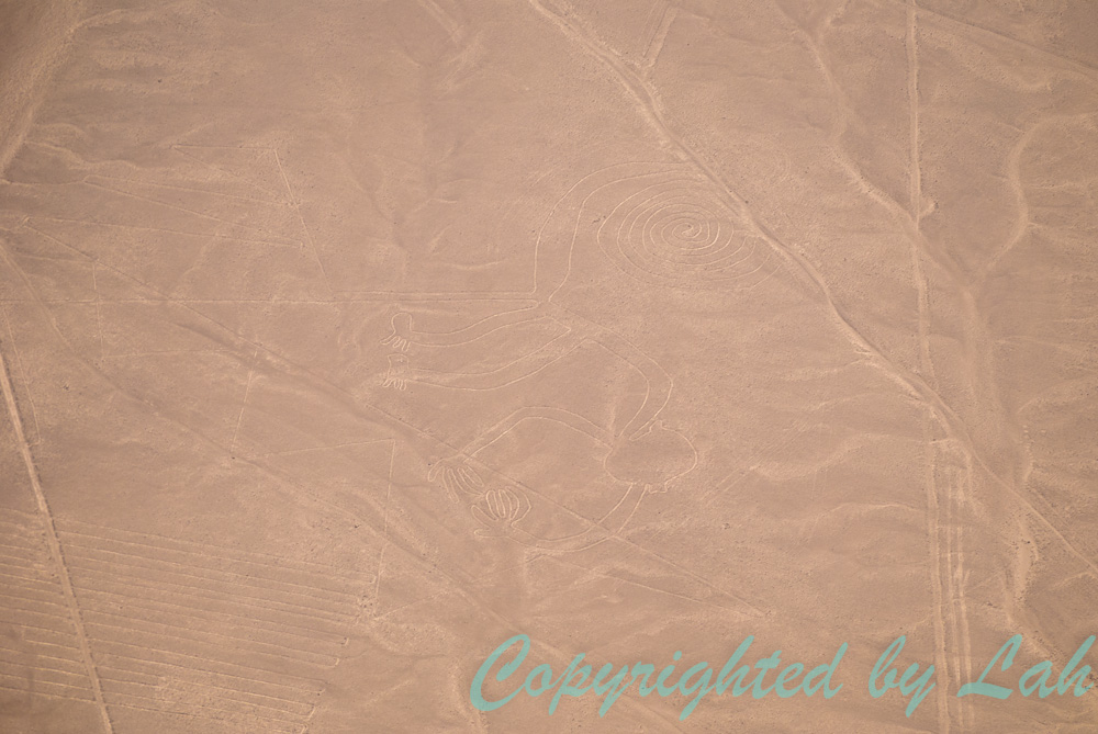 นาสก้าไลน์ (Nazca Lines) เป็นปริศนาลึกลับที่คนโบราณทำเอาไว้ซึ่งแม้แต่ในปัจจุบันก็ยังหาคำตอบที่แน่ชัดไม่ได้ เชื่อกันว่าเส้นเรขาคณิตต่างๆที่กระจัดกระจายอยู่บนพื้นที่แห้งแล้งไม่ไกลจากฝั่งทะเลทางด้านใต้ของเปรู ที่เรียกว่า Pampa Colorada (Red Plain) แห่งนี้ มีมากถึง 10,000 เส้น ทั้งเป็นเส้นตรงและประกอบเป็นรูปร่างต่างๆกว่า 300 ภาพ ในจำนวนนั้นมีทำเป็นรูปสิ่งมีชีวิตทั้งสัตว์และพืชอยู่ 70 รูป เนื่องจากพื้นที่แห้งแล้งที่เป็นดินแดงๆนี้เป็นเขตที่มีฝนตกน้อยมาก ทำให้ลายเส้นที่เชื่อกันว่าถูกทำขึ้นว่า 2,000 ปีมาแล้วแห่งนี้ยังคงอยู่…เครื่องบินเล็กพาฉันขึ้นไปบินเหนือฟากฟ้า เพื่อชมเส้นสายลายเส้นเหล่านี้ แม้ว่าจะได้รับแผนที่เล็กๆและภาพลายเส้นที่สำคัญๆที่จะได้เห็นในระหว่าง 30 นาทีที่เหินฟ้าอยู่กลางอากาศ แต่จากความตื่นเต้นหรืออย่างไรไม่ทราบ ฉันก็พลาดเห็นรูปแรกที่กัปตันชี้บอกไปอย่างงงๆ แม้ว่ากัปตันและเพื่อนร่วมทางจะทั้งพูดทั้งชี้อธิบายแล้วก็ตาม ฉันเริ่มตั้งสมาธิใหม่ แล้วก็นั่นเอง รูปนกฮัมมิ่งเบิร์ดที่กว้างยาวถึงเกือบๆ 100 เมตร แมงมุม (สัญลักษณ์ของฝนและความอุดมสมบูรณ์) ลิงหางยาวม้วนเป็นวง มนุษย์หัวกลมคล้ายมนุษย์อวกาศบนหน้าผา (บ้างว่าเป็นมนุษย์หัวนกเค้า) แร้งคอนดอร์ที่แผ่ปีกกว้างกว่า 130 เมตร และรูปสี่เหลี่ยมเรขาคณิตขนาดมหึมา เป็นต้น อีกรวม 10 กว่ารูป โชคดีที่ระหว่างวนกลับ กัปตันพามาวนดูแถวๆรูปแรกอีกครั้ง ฉันถึงได้เห็นเจ้าวาฬ สัตว์ตัวแรกที่ฉันพลาดไปในตอนต้น ซึ่งเจ้าวาฬตัวนี้นี่เองที่เป็นนาสก้าไลน์รูปแรกที่ถูกค้นพบโดยนักบินที่ขับเครื่องบินผ่านบริเวณนี้เป็นครั้งแรกเมื่อปี ค.ศ.1912