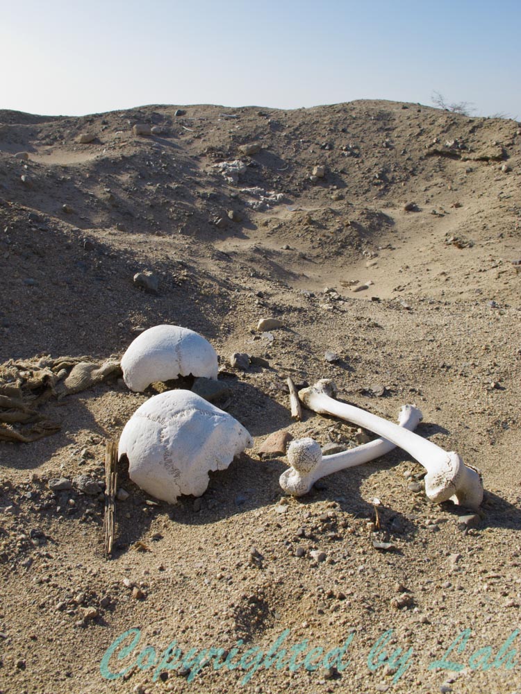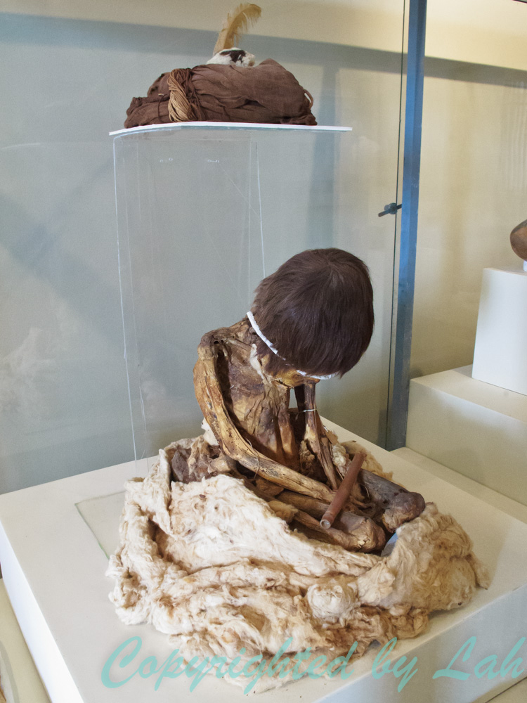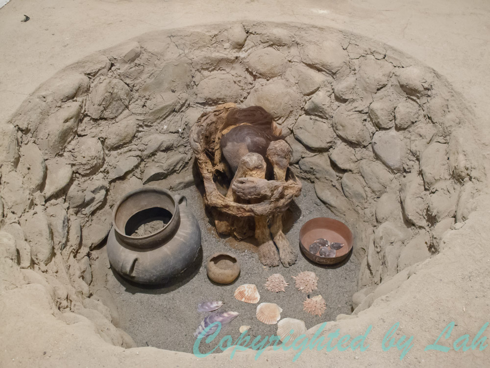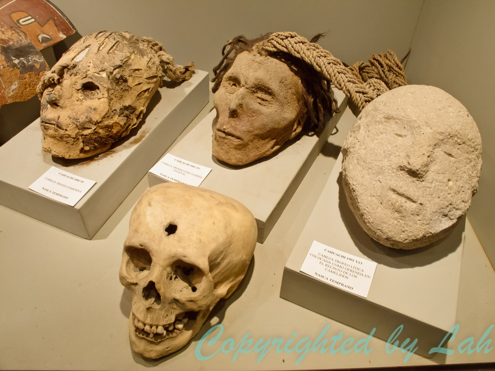 จากเครื่องบินยังไม่พอ ฉันแวะไปที่หอชมวิวนาสก้าไลน์ริมทางหลวงอีกรอบ เพื่อเดินขึ้นหอชมวิวไปในระดับสูงพอสมควรให้ได้เห็นเส้นนาสก้าที่ทำเป็นรูปต้นไม้และมือ (บ้างว่าเป็นกบ) ที่อยู่ติดกับหอดังกล่าว เพื่อถ่ายรูปตัวเองกับเส้นลึกลับไว้เป็นที่ระลึก (อยู่บนเครื่องบินไม่มีทางถ่ายคู่ได้) หอชมวิวแห่งนี้เป็นอีกทางเลือกหนึ่งสำหรับผู้ที่ไม่ชอบความหวาดเสียวในการบินบนเครื่องบินลำเล็กๆ แต่ก็อาจระทึกขวัญพอควรสำหรับคนที่กลัวความสูงเป็นทุนเดิม จากนั้นฉันแวะไปดูศูนย์กลางอารยธรรมนาสก้าที่กาฮัวชี (Cahuachi) สิ่งก่อสร้างรูปทรงปิรามิดสร้างจากอิฐโคลนสูงประมาณ 30 เมตร กลางทะเลทรายอันร้อนแรง เชื่อว่ายังมีปิรามิดเล็กๆอยู่ในอาณาเขตโดยรอบหลายร้อยอัน และรวมถึงหลุมฝังศพอีกหลายพันหลุม เนื่องจากพื้นที่แห้งแล้งกว้างใหญ่เป็นทะเลทรายและงบประมาณจำกัดของประเทศ ทำให้สถานที่แห่งนี้ยังคงอยู่ในระหว่างการขุดค้น ซึ่งก็ไม่ทันกับเหล่าหัวขโมยขุดหาสมบัติที่ตลุยขุดศพมัมมี่ของชาวนาสก้าเพื่อหาของมีค่า (แม้แต่ในปัจจุบัน) ระหว่างทางฉันถึงได้เห็นเศษซากกระดูกของมนุษย์และผ้าห่อมัมมี่กระจัดกระจายอยู่เป็นระยะๆ ฉันและเพื่อนร่วมทางจึงจอดรถกลางทะเลทรายร้อนระอุเพื่อไปดูซากโครงกระดูกเหล่านี้ให้ชัดๆ ไม่ใช่ว่าฉันบ้าหรือไม่กลัวอะไรหรอก เพียงแต่ว่า อารยธรรมโบราณที่นี่ มีสิ่งที่น่าสนใจอีกอย่างหนึ่งที่ฉันอยากเห็นกับตา…นั่นก็คือมนุษย์หัวกระโหลกยาว