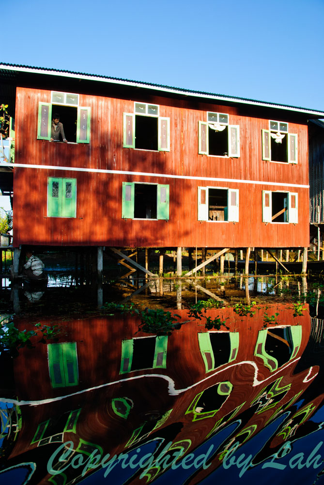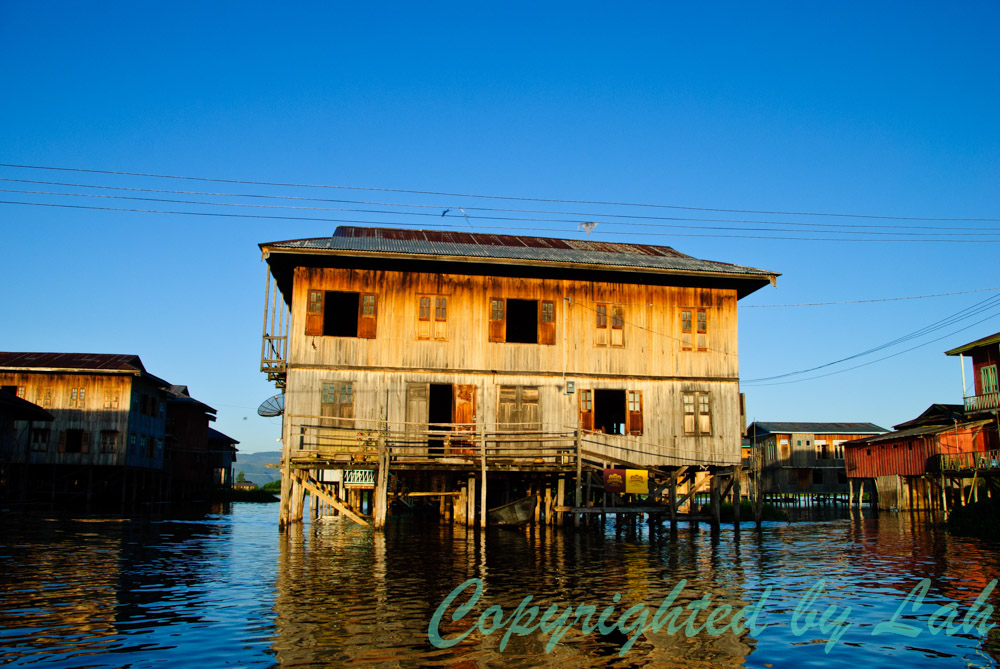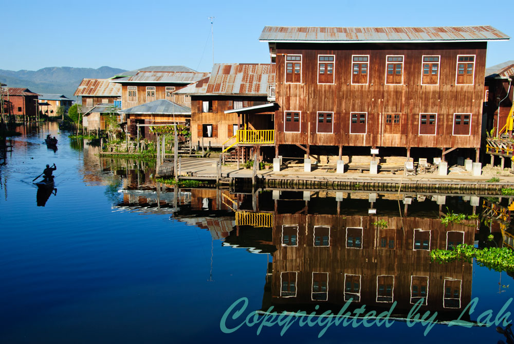 คนขับเรือพาฉันผ่านเข้าไปในหมู่บ้านที่ปลูกอยู่กลางทะเลสาป ผู้คนที่นี่ใช้ชีวิตอยู่เหนือทะเลสาปเป็นปกติ บ้านส่วนใหญ่สร้างจากไม้ บนเสาสูง รองรับการขึ้นลงของน้ำในทะเลสาประหว่างฤดูกาลที่จะต่างกันประมาณ 1.5 เมตรระหว่างฤดูแล้งและฤดูฝน ในหมู่บ้านกลางน้ำ มีการปลูกเรือนเป็นแถวๆ ในช่วงน้ำนิ่งๆ จะเห็นเงาของบ้านที่สะท้อนผิวน้ำที่เรียบกริบเป็นสีสันต่างๆอย่างชัดเจน โดยเฉพาะอย่างยิ่งในช่วงเช้าตรู่ของแต่ละวันที่แสงอาทิตย์กำลังอ่อนโยนสวยงาม ไม่ใช่แดดจ้าร้อนแรงอย่างตอนกลางวัน นอกจากนี้ การไปเที่ยวแต่เช้า ยังมีโอกาสได้พบเห็นเรือพายรับเด็กนักเรียนตามบ้านไปโรงเรียน หรือเด็กๆอาจเดินกันเป็นกลุ่มๆไปตามสะพานไม้ที่ทอดกันไปมาระหว่างบ้านใกล้ๆ อันเป็นภาพที่งดงามน่าประทับใจเป็นอย่างยิ่ง เมื่อถึงเวลาสายของวันแล้ว ฉันถึงได้ไปแวะดูงานช่างฝีมือของชาวบ้านที่อาศัยอยู่บนทะเลสาป ไม่ว่าจะเป็นงานแกะสลักไม้ ทอผ้า ทำเครื่องมือต่างๆ หรือทำยาสูบพม่า แต่ที่ฉันชอบใจเป็นอย่างยิ่งคือการทอผ้าจากใยสายบัวที่ขึ้นอยู่ในทะเลสาป โดยชาวบ้านจะหักก้านบัวดึงสายขาวๆออกมารวมตัวกันเป็นเส้นด้ายเพื่อใช้ถักทอชิ้นผ้าต่อไป ผ้าที่ทอจากสายบัวล้วนๆจะมีราคาแพงมาก และมักใช้ในงานพิธีสำคัญๆเท่านั้น ส่วนที่ขายให้นักท่องเที่ยวจะเป็นงานทอจากด้ายสายบัวและไหม หรือเส้นใยอื่นๆผสมกัน เป็นต้น