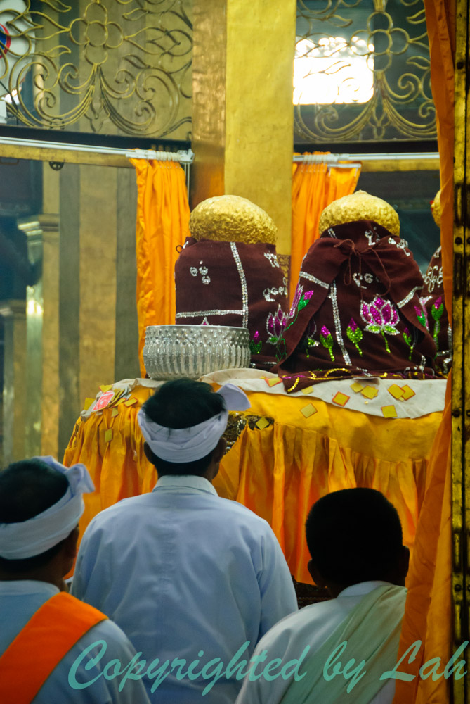 เมื่อขบวนเข้าจอดเทียบท่า ฉันจึงมีโอกาสได้เห็นพระพุทธรูปที่มีทั้งหมดสี่องค์อย่างชัดเจน แม้จะมีขนาดไม่ใหญ่มากแต่ก็อยู่ในลักษณะที่ฉันคิดไม่ถึง เพราะฉันเห็นเหมือนเป็นแค่ก้อนทองกลมๆเท่านั้น ไม่เห็นหน้าตาหรือทรวดทรงของพระพุทธรูปอย่างที่เห็นอย่างชินตาในประเทศไทย ทั้งนี้ เนื่องจากพุทธศาสนิกชนชาวพม่าได้นำทองมาปิดองค์พระพุทธรูปอย่างล้นหลามต่อเนื่องมาเป็นเวลาหลายปีจนกลายเป็นก้อนทอง มองไม่เห็นองค์พระพุทธรูปด้านในเลย ซึ่งในความเป็นจริงแล้ว มีพระพุทธรูปศักดิ์สิทธิ์ทั้งหมดนี้มีอยู่ 5 องค์ ขนาด 9-18 นิ้วแตกต่างกัน มีเรื่องเล่าว่า สมัยก่อนมีการแห่แหนพระพุทธรูปทั้ง 5 องค์ไปทางน้ำตามปกติ อยู่มาปีหนึ่ง พระพุทธรูปองค์หนึ่งตกน้ำในทะเลสาปจมหายไป ชาวบ้านต่างงมอย่างไรก็งมไม่เจอจนต่างท้อไปตามๆกัน แต่เมื่อขบวนเรือพร้อมพระพุทธรูปทั้งสี่เดินทางกลับมาถึงวัดพองเดาอู วัดหลักที่ประดิษฐานพระพุทธรูปยามปกติ กลับพบว่า พระพุทธรูปองค์ที่ตกน้ำจมหายไปนั้นกลับตั้งประดิษฐานอยู่บนแท่นตามปกติโดยไม่มีใครรู้ว่าใครนำกลับมาหรือกลับมาตั้งอยู่ที่เดิมได้อย่างไร ตั้งแต่นั้นเป็นต้นมา ในพิธีแห่เรือ จึงมีการนำพระพุทธรูปแค่ 4 องค์ออกเรือแห่ไปตามหมู่บ้านต่างๆรอบทะเลสาปอินเลเท่านั้น โดยปล่อยองค์ที่เชื่อว่าตกน้ำจมหายไปประดิษฐานอยู่ที่วัดนี้ตลอดไปโดยไม่นำออกมา