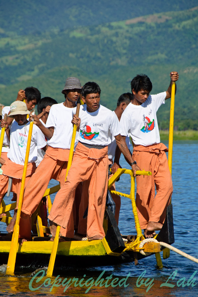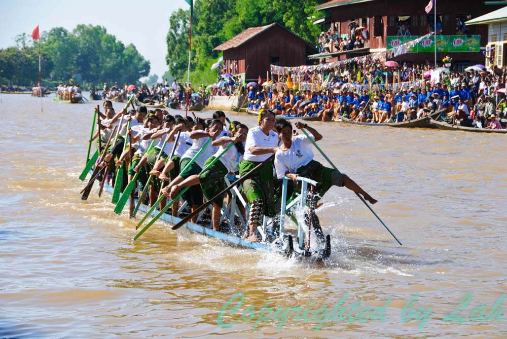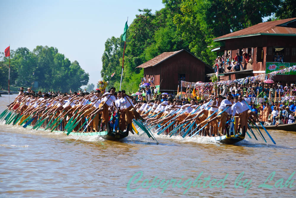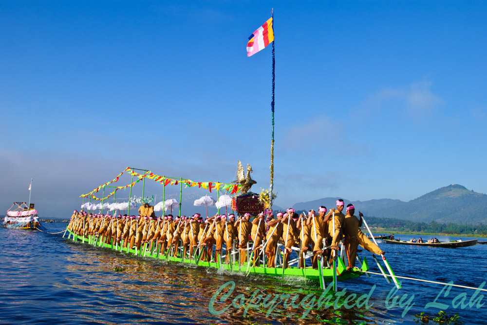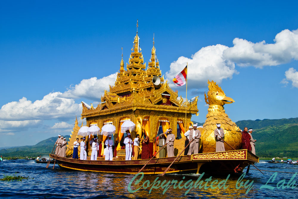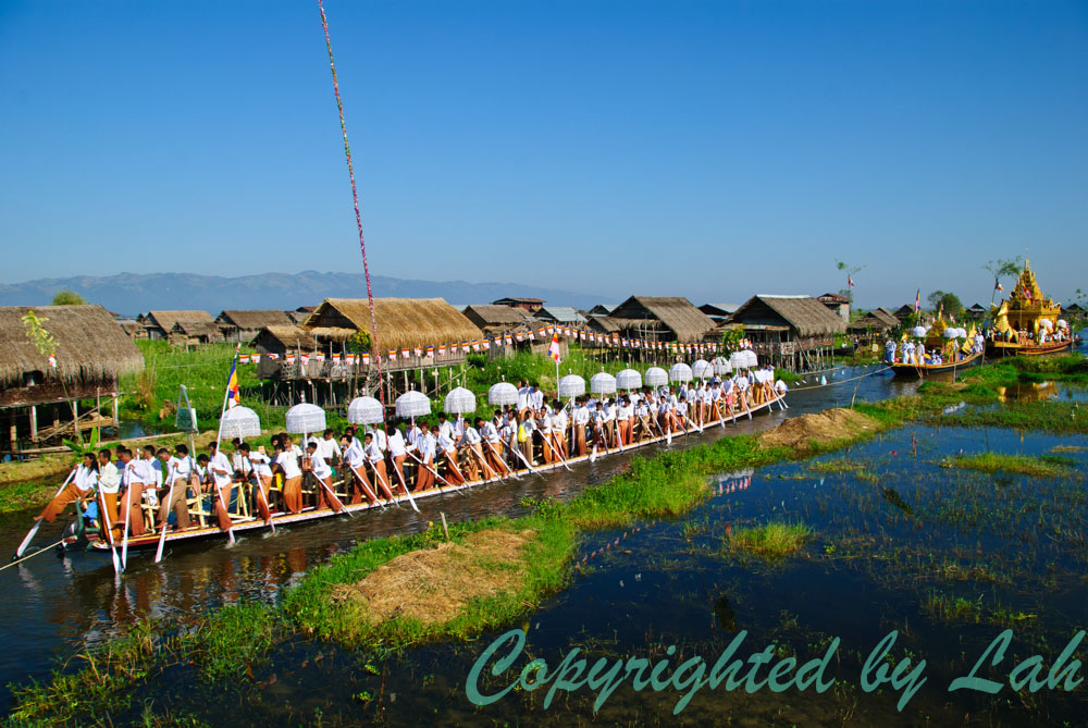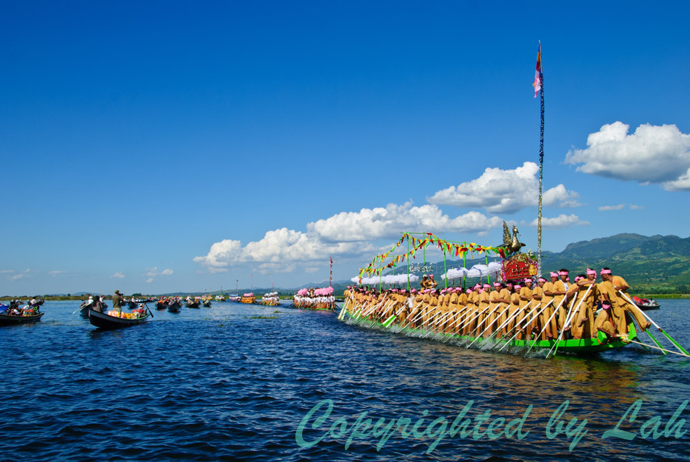 เช้าวันต่อมา ฉันไปลงเรือตามที่นัดหมายไว้แต่เช้า คนขับเรือพาเรือบึ่งไปตามลำน้ำ และเบาเครื่องเป็นระยะๆเมื่อผ่านชาวบ้านที่พายเรือลำเล็กๆใส่พานดอกไม้พร้อมเครื่องสักการะออกมาดักคอยนมัสการพระพุทธรูปศักดิ์สิทธิ์ที่จะแห่ผ่านมา ฉันมองผ่านคุณตา คุณยาย ผู้เฒ่าผู้แก่พร้อมลูกหลานตัวเล็กตัวน้อยบนเรืออย่างอิ่มเอิ่บใจ ทุกคนต่างมีสีหน้ายิ้มแย้มและยิ้มทักทายให้กับนักท่องเที่ยวอย่างพวกเราอย่างคนอารมณ์ดี งานบุญใหญ่แบบนี้ คงไม่มีใครอยากอยู่ในอารมณ์ครุ่นมัวเป็นแน่แท้ เมื่อเรือออกสู่ทะเลสาปอินเลอันกว้างใหญ่ คนขับเรือก็เร่งเครื่องพาบึ่งออกไปยังจุดหมายที่วัดอีกแห่งหนึ่งกลางทะเลสาปอันเป็นที่ประดิษฐานพระพุทธรูปเมื่อคืนวาน เมื่อใกล้ถึงที่หมาย ฉันเห็นเรือหลายสิบลำตั้งขบวนเรียงเป็นแถวไปตามลำน้ำ โดยมีเรือประธานลำใหญ่ตกแต่งเป็นรูปหงส์สีทองจอดเทียบท่าอยู่หน้าวัด แต่สิ่งที่น่าตื่นตาตื่นใจคือขบวนเรือไม้ลำยาวเรียวที่ตั้งขบวนกันมากกว่า ทุกลำมีเชือกผูกต่อกัน แต่ละลำอัดแน่นไปด้วยชาวบ้าน (เฉพาะผู้ชาย) จากแต่ละหมู่บ้านที่นำเรือมาช่วยในงานแห่ โดยแต่ละลำต่างตกแต่งตามสไตล์ของแต่ละหมู่บ้านโดยมีชาวฝีพายใส่เสื้อผ้ากางเกงเลที่มีสีสันแบบเดียวกันทั้งลำ นอกจากนี้บางลำยังมีนักดนตรีและเครื่องดนตรีพวกฆ้อง แตร อยู่กลางลำเรือ ทุกคนต่างยืนและใช้หน้าแข้งและเท้าจับพาย โดยที่เรือจะมีไม้ต่อเป็นราวจับสองราวเล็กๆตลอดลำเรือ เพื่อให้ชายเหล่านี้ใช้มือจับ ใช่แล้ว ขบวนแห่เรือนี้เป็นขบวนแห่เรือที่ใช้ขาและเท้าในการพายเรืออันเป็นที่เลื่องลือ เพื่อดึงลากเรือประธานที่ประดิษฐานพระพุทธรูปไปยังหมู่บ้านต่างๆรอบทะเลสาป โดยไม่มีการใช้แรงเครื่องยนต์แต่อย่างใด