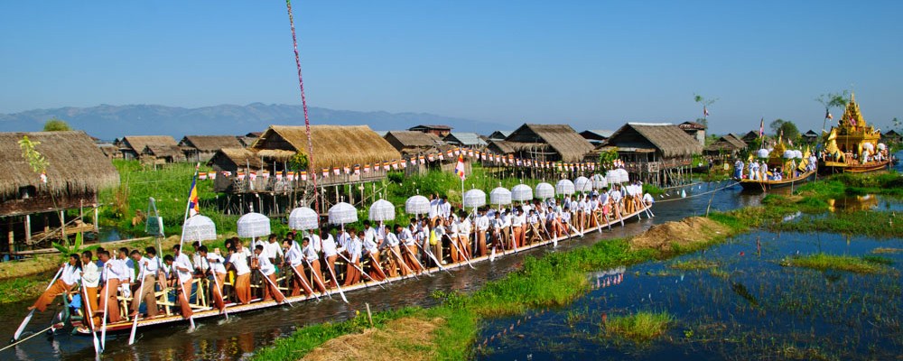 เช้าวันต่อมา ฉันไปลงเรือตามที่นัดหมายไว้แต่เช้า คนขับเรือพาเรือบึ่งไปตามลำน้ำ และเบาเครื่องเป็นระยะๆเมื่อผ่านชาวบ้านที่พายเรือลำเล็กๆใส่พานดอกไม้พร้อมเครื่องสักการะออกมาดักคอยนมัสการพระพุทธรูปศักดิ์สิทธิ์ที่จะแห่ผ่านมา ฉันมองผ่านคุณตา คุณยาย ผู้เฒ่าผู้แก่พร้อมลูกหลานตัวเล็กตัวน้อยบนเรืออย่างอิ่มเอิ่บใจ ทุกคนต่างมีสีหน้ายิ้มแย้มและยิ้มทักทายให้กับนักท่องเที่ยวอย่างพวกเราอย่างคนอารมณ์ดี งานบุญใหญ่แบบนี้ คงไม่มีใครอยากอยู่ในอารมณ์ครุ่นมัวเป็นแน่แท้ เมื่อเรือออกสู่ทะเลสาปอินเลอันกว้างใหญ่ คนขับเรือก็เร่งเครื่องพาบึ่งออกไปยังจุดหมายที่วัดอีกแห่งหนึ่งกลางทะเลสาปอันเป็นที่ประดิษฐานพระพุทธรูปเมื่อคืนวาน เมื่อใกล้ถึงที่หมาย ฉันเห็นเรือหลายสิบลำตั้งขบวนเรียงเป็นแถวไปตามลำน้ำ โดยมีเรือประธานลำใหญ่ตกแต่งเป็นรูปหงส์สีทองจอดเทียบท่าอยู่หน้าวัด แต่สิ่งที่น่าตื่นตาตื่นใจคือขบวนเรือไม้ลำยาวเรียวที่ตั้งขบวนกันมากกว่า ทุกลำมีเชือกผูกต่อกัน แต่ละลำอัดแน่นไปด้วยชาวบ้าน (เฉพาะผู้ชาย) จากแต่ละหมู่บ้านที่นำเรือมาช่วยในงานแห่ โดยแต่ละลำต่างตกแต่งตามสไตล์ของแต่ละหมู่บ้านโดยมีชาวฝีพายใส่เสื้อผ้ากางเกงเลที่มีสีสันแบบเดียวกันทั้งลำ นอกจากนี้บางลำยังมีนักดนตรีและเครื่องดนตรีพวกฆ้อง แตร อยู่กลางลำเรือ ทุกคนต่างยืนและใช้หน้าแข้งและเท้าจับพาย โดยที่เรือจะมีไม้ต่อเป็นราวจับสองราวเล็กๆตลอดลำเรือ เพื่อให้ชายเหล่านี้ใช้มือจับ ใช่แล้ว ขบวนแห่เรือนี้เป็นขบวนแห่เรือที่ใช้ขาและเท้าในการพายเรืออันเป็นที่เลื่องลือ เพื่อดึงลากเรือประธานที่ประดิษฐานพระพุทธรูปไปยังหมู่บ้านต่างๆรอบทะเลสาป โดยไม่มีการใช้แรงเครื่องยนต์แต่อย่างใด
