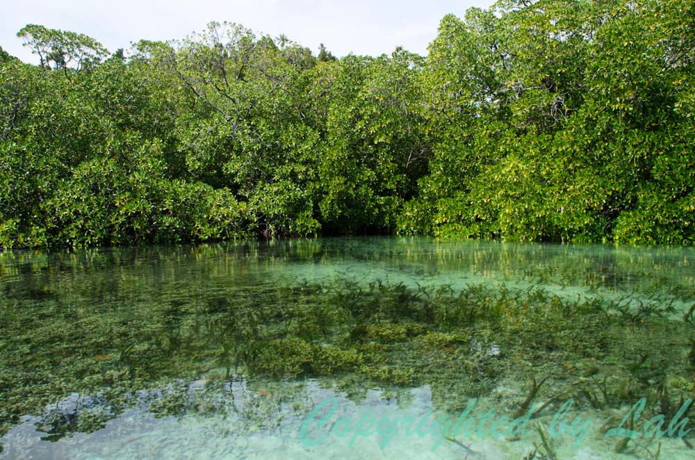 เกาะกัมมีขนาดใหญ่พอที่จะมีป่าผืนใหญ่ที่อุดมสมบูรณ์ในขณะที่น้ำทะเลรอบเกาะก็เต็มไปด้วยแนวปะการังที่หลากหลาย ฉันได้มีโอกาสนั่งเรือลัดเลาะชมป่าโกงกาง เลี้ยวเข้าอ่าวกัมอันกว้างใหญ่ที่ว่ากันว่ามีจระเข้น้ำเค็มอาศัยอยู่ด้วย บางครั้งก็ลงจากเรือปีนขึ้นเขาหินปูนอันแหลมคม เข้าไปชมถ้ำนกนางแอ่นและถ้ำค้างคาว ก่อนลงมานั่งเรือลัดเลาะน้ำทะเลสีเขียวมรกต ที่มีเกาะแก่งเป็นหย่อมๆกระจัดกระจายอยู่ทั่ว จุดหนึ่งที่ฉันชอบที่สุด คือเมื่อแล่นเรือเข้าไปในทางเล็กๆที่สองข้างเป็นเขาหินปูนสูงชัน น้ำตื้นใสแจ๋วมองเห็นพื้นทราย มีลูกปลากระเบนและฉลามที่ใช้บริเวณนี้เป็นที่พักพิง ว่ายตัดกันไปมาใต้ท้องเรือ พอเลี้ยวลัดมุมเขาเข้าไป ฉับพลันก็เหมือนกับตัวเองตกอยู่ในวงล้อมของขุนเขา มีน้ำทะเลเขียวมรกตนิ่งสงบเหมือนสระว่ายน้ำ มองขึ้นไปที่ป่าบนเขาก็มีนกแก้วหลากสีสัน นกกระตั้วสีขาว และนกอื่นๆ ร้องเสียงเซ่งแซ่ บินตัดไปตัดมา “นี่มันสวรรค์ชัดๆ!” ฉันเขียนลงในสมุดบันทึกของฉันไว้เช่นนี้ จุดสวยงามรอบๆเกาะยังมีอีกหลายจุดที่ฉันบรรยายไม่ถูก ต้องไปเห็นกันเองด้วยตาตัวเองเท่านั้น ฉันนั่งเรือเลาะชมความงามรอบทั้งเกาะ แวะพักจุดที่มีน้ำจืดสนิทที่เป็นน้ำที่ไหลมาจากป่าที่โฮมสเตย์ปลีกวิเวกแห่งหนึ่ง ตรงช่องแคบคาบุย (Kabui) ซึ่งอยู่ระหว่างเกาะกัมและเกาะไวเกียว โฮมสเตย์แห่งนี้สร้างเป็นแพอยู่ริมน้ำ ล้อมรอบด้วยเกาะเขาหินปูนใหญ่น้อยกระจัดกระจายอยู่ในทะเลตรงหน้า จุดเด่นคือน้ำจืดสนิทที่เจ้าของต่อมาจากลำธารในป่าซึ่งเป็นความพิเศษที่หาได้ยาก สำหรับชีวิตบนเกาะที่ปกติมีแต่น้ำบาดาลกร่อยๆให้ใช้ตลอดเวลา