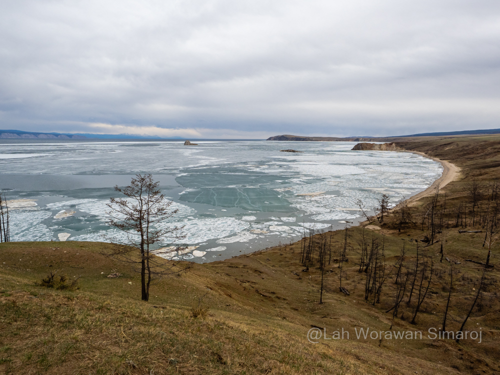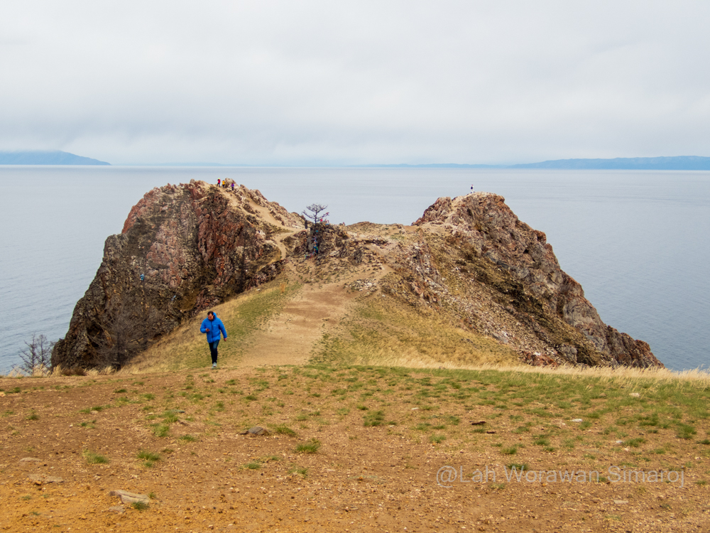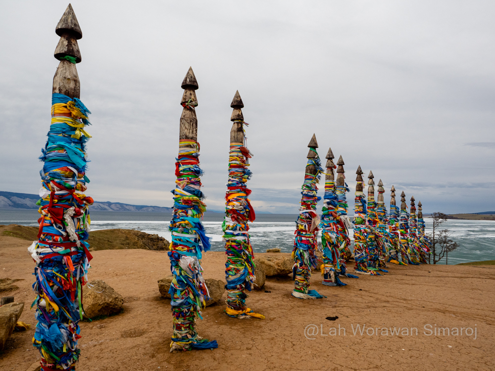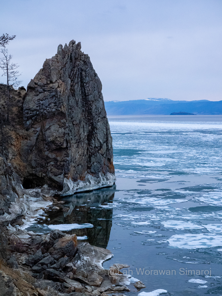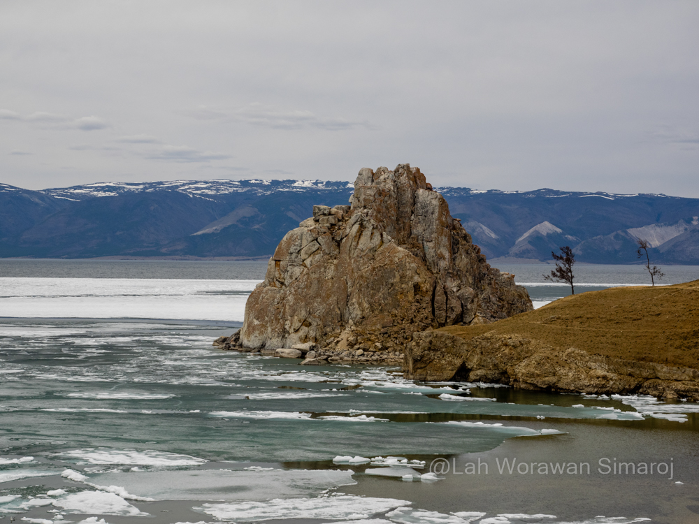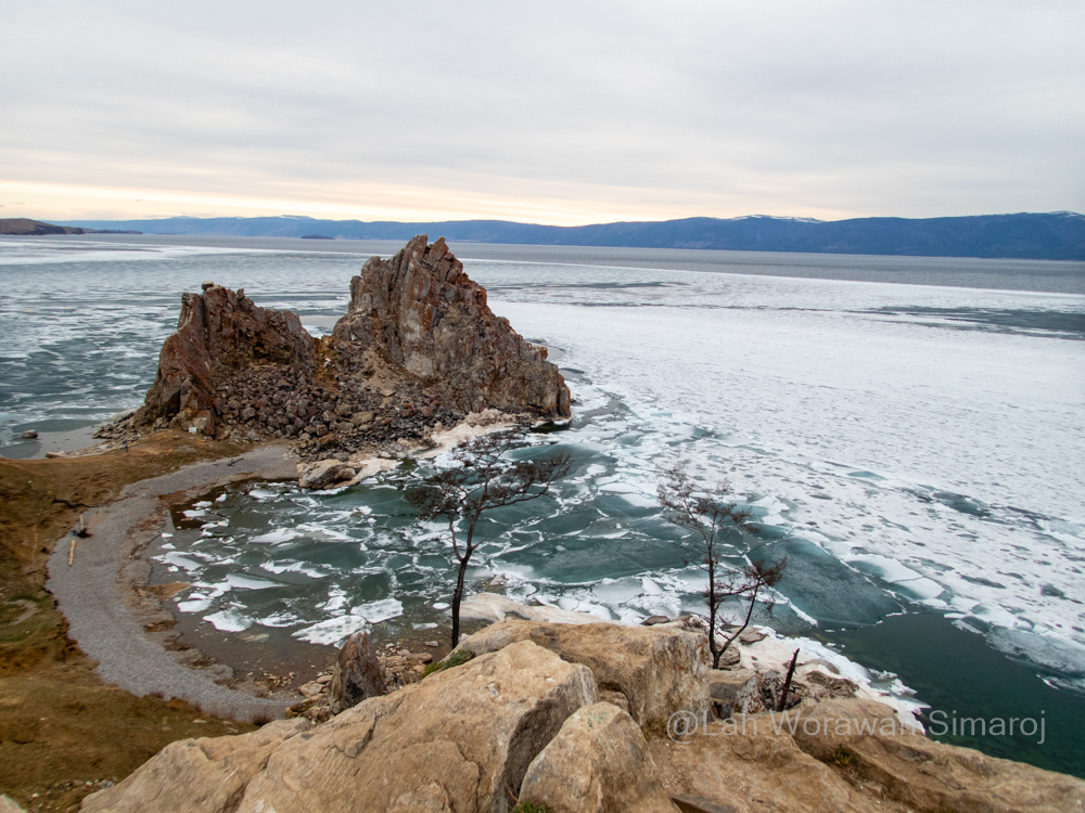 เนื่องจากมาถึงเอาเย็นย่ำ เมื่อแวะเก็บของเข้าห้องพักได้ไม่นาน พวกเราเลยรีบออกไปชมสถานที่ศักดิ์สิทธิ์ของชาว Buryat (ชาวพื้นเมืองเชื้อสายมองโกลที่อาศัยอยู่ในไซบีเรีย) ที่เรียกว่า Shamanka หรือ Shaman Rock กันก่อนที่พระอาทิตย์จะตกดิน กองหินขนาดใหญ่ริมทะเลทางด้านตะวันตกของเกาะใกล้ๆ กับหมู่บ้าน Khuzhir ที่แหลม Burkhan (เบอร์ข่าน) แห่งนี้ ได้ชื่อว่าเป็นหนึ่งในสถานที่ศักดิ์สิทธิ์แห่งหนึ่งของชาวพุทธฯ และเหล่า Shaman แห่ง Buryat ที่นี่เป็นสถานที่ประกอบพิธีกรรมอันศักดิ์สิทธิ์ของชาวพื้นเมืองมาตั้งแต่อดีตเป็นพันๆปีก่อนที่ตัวเกาะจะเป็นที่รู้จักของคนนอกอย่างเช่น ชาวโคแซ็ก (รัสเซีย) ที่ข้ามมาถึงเกาะครั้งแรกในช่วงกลางศตวรรษที่ 17 ซึ่งในปัจจุบัน Shaman Rock แห่งนี้ถือเป็นสถานที่ท่องเที่ยว Landmark ของเกาะที่ใครๆก็ต้องมาถ่ายรูป ในช่วงที่ฉันไปเป็นช่วงกลางเดือนพฤษภาคม น้ำแข็งในทะเลสาบไบคาลยังละลายไปไม่หมด ยังคงเห็นเหลือเป็นแผ่นๆลอยเป็นแพอยู่ริมในทะเลสาบริมหาด ก่อให้เกิดทัศนียภาพที่แปลกตาเป็นอย่างยิ่ง แน่นอนว่า อากาศก็หนาวเย็นเป็นอย่างยิ่งเช่นกัน โดยเฉพาะเมื่อมีลมพัดแรงและแสงอาทิตย์ลับขอบฟ้าไปแล้ว บริเวณใกล้ๆกับ Shaman Rock จะมีเสาศักดิ์สิทธิ์ที่ผู้นับถือผูกผ้าหรือธงมนต์สีสันสดใสเรียงกันเป็นแถว เพื่อแสดงการศักการะเทพเจ้า และภูติผีที่ปกปักษ์รักษาผืนดินแห่งนี้ คล้ายประเพณีที่พบเห็นได้ทั่วไปในมองโกลเลียและทิเบต รวมถึงในไซบีเรียตะวันออกแห่งนี้ที่มีพื้นที่เชื่อมต่อหล่อหลอมวัฒนธรรมที่คล้ายคลึงกัน