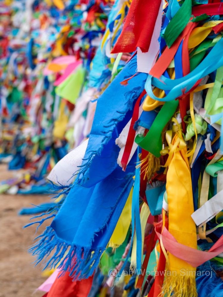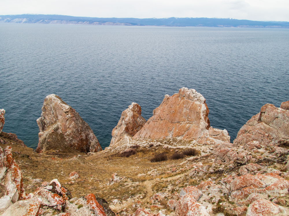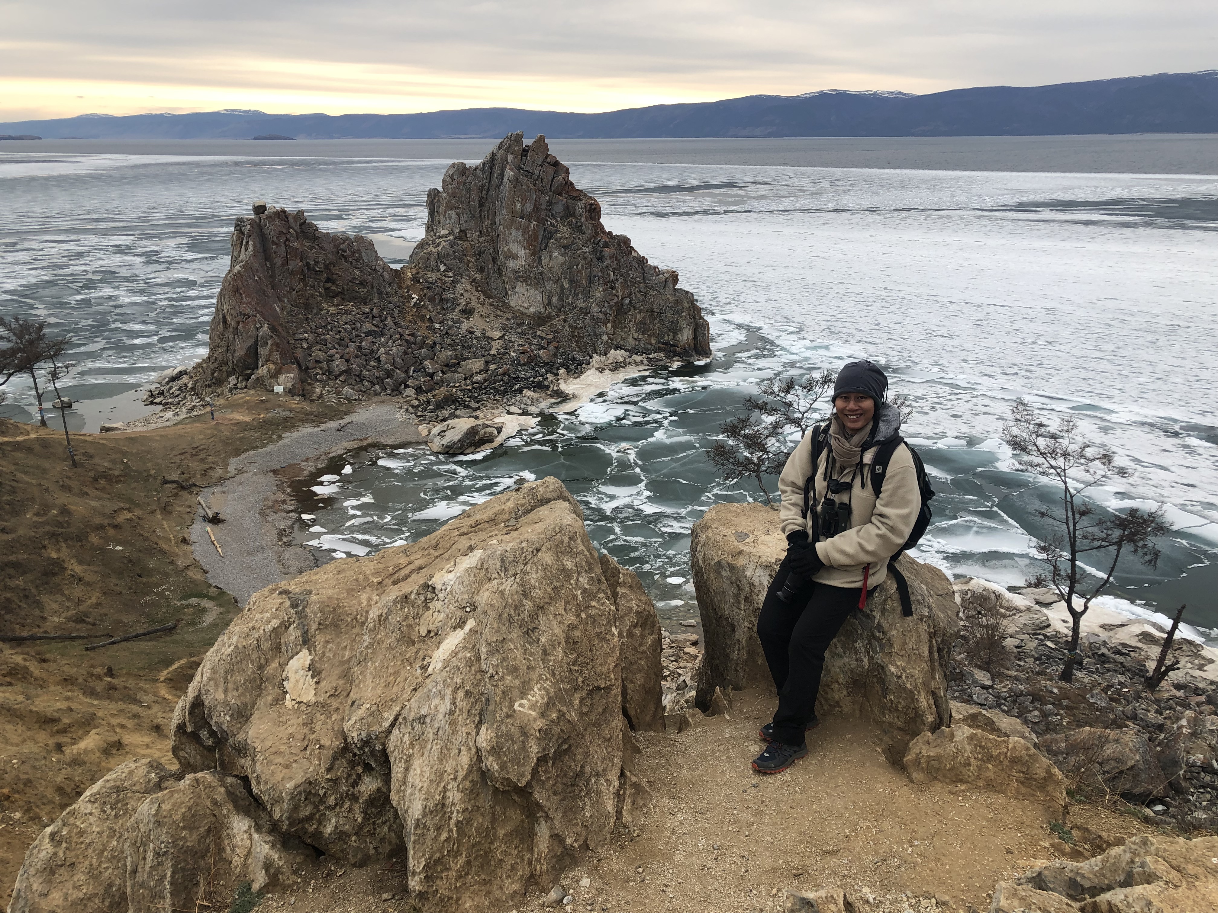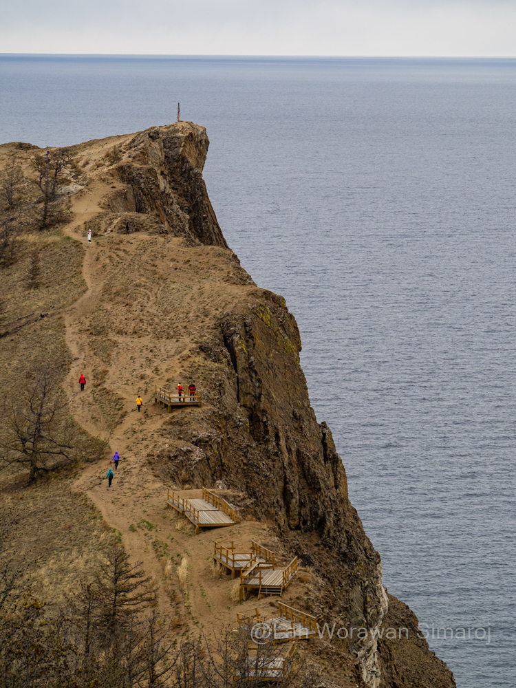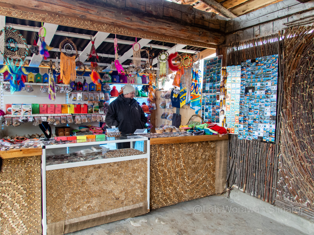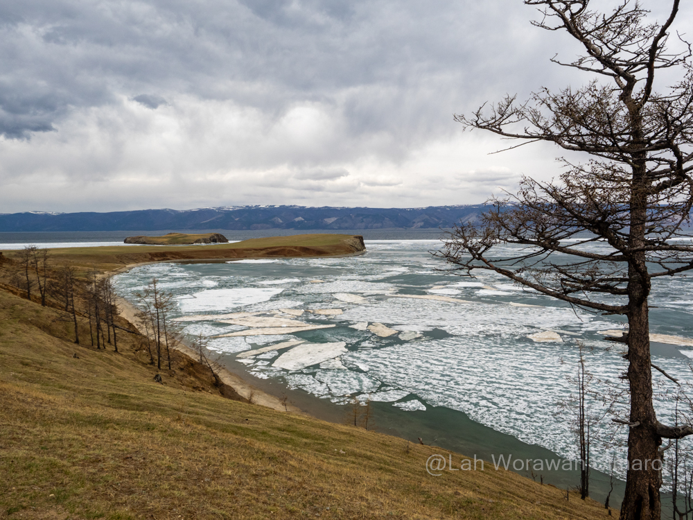 เนื่องจากมาถึงเอาเย็นย่ำ เมื่อแวะเก็บของเข้าห้องพักได้ไม่นาน พวกเราเลยรีบออกไปชมสถานที่ศักดิ์สิทธิ์ของชาว Buryat (ชาวพื้นเมืองเชื้อสายมองโกลที่อาศัยอยู่ในไซบีเรีย) ที่เรียกว่า Shamanka หรือ Shaman Rock กันก่อนที่พระอาทิตย์จะตกดิน กองหินขนาดใหญ่ริมทะเลทางด้านตะวันตกของเกาะใกล้ๆ กับหมู่บ้าน Khuzhir ที่แหลม Burkhan (เบอร์ข่าน) แห่งนี้ ได้ชื่อว่าเป็นหนึ่งในสถานที่ศักดิ์สิทธิ์แห่งหนึ่งของชาวพุทธฯ และเหล่า Shaman แห่ง Buryat ที่นี่เป็นสถานที่ประกอบพิธีกรรมอันศักดิ์สิทธิ์ของชาวพื้นเมืองมาตั้งแต่อดีตเป็นพันๆปีก่อนที่ตัวเกาะจะเป็นที่รู้จักของคนนอกอย่างเช่น ชาวโคแซ็ก (รัสเซีย) ที่ข้ามมาถึงเกาะครั้งแรกในช่วงกลางศตวรรษที่ 17 ซึ่งในปัจจุบัน Shaman Rock แห่งนี้ถือเป็นสถานที่ท่องเที่ยว Landmark ของเกาะที่ใครๆก็ต้องมาถ่ายรูป ในช่วงที่ฉันไปเป็นช่วงกลางเดือนพฤษภาคม น้ำแข็งในทะเลสาบไบคาลยังละลายไปไม่หมด ยังคงเห็นเหลือเป็นแผ่นๆลอยเป็นแพอยู่ริมในทะเลสาบริมหาด ก่อให้เกิดทัศนียภาพที่แปลกตาเป็นอย่างยิ่ง แน่นอนว่า อากาศก็หนาวเย็นเป็นอย่างยิ่งเช่นกัน โดยเฉพาะเมื่อมีลมพัดแรงและแสงอาทิตย์ลับขอบฟ้าไปแล้ว บริเวณใกล้ๆกับ Shaman Rock จะมีเสาศักดิ์สิทธิ์ที่ผู้นับถือผูกผ้าหรือธงมนต์สีสันสดใสเรียงกันเป็นแถว เพื่อแสดงการศักการะเทพเจ้า และภูติผีที่ปกปักษ์รักษาผืนดินแห่งนี้ คล้ายประเพณีที่พบเห็นได้ทั่วไปในมองโกลเลียและทิเบต รวมถึงในไซบีเรียตะวันออกแห่งนี้ที่มีพื้นที่เชื่อมต่อหล่อหลอมวัฒนธรรมที่คล้ายคลึงกัน