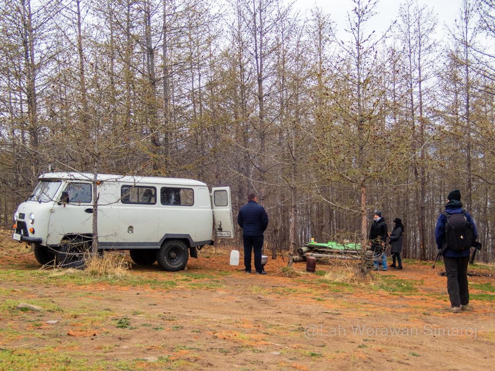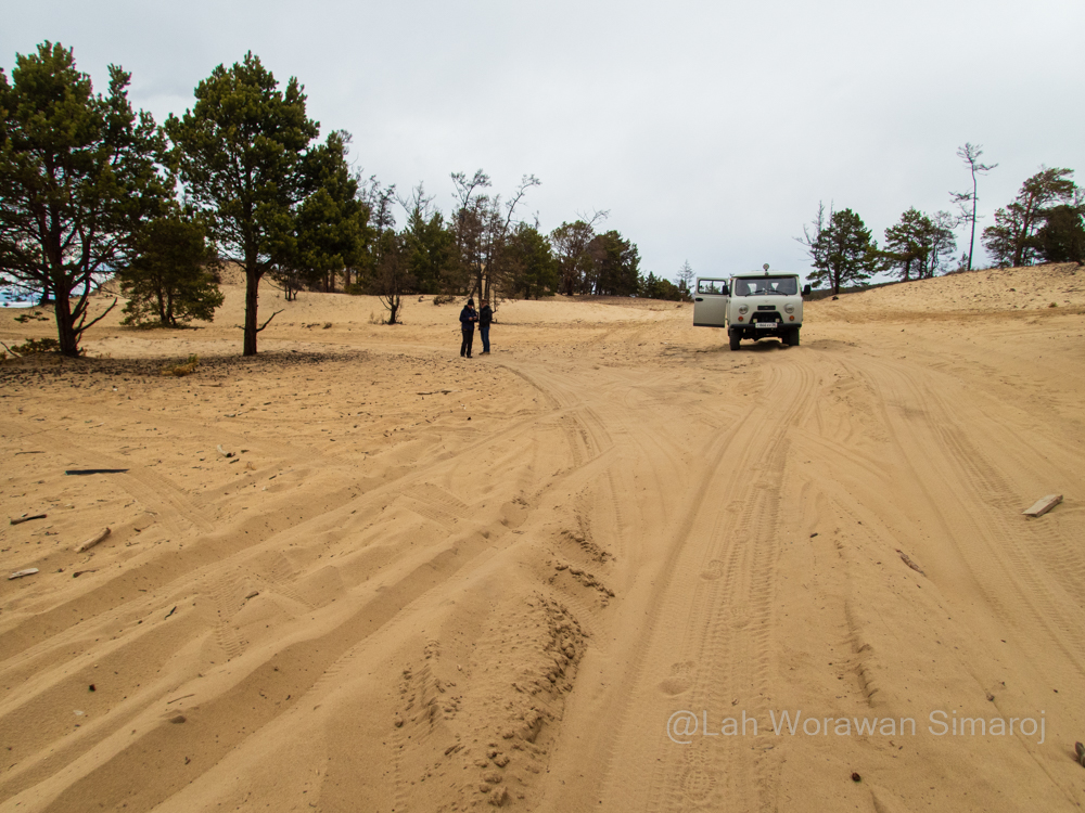 อีกหนึ่งไฮไลท์ของการมาเที่ยวที่เกาะนี้คือการใช้เวลาอีกหนึ่งวันเต็มๆ ในการนั่งรถตู้รัสเซียตะลุยทางเหนือของเกาะ Olkhon ซึ่งเป็นที่ตั้งของ Pribaikalsky Nature Reserve (เขตสงวนธรรมชาติพรีไบคาลสกี้) อันเป็นส่วนหนึ่งของอุทยานแห่งชาติไบคาล โดยหยุดแวะจ่ายค่าเข้าอุทยานฯที่สำนักงานในเมืองก่อน จากนั้นก็ค่อยๆลุยขึ้นเหนือผ่านป่าสนไปแวะจุดชมวิวแรกที่หมู่บ้านเล็กๆอีกแห่งหนึ่ง ที่นี่มีทัศนียภาพที่สวยงามมากๆ โตรกหน้าผาสีน้ำตาลตัดกับน้ำแข็งบนทะเลสาบ มองเห็นวิวออกไปกว้างไกลแบบพานอราม่า จากนั้นก็ไปต่อโดยหยุดแวะชมวิวถ่ายรูปเป็นจุดๆ เนื่องจากเส้นทางผ่านด้วยภูมิประเทศที่หลากหลาย ทั้งทุ่งหญ้ากว้างใหญ่แบบมองโกลเลีย ป่าสนไทก้า (Taiga) ที่มีต้นสนที่เรียกว่าลาร์ช (Larch) เป็นพืชเด่น ป่าต้นเบิร์ช (Birch) ทะเลทรายแบบเห็นเป็น Sand Dune ริมชายฝั่ง ทุ่งหญ้าสเต็ปป์ และภูเขาทุ่งหญ้าโล้นๆที่เห็นภูมิทัศน์กว้างไกล คนขับจะพาแวะตามจุดชมวิวต่างๆ เช่น Three Brothers Rocks แท่งหินขนาดใหญ่สามก้อนริมหน้าผา ที่มีตำนานประมาณว่าสามพี่น้องมีพ่อเป็นพ่อมดหมอผี แปลงลูกชายให้เป็นนกอินทรีย์อิสระเริงร่าอยู่ดีๆ ลูกชายดันผิดวาจาที่ให้ไว้กับพ่อ เลยถูกสาปให้เป็นก้อนหินสามก้อนแทน หรือชมภูมิทัศน์แบบ Sand Dune ที่ใกล้ๆหมู่บ้าน Peschanaya (เพสชานาย่า) ที่แต่เดิมเคยเป็นโรงงานผลิตปลากระป๋องมีคนงานเป็นนักโทษการเมืองสมัยโซเวียตยูเนี่ยน (ที่เรียกกันว่า Gulag) และจุดชมวิวต่างๆไปจนถึงจุดเหนือสุดที่แหลม Khoboy (คอบอย) แปลว่า “เขี้ยว” เพราะหน้าผาสุดปลายแหลมมีรูปร่างเหมือนเขี้ยวสัตว์ โดยจะมีเวลาให้เดินชมวิวไปจนสุดปลายแหลม ก่อนเดินกลับมาที่จุดนัดปิคนิคกินข้าวเที่ยงกันในป่าสน โดยคนขับรถของพวกเรานี่เองเป็นคนหุงหาจัดเตรียมอาหารไว้ให้ ซึ่งเมนูเด่นก็คือซุปร้อนๆที่ใช้ปลาจากทะเลสาบสดๆมาทำ
