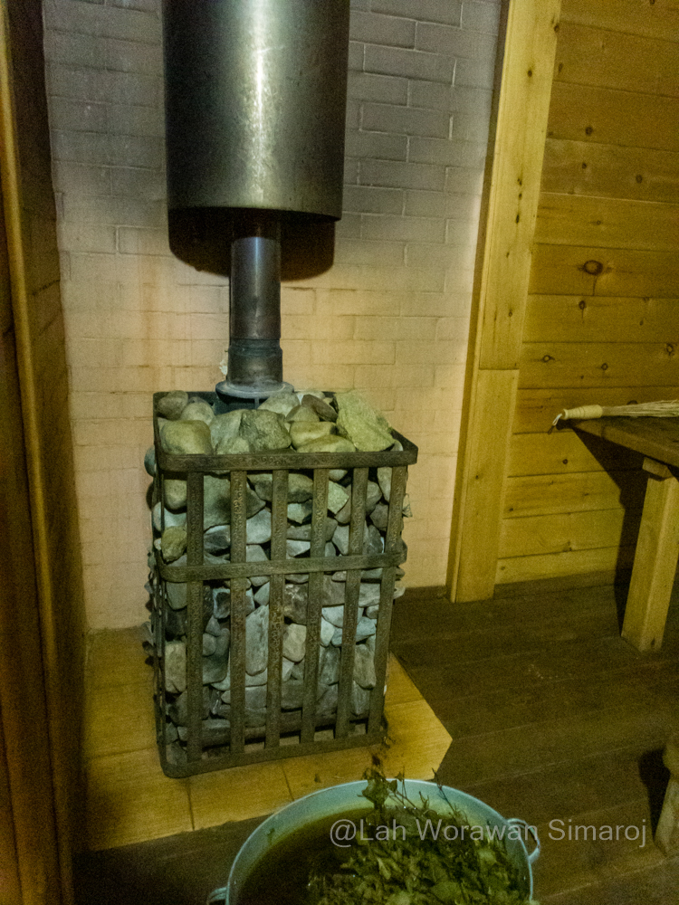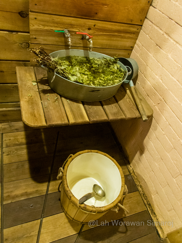 ท่ามกลางอากาศที่หนาวเหน็บแบบนี้ จะให้ดีคือการได้เข้าไปอาบน้ำ/อบตัวในโรงอาบน้ำรวมแบบรัสเซีย ที่เรียกกันว่า Banya (บานญา) แม้ว่าในห้องพักจะมีน้ำฝักบัวร้อนๆให้อาบก็ตาม โชคดีที่ที่พักของพวกเรามีบานญาเป็นของตัวเอง พวกเราเลยจองโรงอาบน้ำไว้ตั้งแต่มาถึงก่อนออกไปเดินเล่น เพราะเขาต้องใช้เวลาในการจัดการเตรียมบานญาให้พวกเรานานโขอยู่ ณ จุดนี้ เรามาทำความเข้าใจกันก่อนดีกว่าว่าบานญาคืออะไร แล้วต้องทำอย่างไรกันบ้างเวลาเข้าไป… Banya (บานญา) เป็นชื่อเรียกการอาบน้ำแบบรัสเซียซึ่งมีวัฒนธรรมที่สืบทอดกันมายาวนาน เนื่องจากเป็นประเทศที่มีอากาศหนาวเย็น ในภาษาอังกฤษจะใช้คำว่า Russian Spa หรือไม่ก็ Sauna โดยมีห้องอบตัวที่ทำให้ร้อนจัด (บางทีก็ถึง 100 องศา) ด้วยเตาก่อหินใช้ถ่านไม้ มีห้องอาบน้ำราดน้ำเย็นหลังเข้าอบตัว และห้องเปลี่ยนเสื้อผ้าด้านนอกสุด รวมถึงห้องสังสรรระหว่างนั่งพักรออบตัวรอบต่อไป โดยจะมีโต๊ะยาวเก้าอี้ไว้นั่งคุย และที่สำคัญมีชาให้จิบระหว่างนั้น โดยการเข้า Banya นั้นจะเข้ากันเป็นกลุ่ม/ครอบครัว ถอดเสื้อผ้าออกหมด โดยจะมีผ้าชีทให้คลุม/ห่อตัวเวลานั่งอบในห้องหลายๆคนพร้อมกัน เมื่อรู้สึกร้อนมากเหงื่อไหลไคลย้อย ก็จะออกมาราดน้ำเย็นที่ห้องอาบน้ำด้านนอก ออกมานั่งจิบชา คุยโขมงโฉงเฉงกันไป ใครอยากเข้าอบตัวใหม่อีกรอบก็ตามสบาย แต่พิธีกรรมที่สำคัญคือการเรียงคิวเข้ารับการเฆี่ยน หรือ Paritsya (แปลตามตัวคือการนำความร้อนเข้าร่างกาย)…จริงๆก็คือการฟาดตัวด้วยอุปกรณ์สำคัญคือกิ่งใบไม้ของต้น Birch (เบิร์ช) หรือใบต้น Oak (โอ๊ค) แล้วแต่จะหาได้ในพื้นที่มัดรวมกัน เรียกว่า Venik (เวอร์นิค) โดยคนฟาดจะราดน้ำลงบนหินร้อนของเตาเพื่อให้เกิดไอร้อนในห้องยิ่งขึ้น เอา Venik แช่น้ำจนชุ่ม แล้วสบัดน้ำจากใบไม้พรมลงบนหลังก่อนฟาดใบไม้ไปตามตัวของผู้ที่ถูกฟาดที่นอนรออยู่ (โดยก่อนหน้านี้ ผู้ถูกฟาดจะถอดผ้าห่อตัวมาวางบนเก้าอี้ยาวในห้องอบ (กันร้อนจากเก้าอี้) แล้วนอนเปลือยราบลงไปรอรับการฟาด) กลิ่นน้ำมันหอมระเหยอ่อนๆจากใบไม้จะโชยเข้ามาในจมูก พร้อมทั้งซึมซาบเข้าสู่ร่างกายจากการถูกฟาด สักพัก ก็ออกมาอาบน้ำสระผมให้เรียบร้อย นั่งสังสรร รอคนอื่นๆในกลุ่มผ่านการถูกเฆี่ยนจนครบ…อ้อ ทุกคนควรต้องใส่หมวกผ้าสักหลาดเพื่อคลุมศีรษะเวลาเข้าห้องอบ เพื่อกันศีรษะไม่ให้ร้อนจนเกินไปด้วย!…พวกเราใช้เวลาเกือบๆ 2 ชั่วโมงสำหรับกลุ่ม 4-5 คนในพิธีกรรมการอาบน้ำแบบนี้ หลังผ่าน Banya รูขุมขนจะเปิดกว้าง ตัวแดงก่ำ (ไม่ควรดื่มแอลกอฮอล์ระหว่างช่วงสังสรรรอ แต่ควรจิบชาร้อน ช่วยผ่อนคลาย) แต่