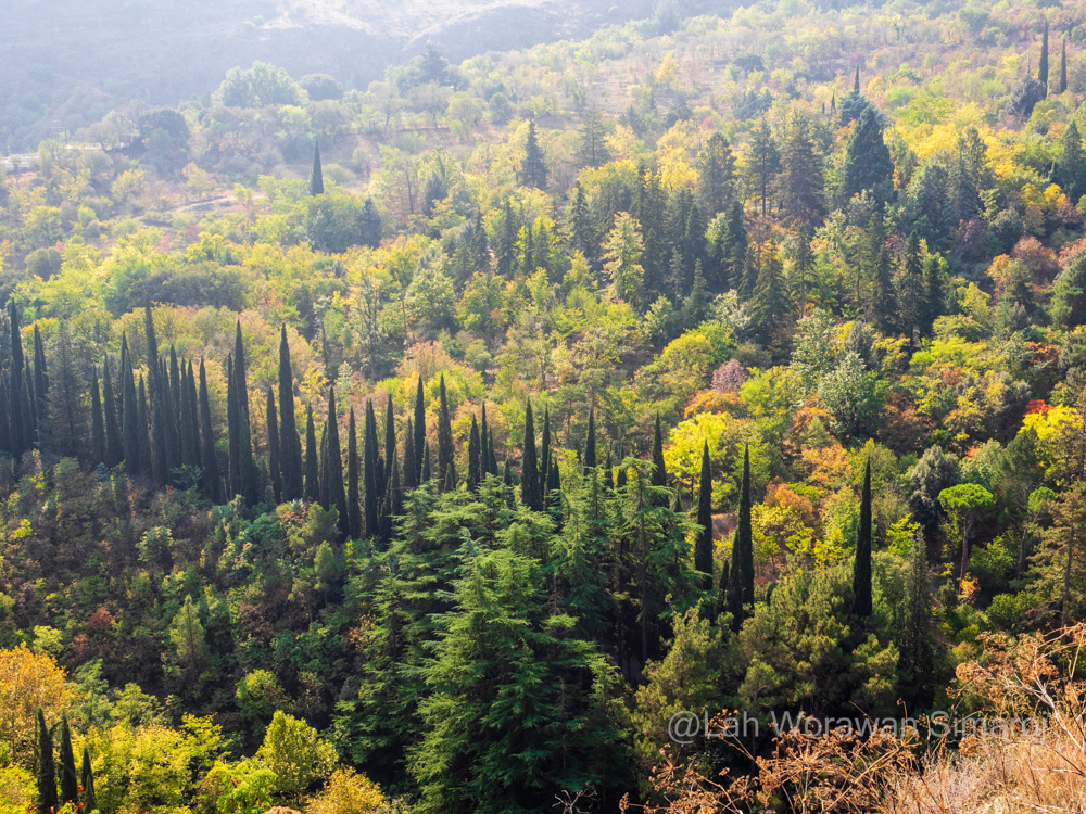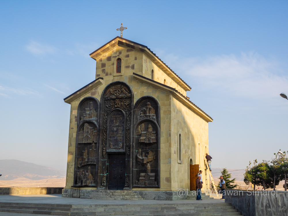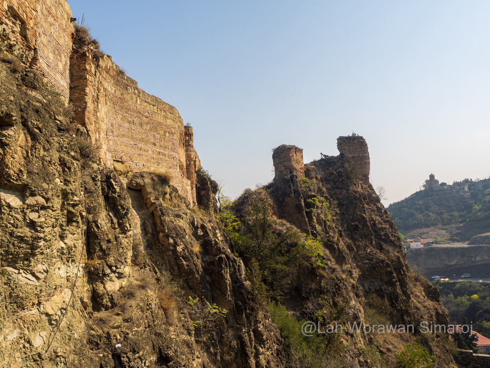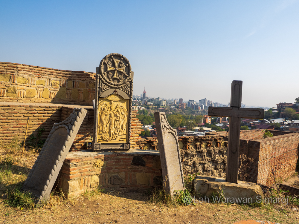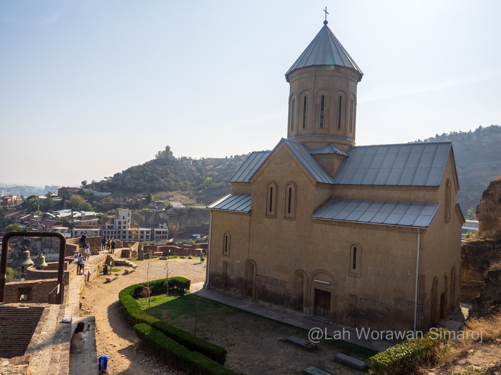 ด้วยเหตุนี้ ฉันจึงเลือกที่จะกลับมาเดินข้ามสะพานในช่วงเย็นเพื่อดูแสงสี โดยหันหน้าเดินไปสถานีขึ้นรถกระเช้า Cable Car ที่อยู่ไม่ห่างออกไปนักแทน กระเช้าพาข้ามแม่น้ำและเมืองเก่าเพื่อขึ้นไปยังแนวสันเขา Sololaki (โซโลลาคี) เพื่อเดินชมโบราณสถานบริเวณป้อมปราการ Narikala (นาริคาลา) ซึ่งสร้างขึ้นมาหลายยุคหลายสมัย ส่วนที่เก่าแก่ที่สุดย้อนกลับไปถึงคริสตศตวรรษที่ 4 เมื่อเปอร์เซียเข้าปกครอง แต่ร่องรอยที่เห็นส่วนใหญ่จะสร้างในสมัยคริสตศตวรรษที่ 8 โดยชาวอาหรับที่มีการสร้างปราสาทขึ้นภายในป้อมปราการแห่งนี้ จากจุดนี้สามารถมองเห็นเมือง Tbilisi ทางด้านล่างได้อย่างสวยงาม มีร้านขายของที่ระลึกขายมากมาย มีร้านกาแฟให้นั่งชิลล์ๆริมหน้าผาชมเมืองได้อีก นอกจากนี้ยังเป็นที่ตั้งของรูปปั้นที่มีโครงสร้างเป็นไม้ปิดทับด้วยอลูมิเนียมขนาดใหญ่สูง 20 เมตรที่เรียกกันว่า Monument of Mother of Georgia (Kartlis Deda-Mother of Kartli) สร้างขึ้นในปี ค.ศ. 1958 เพื่อเฉลิมฉลองครบรอบ 1,500 ปีของเมือง Tbilisi โดยทำเป็นรูปหญิงสาวในชุดพื้นเมืองของจอร์เจียตั้งตระหง่านอยู่ริมหน้าผามองออกไปยังตัวเมืองหลวง มือซ้ายถือถ้วยไวน์เพื่อต้อนรับผู้คนที่มาเยือนเยี่ยงมิตร และมือขวาถือดาบสำหรับผู้คนที่เข้ามาเยี่ยงศัตรู ส่วนอีกด้านหนึ่งของแนวเทือกเขาจะเป็นที่ตั้งของสวนพฤกษศาสตร์แห่งจอร์เจีย National Botanical Garden of Georgia ซึ่งตรงนี้มี Zipline ให้เล่นลงไปด้วย แต่ฉันเลือกเดินตามทางเทรลคดเคี้ยวที่เลาะลงเขาด้านตัวเมืองผ่านไปยังโบสถ์ St. Nicolas (เซนต์นิโคลัส) โบสถ์ศาสนาคริสต์นิกายออโธด็อกส์ตะวันออก ศาสนานิกายหลักของชาวจอร์เจีย ตัวอาคารที่เห็นในปัจจุบันเป็นรูปทรงไม้กางเขนสร้างขึ้นใหม่ช่วงปี ค.ศ. 1996-1997 ตรงบริเวณตัวโบสถ์เดิมตั้งแต่สมัยคริสตศตวรรษที่ 13 ที่ถูกไฟไหม้ไป ภายในโบสถ์มีภาพเขียนสีเล่าเรื่องราวประวัติศาสตร์ของเมืองและคริสตศาสนา ภายนอกยังสามารถพบเห็นซากหรือโบราณวัตถุของตัวโบสถ์เดิมวางอยู่ด้วย