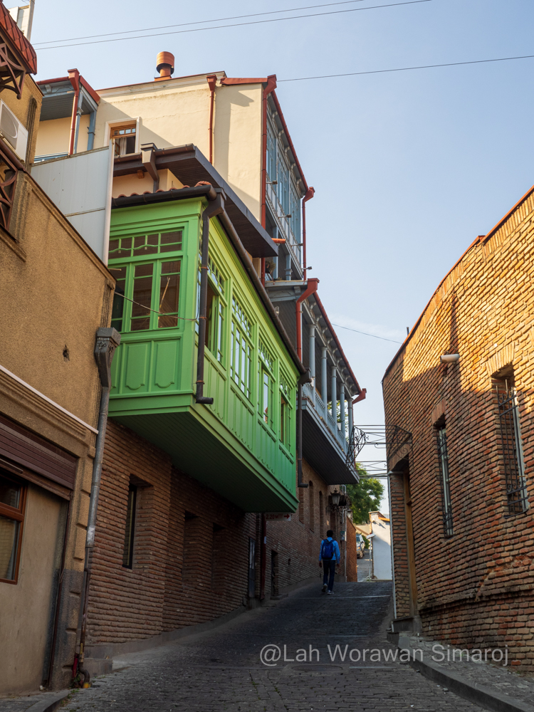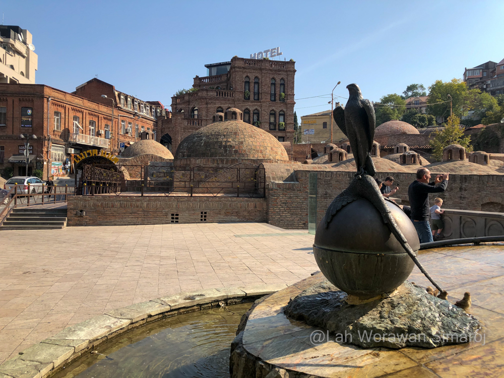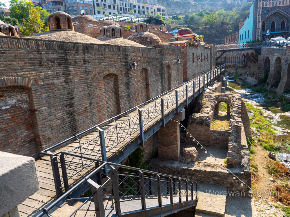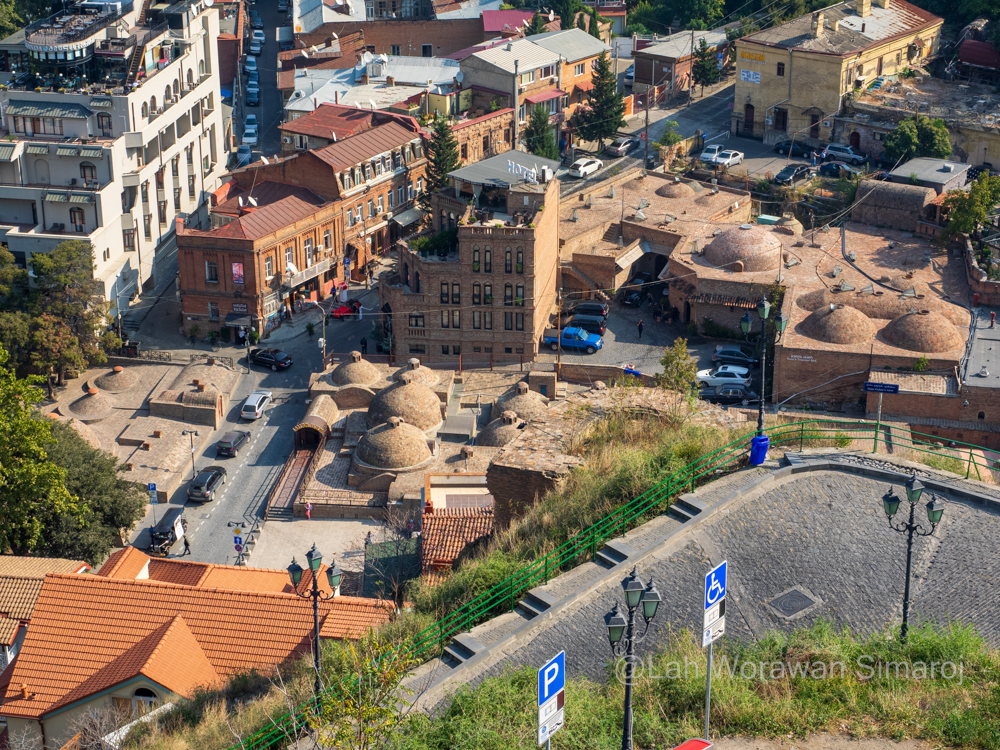 เมื่อทางเทรลเชื่อมต่อมาที่ถนนสายแคบๆชันๆลงจากเขา (สำหรับคนที่อยากเดินขึ้นไปป้อมปราการโดยไม่นั่งกระเช้าก็จะเดินขึ้นทางนี้ได้) ก็จะมีร้านรวงสองข้างทางให้ได้แวะช้อปปิ้งได้ตลอด รวมไปถึงมุมสวยๆแปลกตากับตึกเก่าๆสองข้างทาง บางหลังทาสีพาสเทลสวยงาม พอลงมาถึงทางราบก็เลี้ยวต่อไปดู Sulphur Baths โรงอาบน้ำแร่กำมะถันโบราณที่บางแห่งยังคงดำเนินกิจการมาจนถึงปัจจุบัน โดยจะมองเห็นเป็นโดมอิฐก่อกลมๆมีปล่องเป็นจุกๆ เพื่อให้แสงส่องลงไปถึงด้านในและเป็นช่องระบายไอน้ำจากน้ำแร่ เหตุที่มีโรงอาบน้ำตั้งอยู่บริเวณที่เรียกว่า Abanotubani (อาบาโนทุบานี) แปลว่า “ย่านโรงอาบน้ำแร่” นี้เพราะเป็นจุดที่เจอน้ำแร่ผุดออกมาในลำธารบริเวณนั้น โดยมีกล่าวถึงในตำนานก่อตั้งเมืองว่าในช่วงปลายคริสศตวรรษที่ 5 กษัตริย์ Vakhtang Gorgasali (วาคตัง จอร์กาซาลี) ได้พาเหยี่ยวออกมาล่าสัตว์ และเหยี่ยวได้บินไปพยายามจับไก่ฟ้าในป่าแถบนี้และผลัดตกลงไปในน้ำแร่ที่ผุดขึ้นมาแถวบริเวณนี้ กษัตริย์เกิดความประทับใจในสิ่งมหัศจรรย์ทางธรรมชาติแห่งนี้เลยก่อตั้งเมือง Tbilisi ขึ้นที่นี่ (เดิมชื่อ Tiflis (ทิฟลิส) ซึ่งชื่อเมืองแปลว่า “สถานที่อันอบอุ่น” แม้ว่าโดมหัวจุกเหล่านี้จะตั้งเรียงรายอยู่รวมๆกัน แต่ถ้าอยากแวะดูประวัติศาสตร์ก็คงต้องลองไปเดินหา Royal Bath ที่ประตูมีสัญลักษณ์ของนกเหยี่ยวและไก่ฟ้าตามตำนานของเมืองประดับอยู่ แต่ถ้าจะดูที่ความสวยงามทันสมัยก็คงต้องแวะไปที่ Orbeliani Bath (โรงอาบน้ำออร์เบลิอานี) ที่เป็นอาคารสมัยใหม่ที่มีด้านหน้าตกแต่งอย่างสวยงามน่าเข้า (การอาบน้ำแร่ของจอร์เจียจะคล้ายๆของญี่ปุ่น คือเข้าไปแช่ในบ่อน้ำแร่ แยกหญิงชายสำหรับโรงอาบน้ำรวม หรือจะสามารถเช่าห้องเป็นส่วนตัวก็ได้ แต่จะมีความคล้ายกับโรงอาบน้ำของตุรกีตรงที่สามารถเรียกคนเข้าไปขัดตัวให้ได้)