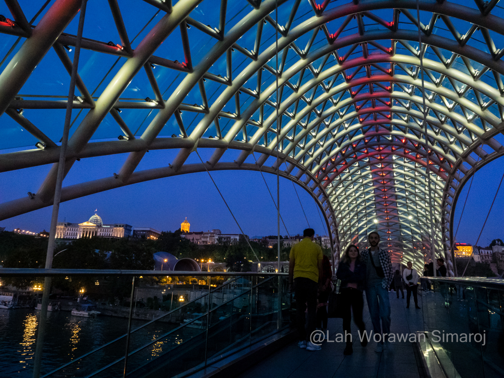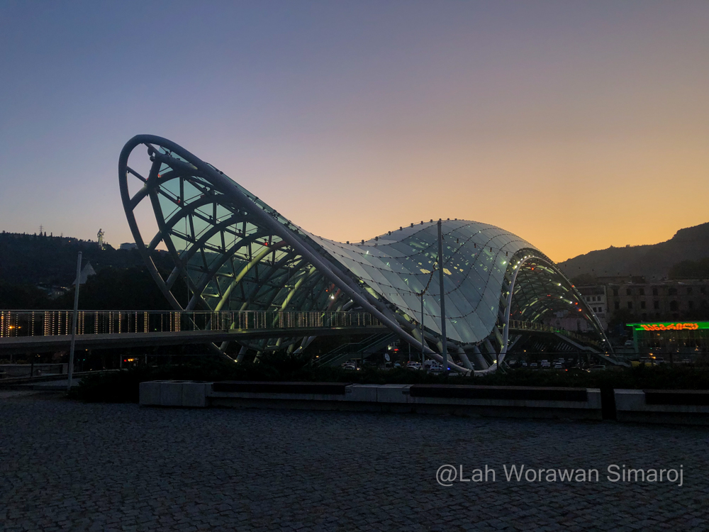 ฉันเริ่มต้นจากการเดินออกจากที่พักในอีกฟากแม่น้ำของเมืองเก่าไปยัง Rike Park ซึ่งเป็นพื้นที่สวนจัดขนาดใหญ่ว่ากันว่าตัวสวนทำเป็นรูปร่างของประเทศจอร์เจียเองและทางเดินต่างๆเหมือนกับเส้นแบ่งเขตของภูมิภาคต่างๆของจอร์เจีย (หากมองจากด้านบนลงมา) มีสนามเด็กเล่น สวนดอกไม้ และบริเวณให้ทำกิจกรรมนันทนาการต่างๆ รวมถึงมีคอนเสิร์ตฮอลล์รูปทรงทันสมัยเหมือนเป็นท่องวงสองงวงต่อกันเป็นรูปตัววีสร้างจากเหล็กกล้าและกระจก งวงด้านหนึ่งยกสูงขึ้นเล็กน้อยใช้เป็นโรงละครแสดงดนตรี ส่วนอีกด้านหนึ่งมีบันไดเดินเข้าไปได้โดยตรงจากสวนซึ่งเป็นส่วนจัดแสดงนิทรรศการต่างๆ อาคารทันสมัยสุดโต่งอันนี้เพิ่งสร้างมาได้ไม่กี่ปีโดยสถาปนิกมือรางวัลชาวอิตาลีที่ออกแบบอาคารทันสมัยทั่วโลก Massimiliano และ Doriana Fuksas แห่ง Studio Fuksas งวงด้านศูนย์นิทรรศการจะหันไปทางสะพานสันติภาพ Bridge of Peace ที่เป็นสะพานคนเดินสร้างจากเหล็กและกระจก ด้านบนเป็นรูปทรงโค้งแบบคันธนู (สร้างใน ค.ศ. 2010) ยาว 150 เมตร ออกแบบโดยสถาปนิกชาวอิตาลี Michele De Lucchi สะพานนี้เป็นจุดเช็คอินสำคัญของนักท่องเที่ยวที่จะเดินข้ามแม่น้ำ Mtkvari ไปยังเขตเมืองเก่าได้โดยในช่วงหัวค่ำจะมีการไลท์อัพเล่นแสงสีไฟ LED เป็นสีสันต่างๆ อย่างงดงาม