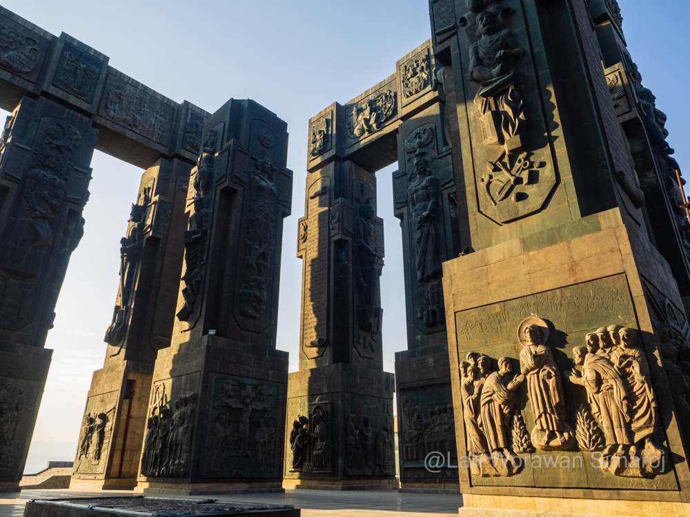 อันที่จริงในตัวเมืองเก่า Tbilisi จะมีโบสถ์ที่สำคัญๆที่เป็นโบราณสถานอยู่ 3-4แห่ง แต่ถ้าอยากเห็นอะไรที่อลังการแปลกตายิ่งกว่า ฉันแนะนำให้ไปชม The Chronicles of Georgia (เดอะ โครนิเคิลส์ ออฟ จอร์เจีย) ซึ่งตั้งอยู่บนเนินเขาริมอ่างเก็บน้ำทบิลิซีห่างจากกลางเมืองออกไปประมาณ 10 กิโลเมตร แม้ว่าจะเป็นสิ่งก่อสร้างที่สร้างไม่เสร็จเสียที (สร้างมาตั้งแต่ปี ค.ศ. 1985) แต่ความยิ่งใหญ่อลังการของเสาหินแกะสลักสีดำขนาดใหญ่สูง 30-35 เมตร ตั้งอยู่เป็นกลุ่ม 16 แท่ง พร้อมภาพแกะสลักเรื่องราวต่างๆเกี่ยวกับจอร์เจีย ไม่ว่าจะเป็นพระราชา พระราชินีหรืออัศวินต่างๆ รวมถึงชีวประวัติของพระเยซูขนาดใหญ่ก็สร้างความตื่นตาตื่นใจให้ได้ไม่น้อยเลยทีเดียว อย่างไรก็ดี เนื่องจากที่นี่ไม่มีรถประจำทางไปถึง หรือถ้าไปถึงบริเวณใกล้ๆก็ต้องเดินขึ้นเขา ฉันจึงจ้างรถแท็กซี่ไปแทนโดยต่อรองให้รอรับกลับมาด้วยเลย ใช้เวลาออกจากตัวเมืองเก่าไปประมาณครึ่งชั่วโมง เดินชมอีกสักหนึ่งชั่วโมงหรือแล้วแต่ตกลง แล้วก็นั่งรถคันเดิมกลับมาในเขตเมืองเก่าหรือโรงแรมได้เลย