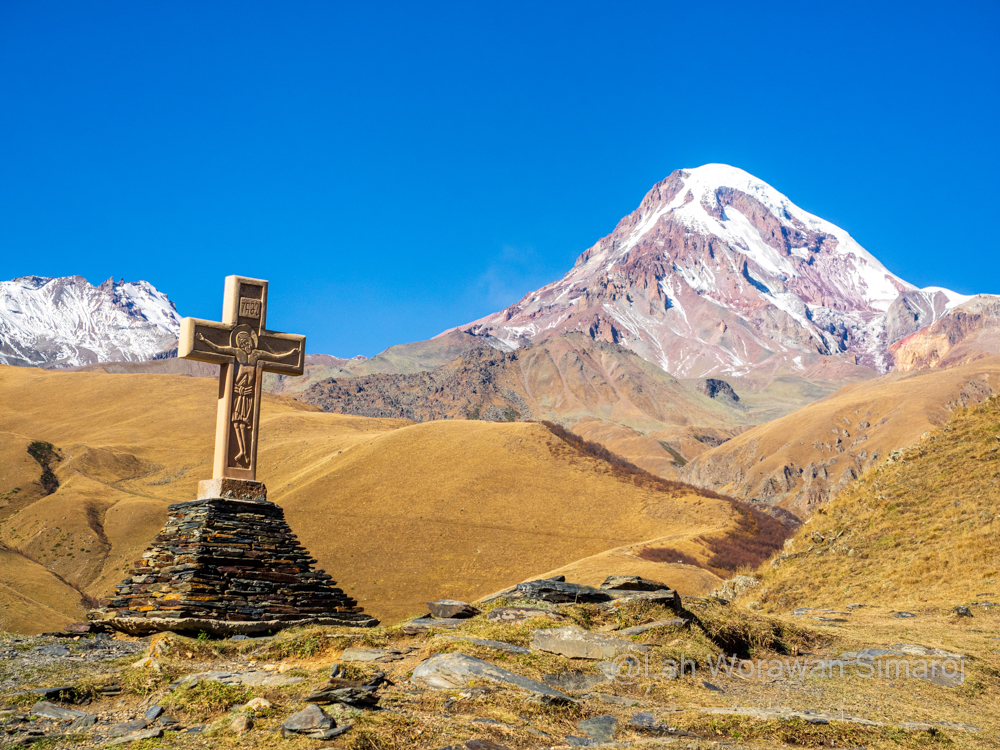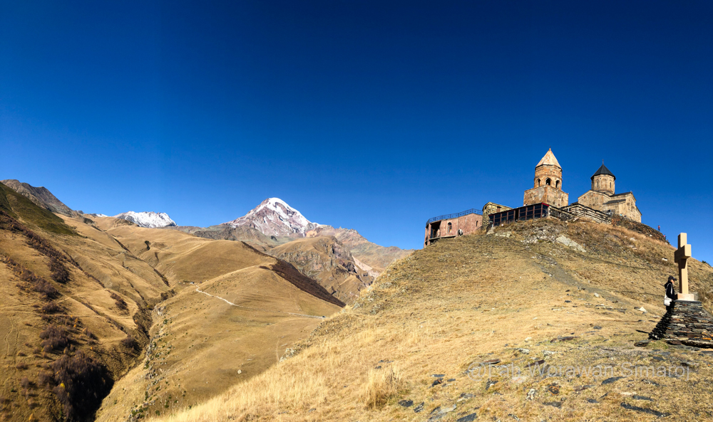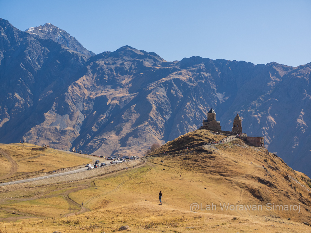 หากใครได้เคยหาข้อมูลท่องเที่ยวประเทศจอร์เจียมาบ้าง ภาพหนึ่งของแลนด์มาร์กที่น่าจะต้องเคยเห็นบ้างคงหนีไม่พ้นอาคารเก่าแก่เล็กๆ สองหลังของโบสถ์แห่งหนึ่งที่ตั้งอยู่บนยอดเขาทุ่งหญ้าโล่งๆ ดูโดดเดี่ยวท่ามกลางเทือกเขามหึมาที่ซ้อนอยู่ด้านหลังอีกทีหนึ่ง ภาพที่ทำเอาหลายๆ คนปักหมุดสถานที่ที่ควรไปเยือนหากได้ไปจอร์เจียกันเลยทีเดียว โบสถ์เล็กๆ แห่งนี้ตั้งอยู่ในหมู่บ้านเล็กๆ เกือบๆ ชายขอบจอร์เจียที่มีเทือกเขาคอเคซัสเป็นแนวพรมแดน ตั้งอยู่ห่างออกไปทางเหนือของเมืองหลวง Tbilisi (ทบิลิซี)ประมาณ 150 กว่ากิโลเมตร ตามถนนสายหลัก Georgian Military Highway (จอร์เจียนมิลิทารี่ไฮเวย์) ที่สามารถทะลุต่อไปยังประเทศรัสเซียได้ บทความสุดท้ายเกี่ยวกับประเทศจอร์เจียในครั้งนี้ ฉันขอพาไปรู้จักสถานที่ต่างๆ ตามถนนสายนี้กัน