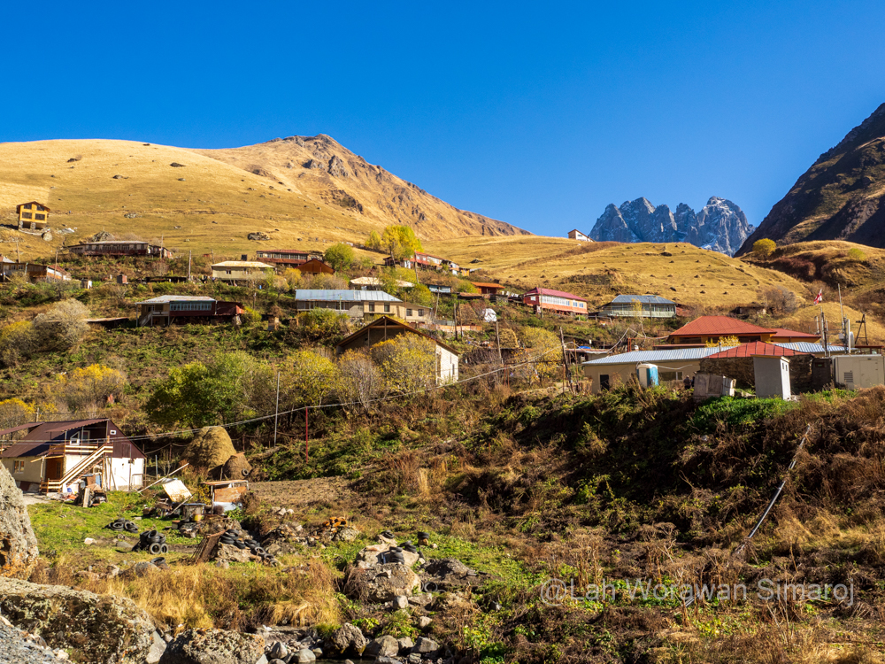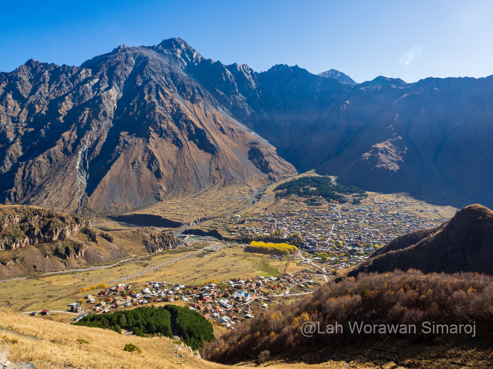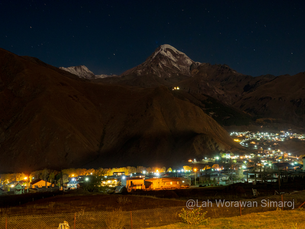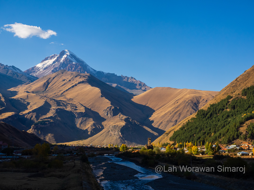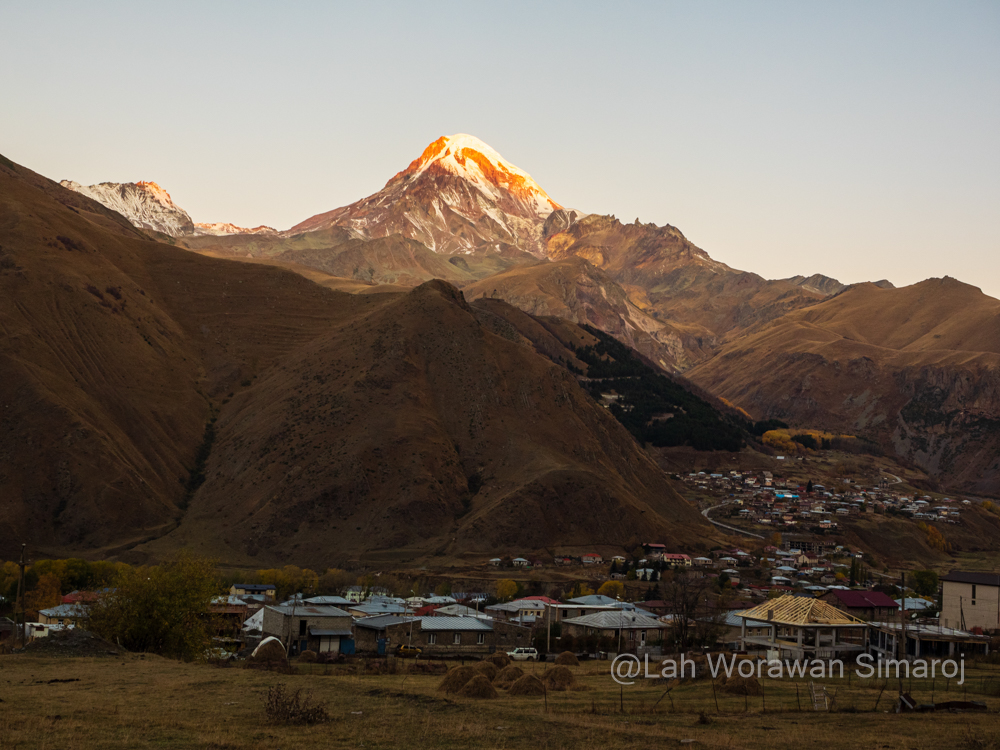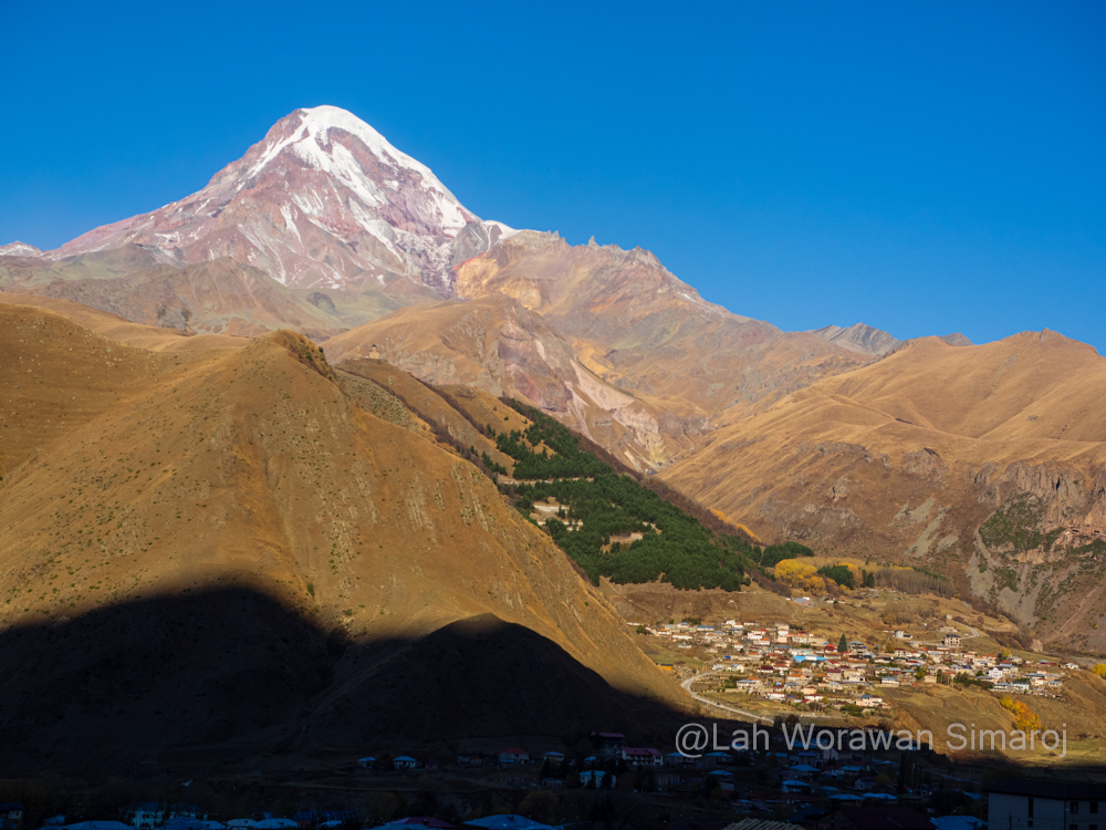 ฉันใช้เวลาอยู่ที่นี่สามวันสองคืนเพื่อชื่นชมความงามของ Mt. Kazbek และบริเวณโดยรอบ ซึ่งถือว่าคุ้มค่ากับการเดินทางมาก ไม่ว่าจะตื่นมาชมแต่เช้าตรู่ หรือยามเย็น หรือยามไหนๆก็ตาม (ดูรูปภูเขาในช่วงเวลาต่างๆของวันประกอบ) ตามข้อมูลที่หาได้ ยอดเขา Kazbek แห่งนี้เป็นยอดเขาภูเขาไฟ (ยังไม่ดับสนิท) ที่สูงเป็นอันดับสองของเทือกเขาคอเคซัส (ถ้านับทุกยอด จะสูงเป็นอันดับเจ็ด) นอกจากการชื่นชมเทือกเขา ชมโบสถ์ เดินชมหมู่บ้านที่มีร้านค้า ร้านอาหารที่คึกคักเพราะนักท่องเที่ยวแล้ว จากหมู่บ้านนี้ไปไม่ถึง 20 กิโลเมตรจะถึงชายแดนจอร์เจียและรัสเซีย (เมือง Vladikavkaz) ซึ่งไม่ใช่ชายแดนที่ถนนตัดข้ามเขา แต่เป็นการเจาะอุโมงค์ลอดพรมแดนธรรมชาติแห่งเทือกเขาคอเคซัสแทน เรียกว่าขับมุดถ้ำจากประเทศหนึ่งออกไปเจออีกประเทศหนึ่ง (หากขับรถมาเองสามารถขับไปถึงชายแดนได้ แต่ถนนจะค่อนข้างแคบและคดโค้ง ควรขับรถด้วยความระมัดระวัง)