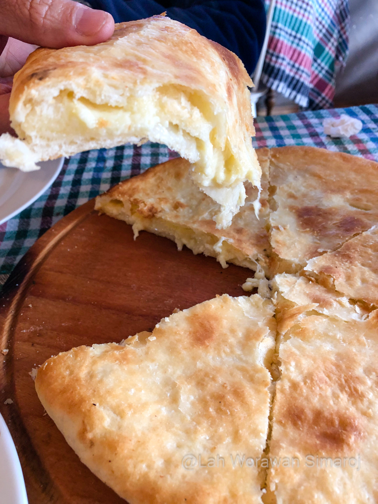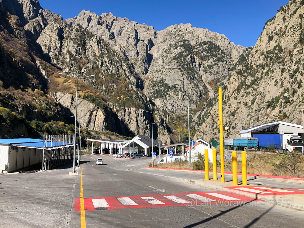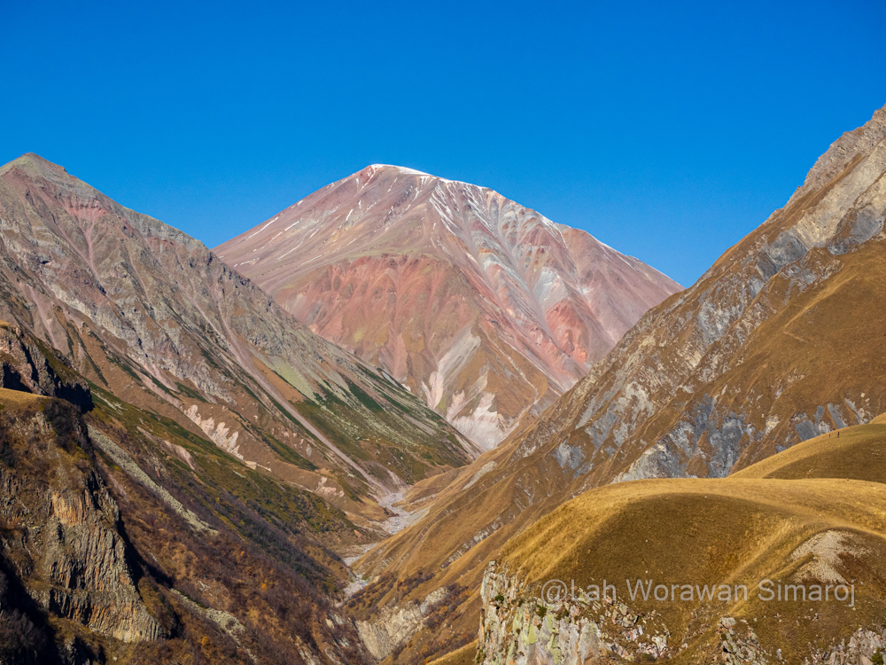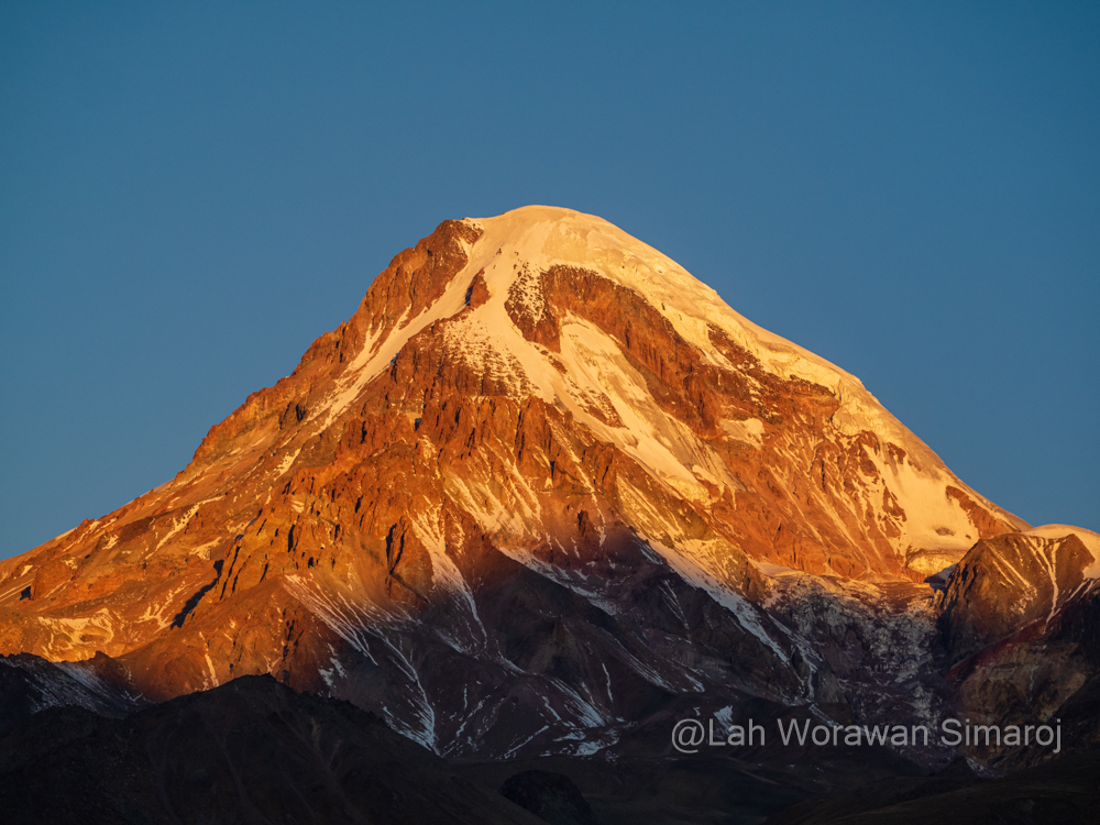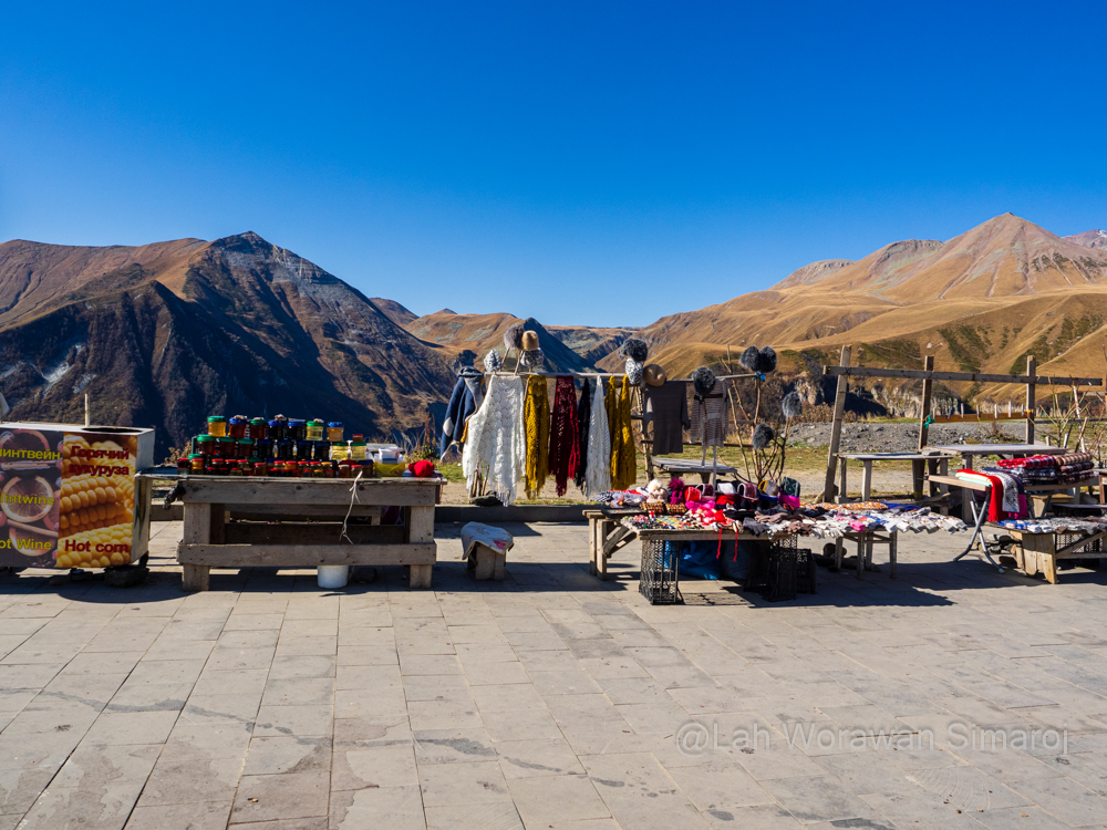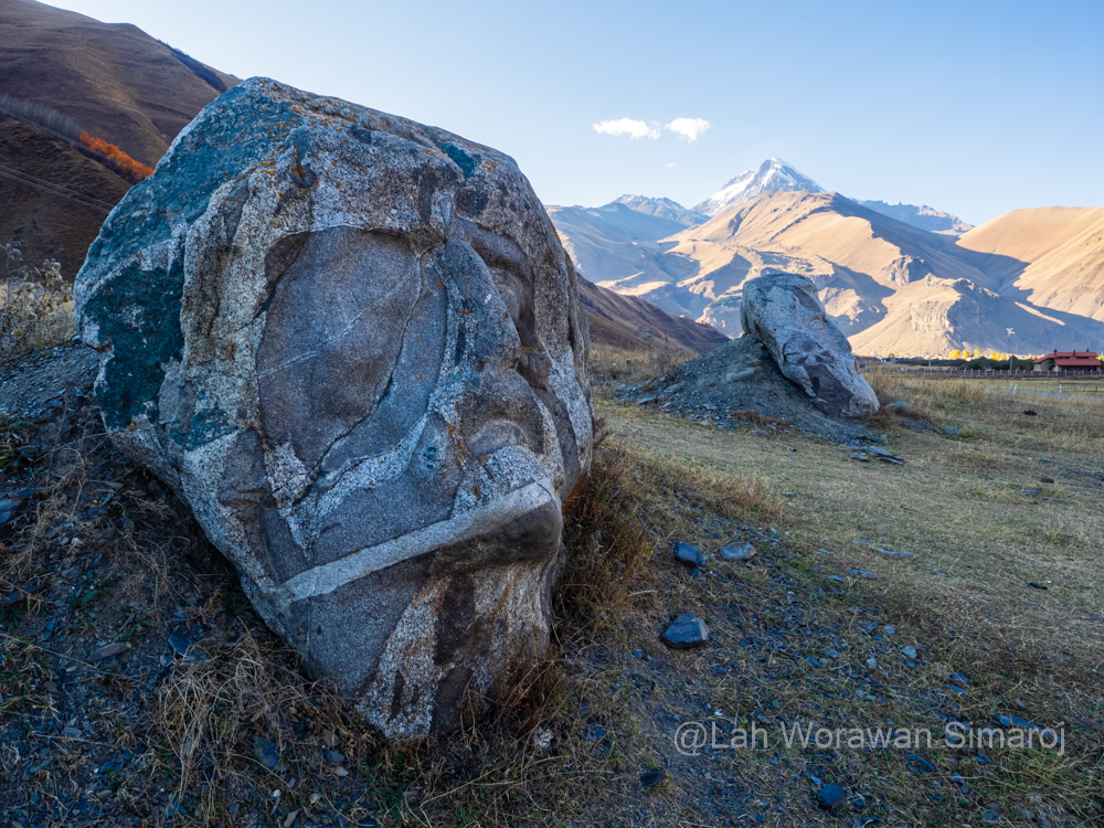 ฉันใช้เวลาอยู่ที่นี่สามวันสองคืนเพื่อชื่นชมความงามของ Mt. Kazbek และบริเวณโดยรอบ ซึ่งถือว่าคุ้มค่ากับการเดินทางมาก ไม่ว่าจะตื่นมาชมแต่เช้าตรู่ หรือยามเย็น หรือยามไหนๆก็ตาม (ดูรูปภูเขาในช่วงเวลาต่างๆของวันประกอบ) ตามข้อมูลที่หาได้ ยอดเขา Kazbek แห่งนี้เป็นยอดเขาภูเขาไฟ (ยังไม่ดับสนิท) ที่สูงเป็นอันดับสองของเทือกเขาคอเคซัส (ถ้านับทุกยอด จะสูงเป็นอันดับเจ็ด) นอกจากการชื่นชมเทือกเขา ชมโบสถ์ เดินชมหมู่บ้านที่มีร้านค้า ร้านอาหารที่คึกคักเพราะนักท่องเที่ยวแล้ว จากหมู่บ้านนี้ไปไม่ถึง 20 กิโลเมตรจะถึงชายแดนจอร์เจียและรัสเซีย (เมือง Vladikavkaz) ซึ่งไม่ใช่ชายแดนที่ถนนตัดข้ามเขา แต่เป็นการเจาะอุโมงค์ลอดพรมแดนธรรมชาติแห่งเทือกเขาคอเคซัสแทน เรียกว่าขับมุดถ้ำจากประเทศหนึ่งออกไปเจออีกประเทศหนึ่ง (หากขับรถมาเองสามารถขับไปถึงชายแดนได้ แต่ถนนจะค่อนข้างแคบและคดโค้ง ควรขับรถด้วยความระมัดระวัง)