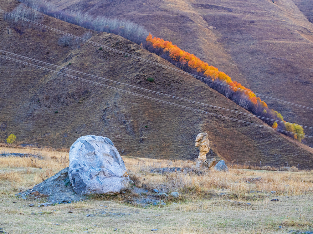 บนถนนเส้นทางสายหลัก ก่อนเข้าหมู่บ้านนี้ประมาณ 4 กิโลเมตร จะมีถนนสายเล็กๆ เลี้ยวแยกไปยังหุบเขา Sno (สโน) ที่มีหมู่บ้านเล็กๆ ตั้งอยู่ท่ามกลางสายน้ำเล็กๆ และเทือกเขาขนาดมหึมา มีหอคอยเก่าแก่ไม่ใหญ่ไม่โตตั้งอยู่ หมู่บ้านเล็กๆ ดูเงียบสงบ มีควันลอยจากหลังคาบ้านกรุ่นๆ เห็นหมู่บ้าน Sno แห่งนี้แล้วนึกถึงหมู่บ้านในนิทานเรื่องไหนสักเรื่องเลยทีเดียว ใกล้ๆ หมู่บ้านจะมีลานหญ้าขนาดใหญ่ มีหินที่สลักเป็นหน้าคนขนาดใหญ่วางเรียงรายอยู่สองข้างถนน ซึ่งเป็นผลงานของ Merab Piranishvili (เมอรับ พิรานิชวิลี) ศิลปินที่เกิดในหมู่บ้านเล็กๆแห่งนี้ และเริ่มงานแกะสลักหินแกรนิตมาตั้งแต่ปี ค.ศ. 1984 โดยแกะเป็นรูปหน้าตาของบุคคลสำคัญในประวัติศาสตร์ที่สร้างชาติจอร์เจียขึ้นมา เขาได้กล่าวไว้ในบทสัมภาษณ์ชิ้นหนึ่งว่า “หากคุณยืนอยู่ท่ามกลางหินสลักเหล่านี้ คุณจะรู้สึกเหมือนว่าคุณได้ยินเสียงพูดคุยกัน และคุณก็จะเชื่อว่าเขาเหล่านี้กำลังพูดคุยกันอยู่”