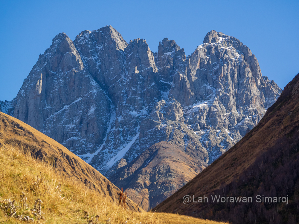 เลยจากหมู่บ้านนี้ไปถนนจะลัดเลาะภูเขาและหน้าผาไปจนถึงหมู่บ้าน Juta (จูตะ) หมู่บ้านเล็กๆ ตั้งอยู่ที่ความสูงประมาณ 2,200 เมตร หมู่บ้านนี้เป็นถิ่นอาศัยของชาวพื้นเมืองดั้งเดิมชนเผ่าหนึ่งของดินแดนแถบนี้ และเป็นจุดเริ่มต้นของการเทรคกิ้งไปตามเส้นทางต่างๆ ที่มีอยู่เป็นสิบเส้นทางเพื่อชื่นชมความงามของเทือกเขาและทุ่งหญ้าอัลไพน์ในช่วงต่างๆ ยกเว้นในฤดูหนาว เนื่องจากเส้นทางจะมีหิมะตกหนักและไม่สามารถเข้าถึงได้ ฉันได้ขับรถไปถึงหมู่บ้านนี้และได้เดินตามเส้นทางสั้นๆ ขึ้นเขาไปเพื่อไปชมความงามของเทือกเขา Chaukhi (เชาคี) แม้จะเพียงเล็กน้อยก็ยังดี เนื่องจากมีเวลาเพียงน้อยนิด และไม่ได้ติดต่อหรือเตรียมตัวมาเทรคกิ้งจริงๆจังๆ เมื่อเดินลัดเลาะผ่านหมู่บ้านค่อยๆขึ้นเนินสูงไปเรื่อยๆ (ช่วงที่ไปจะเห็นเป็นทุ่งหญ้าแห้งๆ) จนพ้นเนินก็ได้เห็นความงามของแท่งหินมหึมาแห่งเทือกเขา Chaukhi ที่หลายคนเรียกกันว่าเป็น Georgian Dolomites (จอร์เจียนโดโลไมท์ส) เนื่องจากมีลักษณะกายภาพคล้ายคลึงกับเทือกเขาหินปูน Dolomites อันลือชื่อของอิตาลีนั่นเอง