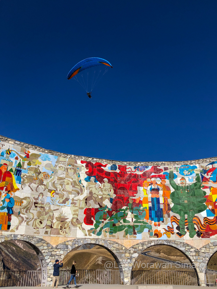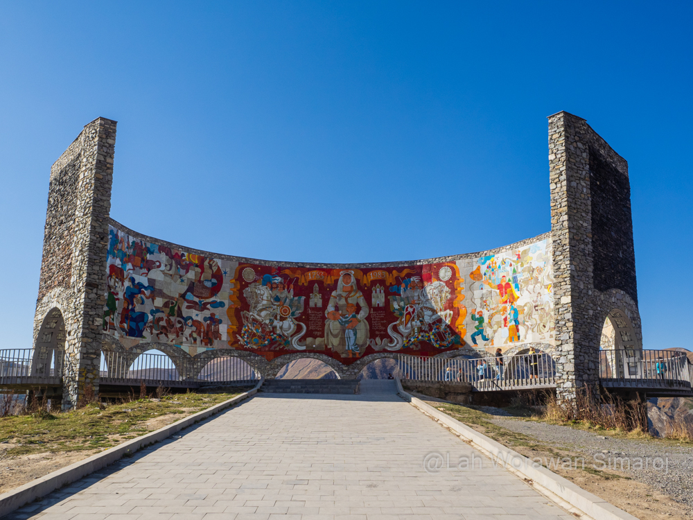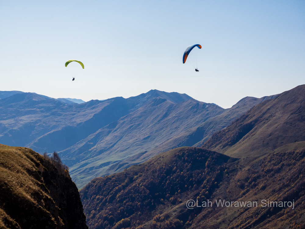 หลังจากขับรถไปตามเส้นทางที่ส่วนใหญ่จะเลาะไปตามแม่น้ำสักประมาณหนึ่งชั่วโมง จะเริ่มเข้าสู่บริเวณที่เป็นเส้นทางลาดชันคดเคี้ยวหักศอกไต่ขึ้นเขาสูง นั่นหมายถึงการเข้าใกล้เมือง Gudauri (กุเดารี) แล้ว ที่นี่เป็นเมืองแห่งสกีรีสอร์ท เพราะตั้งอยู่บนที่ราบสูงแห่งเทือกเขาคอเคซัสที่มีความสูงถึง 2,200 เมตรเหนือระดับน้ำทะเล นอกจากจะเป็นแหล่งสกีชื่อดังของประเทศแล้ว ที่นี่ยังเป็นที่ที่คนนิยมมาเล่น Paragliding กันด้วย ในช่วงที่ฉันผ่านไปนั้น เป็นช่วงที่ฤดูใบไม้ร่วง ยังไม่เข้าฤดูหนาว จึงเห็นเป็นภูเขาทุ่งหญ้าโล้นๆแห้งๆ สุดลูกหูลูกตา สีของภูเขาสูงที่ยังไม่มีหิมะปกคลุมมีสีสันของชั้นดินและหินที่สวยงามแปลกตาไม่น้อยเลยทีเดียว หากไม่ได้จะมาพักรีสอร์ทเพื่อเล่นสกีหรือทำกิจกรรมที่นี่ จุดแวะถ่ายรูปคงหนีไม่พ้นบริเวณที่เป็นที่ตั้งของอนุสาวรีย์แห่งมิตรภาพระหว่างรัสเซียและจอร์เจีย (Russian Georgian Friendship Monument) ที่สร้างเป็นแท่งทรงโค้งขนาดใหญ่ประดับโมเสอิคเป็นรูปและเรื่องราวแห่งมิตรภาพระหว่างสองประเทศ อนุสาวรีย์แห่งนี้สร้างขึ้นโดยสหภาพโซเวียตเมื่อปี ค.ศ. 1983 ในวาระครบรอบ 200 ปีแห่งสนธิสัญญาระหว่างจอร์เจียตะวันออกและรัสเซีย (Treaty of Georgievsk) ที่ทำขึ้นในปี ค.ศ. 1783 ว่าแม้ว่าในความเป็นจริงทางประวัติศาสตร์ รัสเซียไม่ได้ช่วยปกป้องจอร์เจียเอาไว้จากการรุกรานของชนชาติอื่นตามที่เซ็นในสนธิสัญญานี้ก็ตาม