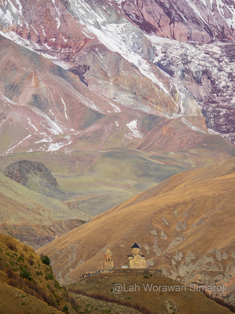 หมู่บ้าน Stepantsminda (Kazbegi) ตั้งอยู่ในหุบเขาที่ความสูงประมาณ 1,750 เมตร ห้อมล้อมด้วยเทือกเขาสูงแห่งคอเคซัส มีแม่น้ำ Terek (เทเร็ก) ไหลผ่าน มียอดเขา Kazbek ยอดเขาที่ปกคลุมด้วยหิมะ (ความสูง 5,034 เมตร) หนึ่งในสิบยอดเขาที่สูงที่สุดแห่งเทือกเขาคอเคซัส ตั้งตระหง่านเป็นฉากหลังอยู่เหนือหมู่บ้าน ไม่ว่าจะอยู่จุดไหนก็มองเห็น เมืองนี้เป็นที่นิยมของนักท่องเที่ยวเพราะความสวยงามของ Mt. Kazbek นี่เอง จากหมู่บ้านมองไปทางยอดเขา จะเห็นเนินเล็กๆที่ความสูงประมาณสองพันกว่าเมตร ที่มีโบสถ์เล็กๆ อันเป็น landmark ของที่นี่ที่ฉันกล่าวถึงในตอนแรกตั้งอยู่ โบสถ์แห่งนี้มีชื่อว่า Gergeti Trinity Church (เกอร์เกติ ทรินิตี้ เชิร์ช) หรือชื่อพื้นเมืองว่า Tsminda Sameba (ทซึมินดา ซาเมบา) สร้างมาตั้งแต่สมัยศตวรรษที่ 14 เนื่องจากตัวโบสถ์ตั้งอยู่บนเนินเหนือหมู่บ้าน หากเป็นสมัยก่อนก็ต้องเดินเทรคกันขึ้นไปประมาณ 1-2 ชั่วโมง แต่เนื่องจากความบูมเรื่องการท่องเที่ยวของประเทศก่อนหน้าที่จะมีโควิด จึงมีการสร้างถนนราดยางอย่างดีให้ขึ้นไปถึงได้โดยง่าย (สร้างเมื่อปี ค.ศ. 2018) การเดินเที่ยวชมตัวโบสถ์ที่เป็นโบราณสถานก็เรื่องหนึ่ง แต่ถ้าอยากได้ภาพสวยๆของโบสถ์กับฉากหลัง ฉันขอแนะนำให้เดินอ้อมโบสถ์ลงไปตามทางเดินด้านล่าง (จะเห็นโบสถ์กับ Mt. Kazbek) หรือไม่ก็จอดรถที่ลานจอดรถขนาดใหญ่ก่อนถึงตัวโบสถ์ (จะเห็นโบสถ์กับเทือกเขาที่เห็นเป็นแท่งหินขนาดมหึมา) ซึ่งจะได้ความงามกันคนละมุม จากโบสถ์แห่งนี้ จะมีเส้นทางเทรคกิ้งไปธารน้ำแข็ง Kazbek ซึ่งต้องใช้เวลาประมาณ 8-10 ชั่วโมง