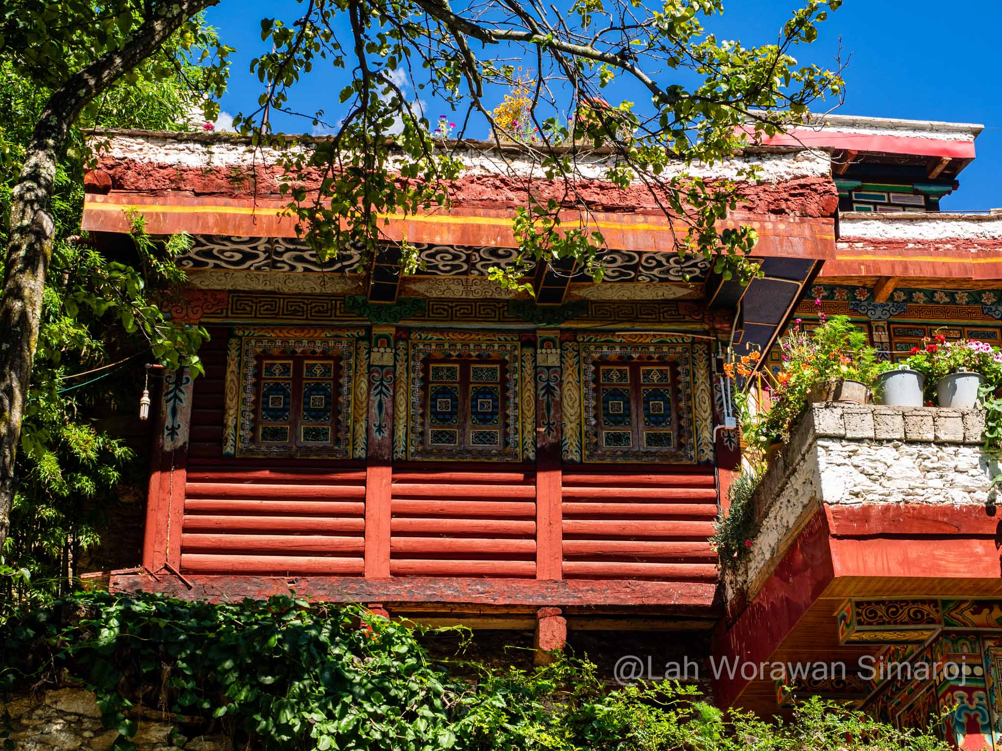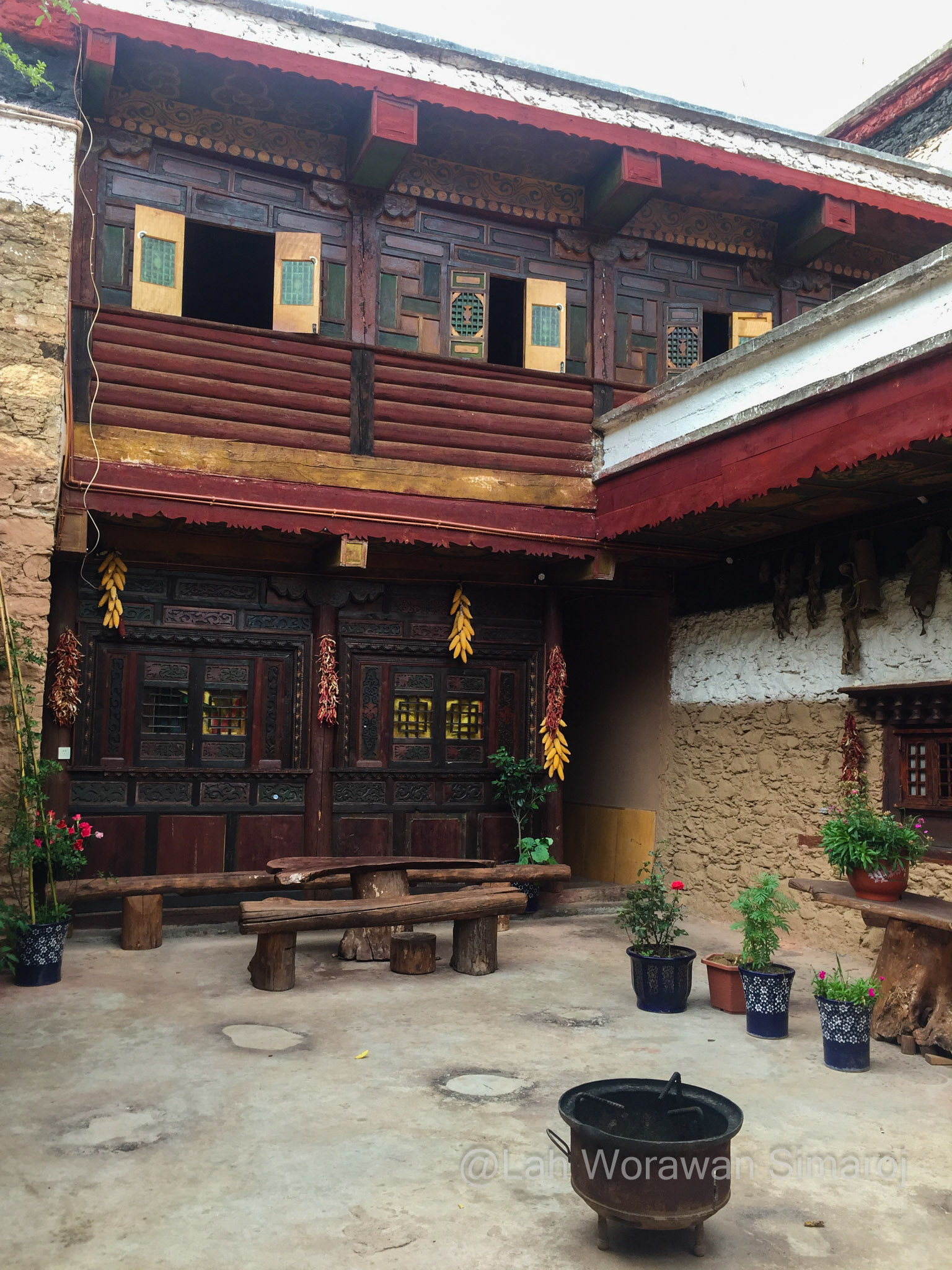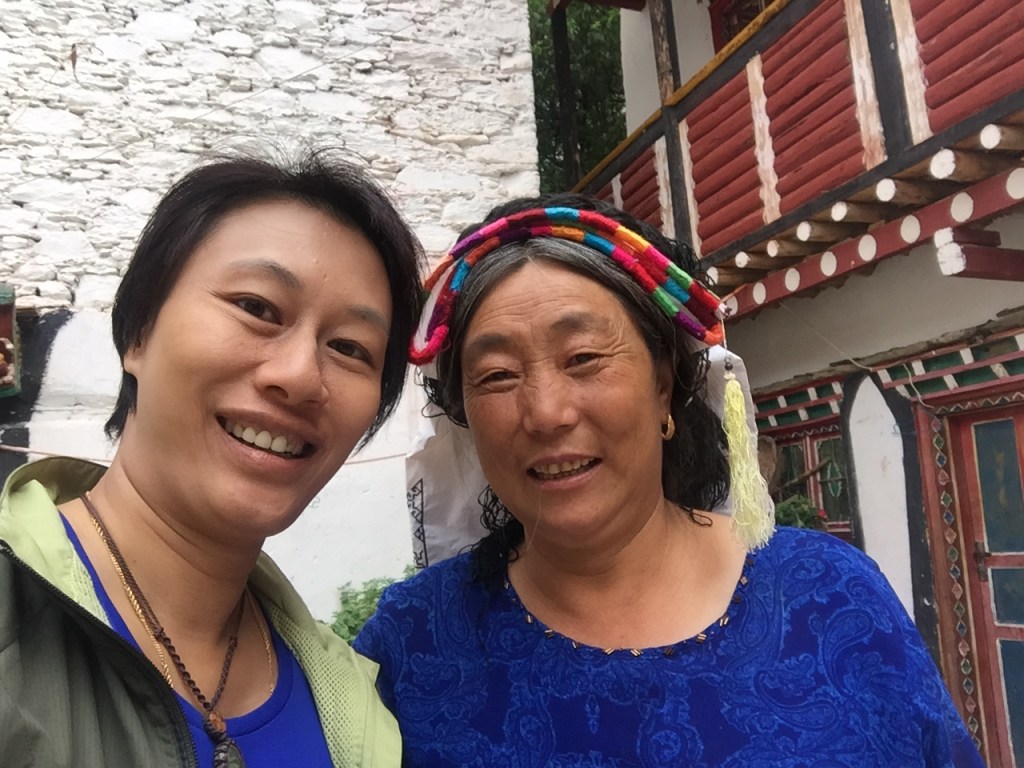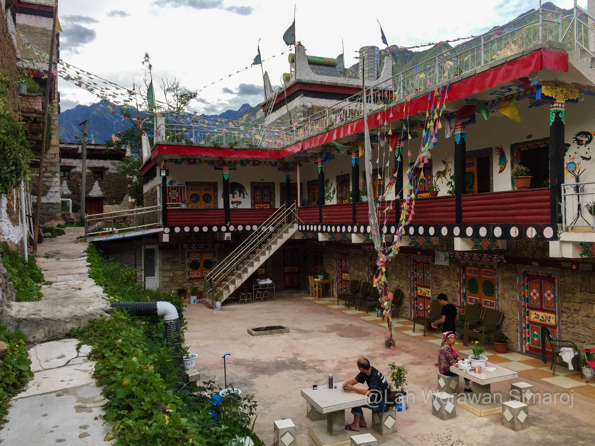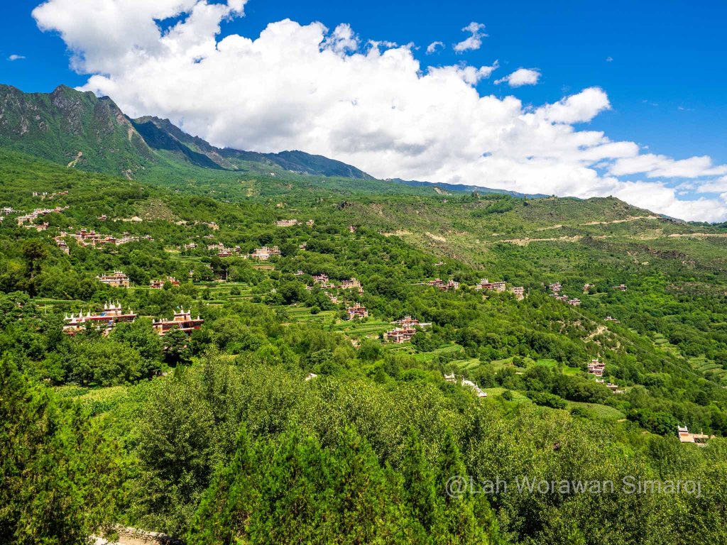 หมู่บ้าน Jiaju (เจวียจวู) คือหนึ่งในตัวอย่างหมู่บ้านแบบทิเบตโบราณที่สวยที่สุดที่ฉันพูดถึง ตัวหมู่บ้านตั้งอยู่เรียงรายบนเนินเขา Kapama (คาพามา) ที่หันหน้าสู่แม่น้ำ Dajin (ต้าจวิน) เบื้องล่าง ตัวอาคารสร้างด้วยหินและไม้ตามวัฒนธรรมของชาวเชียง ที่เรียกว่า Jiarong-Tibetan (เจวียหลง-ทิเบต) ซึ่งเป็นต้นแบบของรูปแบบสถาปัตยกรรมพื้นเมืองหลักของทิเบตในเวลาต่อมา หากมองจากจุดชมวิวหมู่บ้าน จะเห็นอาคารสีออกแดงหม่นๆขาวๆ กระจายตัวอยู่ตามความเขียวขจีของเนินเขา ในหมู่บ้านมีชาวบ้านอาศัยอยู่ประมาณ 150 ครัวเรือน บางบ้านทำเป็นโฮมสเตย์ ซึ่งหนึ่งในนั้นก็คือที่หลับที่นอนของพวกเราในคืนแรกนั่นเอง โฮมสเตย์ที่เราอาศัยพักนอนในคืนนี้มีชื่อว่า Three Sisters’ Homestay ไม่ต้องบอกก็รู้ว่าที่นี่บริหารงานโดยพี่น้องสามสาว…ที่พูดภาษาอังกฤษได้ประมาณไม่เกิน 10 คำ! พวกเราต้องใช้แอพแปลภาษาช่วยกันแบบมือเป็นระวิงกว่าจะ (คาดว่า) เข้าใจ (อย่างน้อยก็เวลานัดกินข้าว) ตัวบ้านมีลานกลางบ้านโล่งๆ และแยกเป็นห้องต่างๆที่สร้างจากหินและไม้ มีการตกแต่งวาดลายเขียนสีสดใสแบบทิเบต มีส่วนที่เก็บฟืน ส่วนที่เป็นห้องน้ำ และส่วนที่เป็นครัวที่ฉันไม่ได้เข้าไปชม แต่อาหารที่ถูกยกออกมาเสริฟตรงลานกลางบ้านในตอนเย็นนั้น ออกมาอย่างอลังการหลากหลายแม้ว่าจะเป็นอาหารพื้นๆแบบจีนๆ ก็ตาม แต่ก็อร่อยๆ ทั้งนั้น นอกจากนี้บนหลังคาบ้านยังเป็นลานแบบดาดฟ้า ตามสไตล์ของที่นี่ ซึ่งทำไว้เป็นที่สำหรับตากพริกหรือพืชผักต่างๆเพื่อการถนอมรักษาอาหาร ซึ่งพวกเราใช้เป็นจุดชมวิวแบบพานอราม่าของหมู่บ้านอันงดงามนี้ได้เป็นอย่างดี