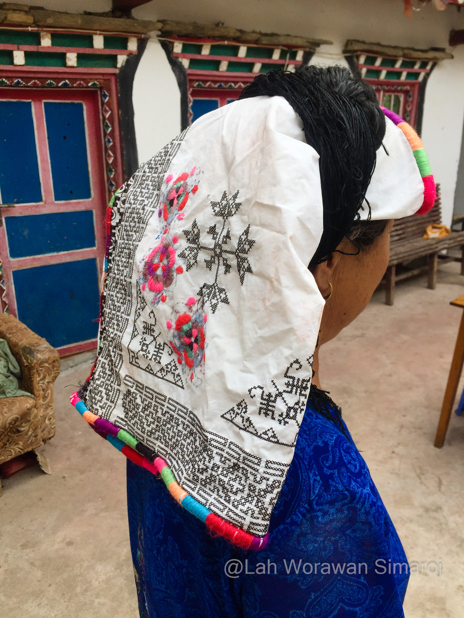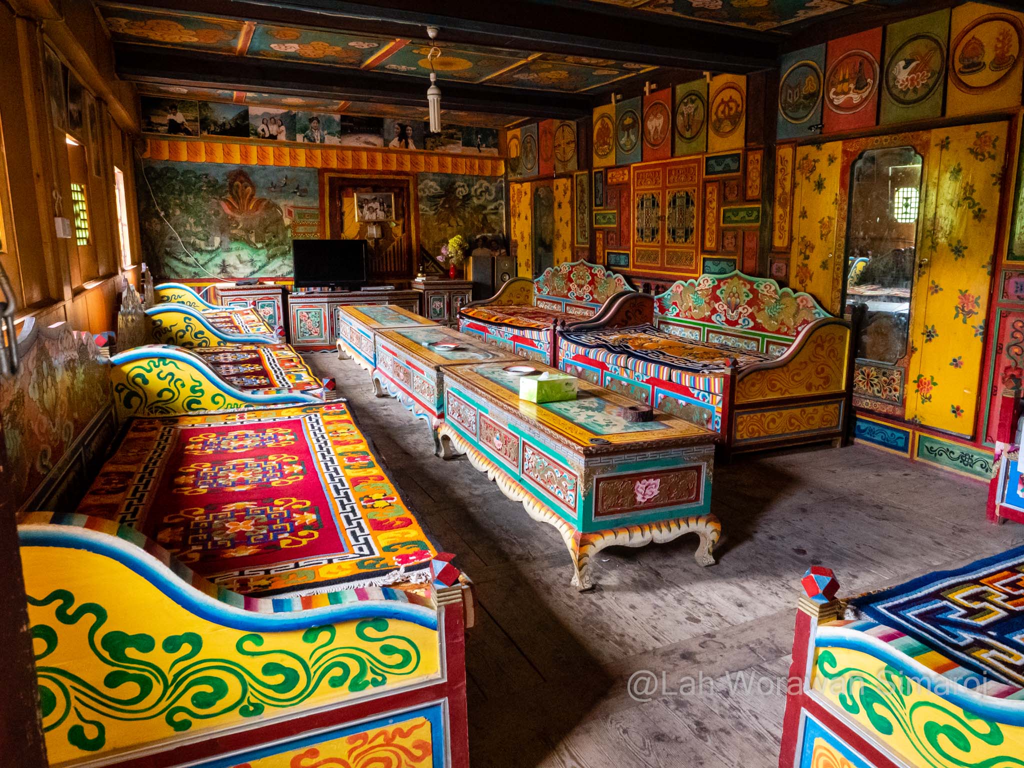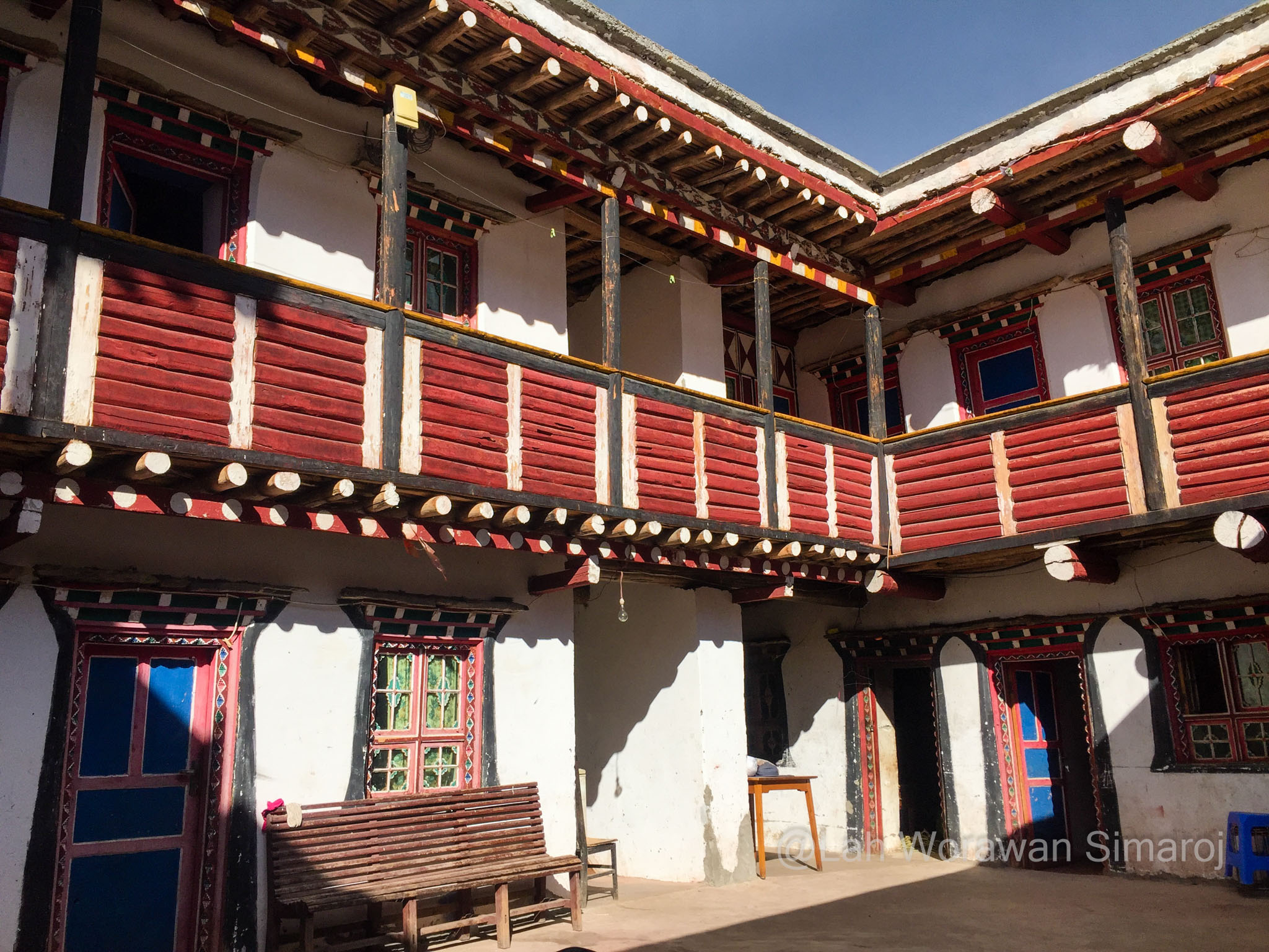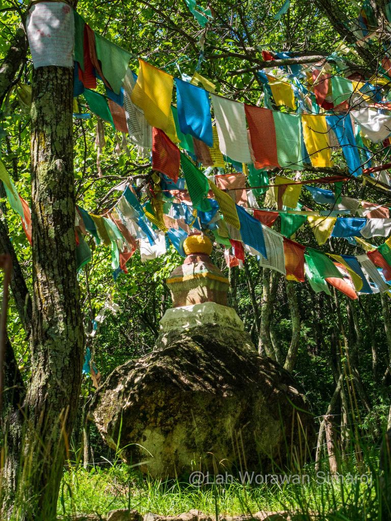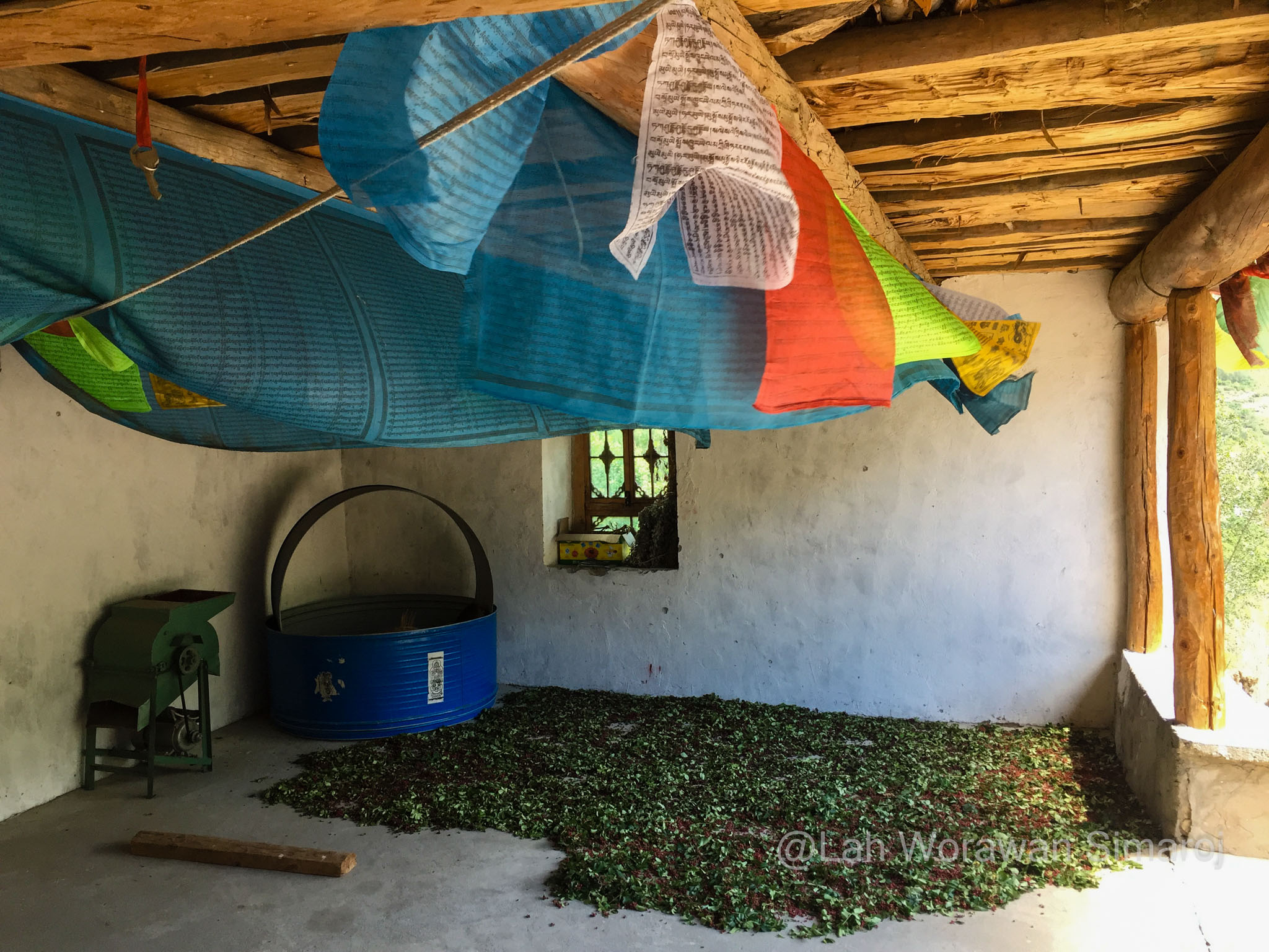 หมู่บ้าน Jiaju (เจวียจวู) คือหนึ่งในตัวอย่างหมู่บ้านแบบทิเบตโบราณที่สวยที่สุดที่ฉันพูดถึง ตัวหมู่บ้านตั้งอยู่เรียงรายบนเนินเขา Kapama (คาพามา) ที่หันหน้าสู่แม่น้ำ Dajin (ต้าจวิน) เบื้องล่าง ตัวอาคารสร้างด้วยหินและไม้ตามวัฒนธรรมของชาวเชียง ที่เรียกว่า Jiarong-Tibetan (เจวียหลง-ทิเบต) ซึ่งเป็นต้นแบบของรูปแบบสถาปัตยกรรมพื้นเมืองหลักของทิเบตในเวลาต่อมา หากมองจากจุดชมวิวหมู่บ้าน จะเห็นอาคารสีออกแดงหม่นๆขาวๆ กระจายตัวอยู่ตามความเขียวขจีของเนินเขา ในหมู่บ้านมีชาวบ้านอาศัยอยู่ประมาณ 150 ครัวเรือน บางบ้านทำเป็นโฮมสเตย์ ซึ่งหนึ่งในนั้นก็คือที่หลับที่นอนของพวกเราในคืนแรกนั่นเอง โฮมสเตย์ที่เราอาศัยพักนอนในคืนนี้มีชื่อว่า Three Sisters’ Homestay ไม่ต้องบอกก็รู้ว่าที่นี่บริหารงานโดยพี่น้องสามสาว…ที่พูดภาษาอังกฤษได้ประมาณไม่เกิน 10 คำ! พวกเราต้องใช้แอพแปลภาษาช่วยกันแบบมือเป็นระวิงกว่าจะ (คาดว่า) เข้าใจ (อย่างน้อยก็เวลานัดกินข้าว) ตัวบ้านมีลานกลางบ้านโล่งๆ และแยกเป็นห้องต่างๆที่สร้างจากหินและไม้ มีการตกแต่งวาดลายเขียนสีสดใสแบบทิเบต มีส่วนที่เก็บฟืน ส่วนที่เป็นห้องน้ำ และส่วนที่เป็นครัวที่ฉันไม่ได้เข้าไปชม แต่อาหารที่ถูกยกออกมาเสริฟตรงลานกลางบ้านในตอนเย็นนั้น ออกมาอย่างอลังการหลากหลายแม้ว่าจะเป็นอาหารพื้นๆแบบจีนๆ ก็ตาม แต่ก็อร่อยๆ ทั้งนั้น นอกจากนี้บนหลังคาบ้านยังเป็นลานแบบดาดฟ้า ตามสไตล์ของที่นี่ ซึ่งทำไว้เป็นที่สำหรับตากพริกหรือพืชผักต่างๆเพื่อการถนอมรักษาอาหาร ซึ่งพวกเราใช้เป็นจุดชมวิวแบบพานอราม่าของหมู่บ้านอันงดงามนี้ได้เป็นอย่างดี