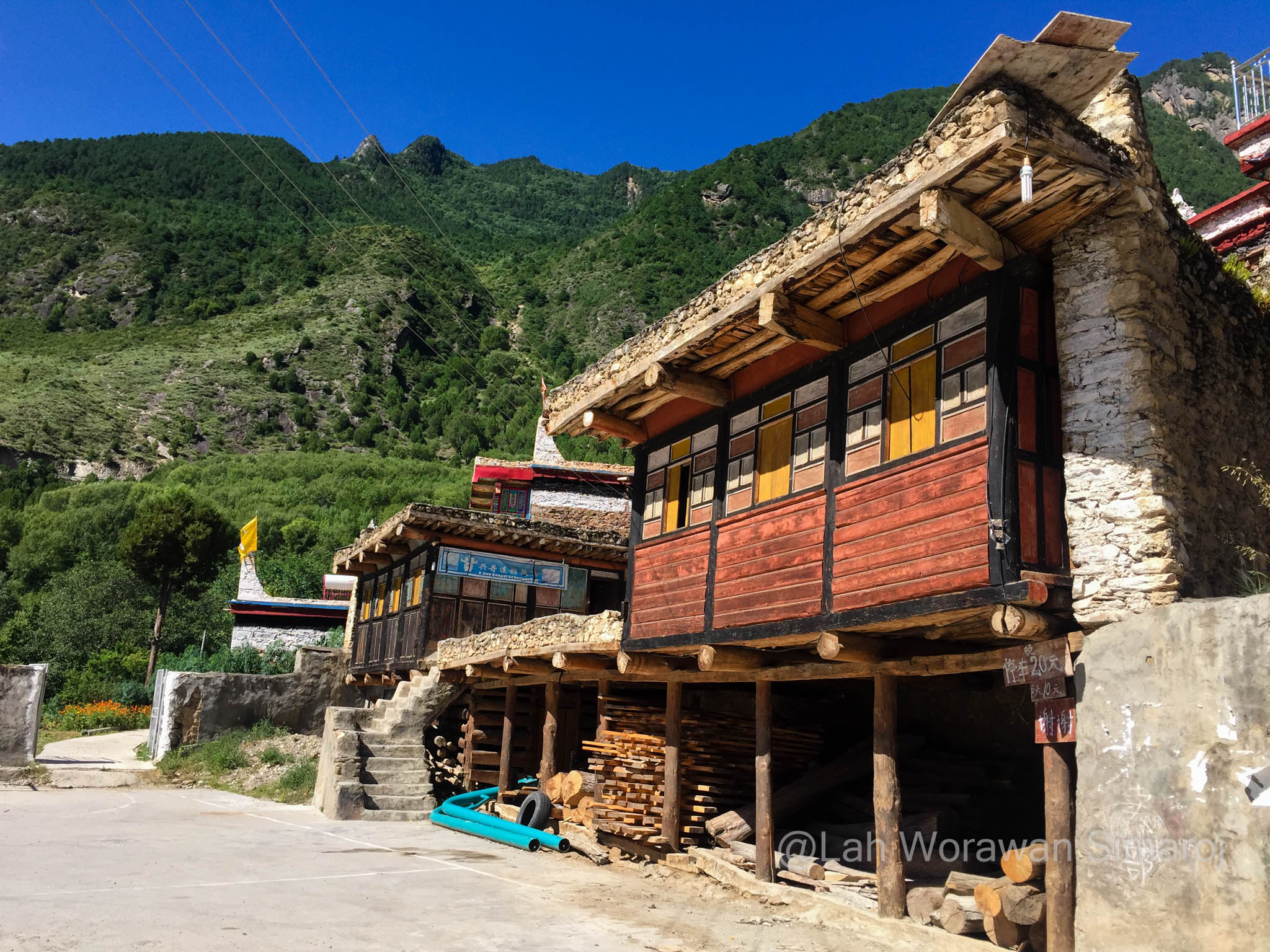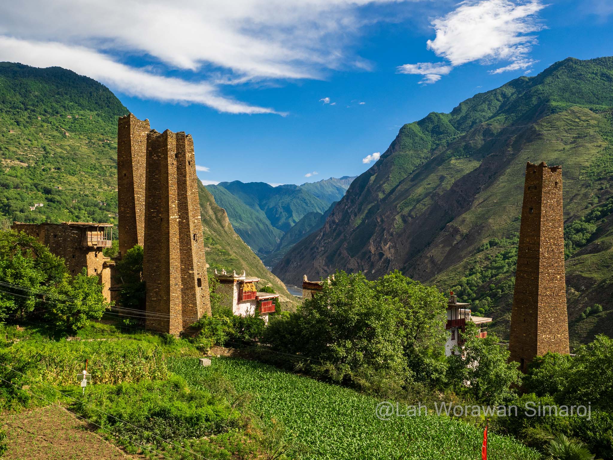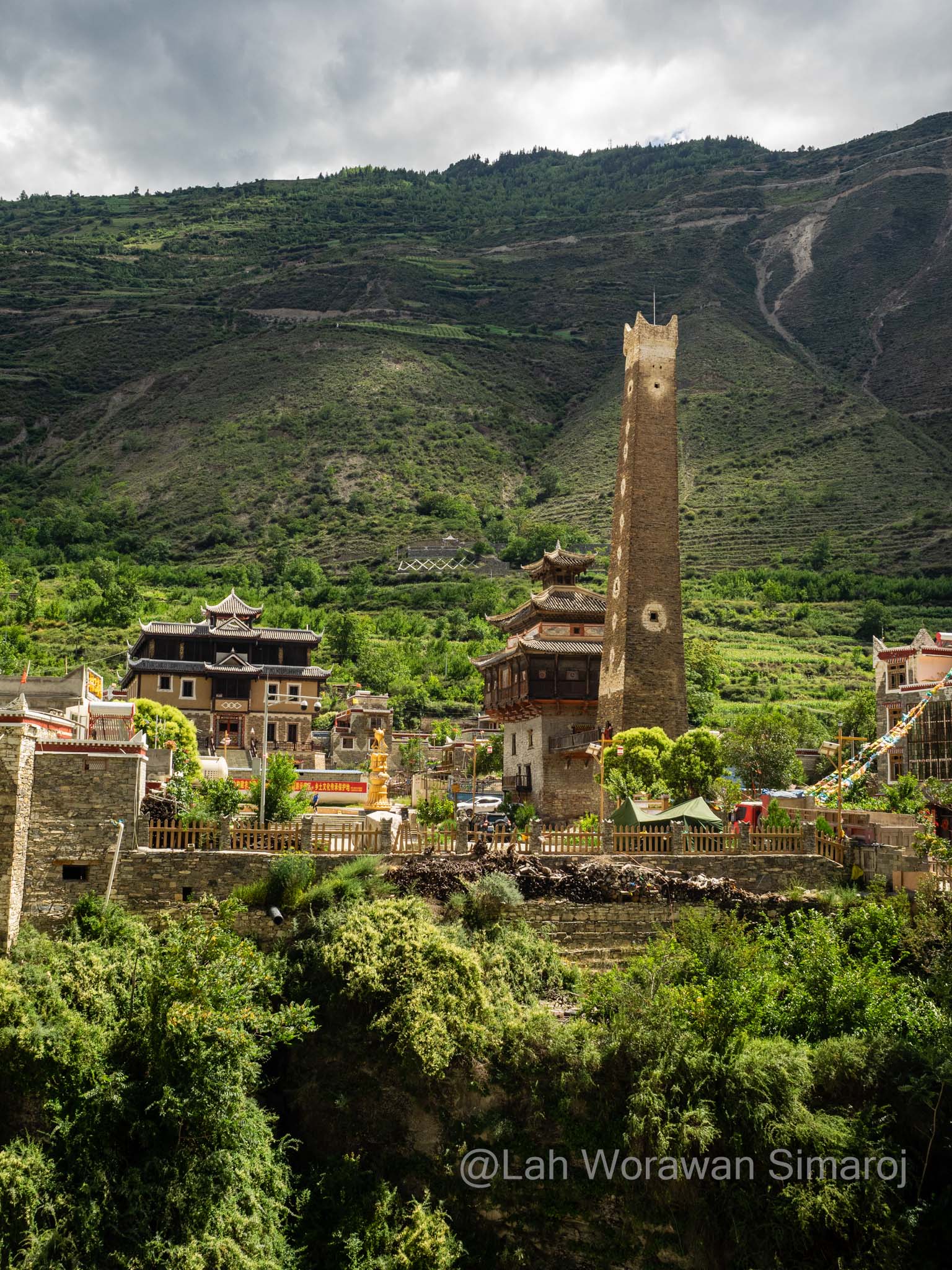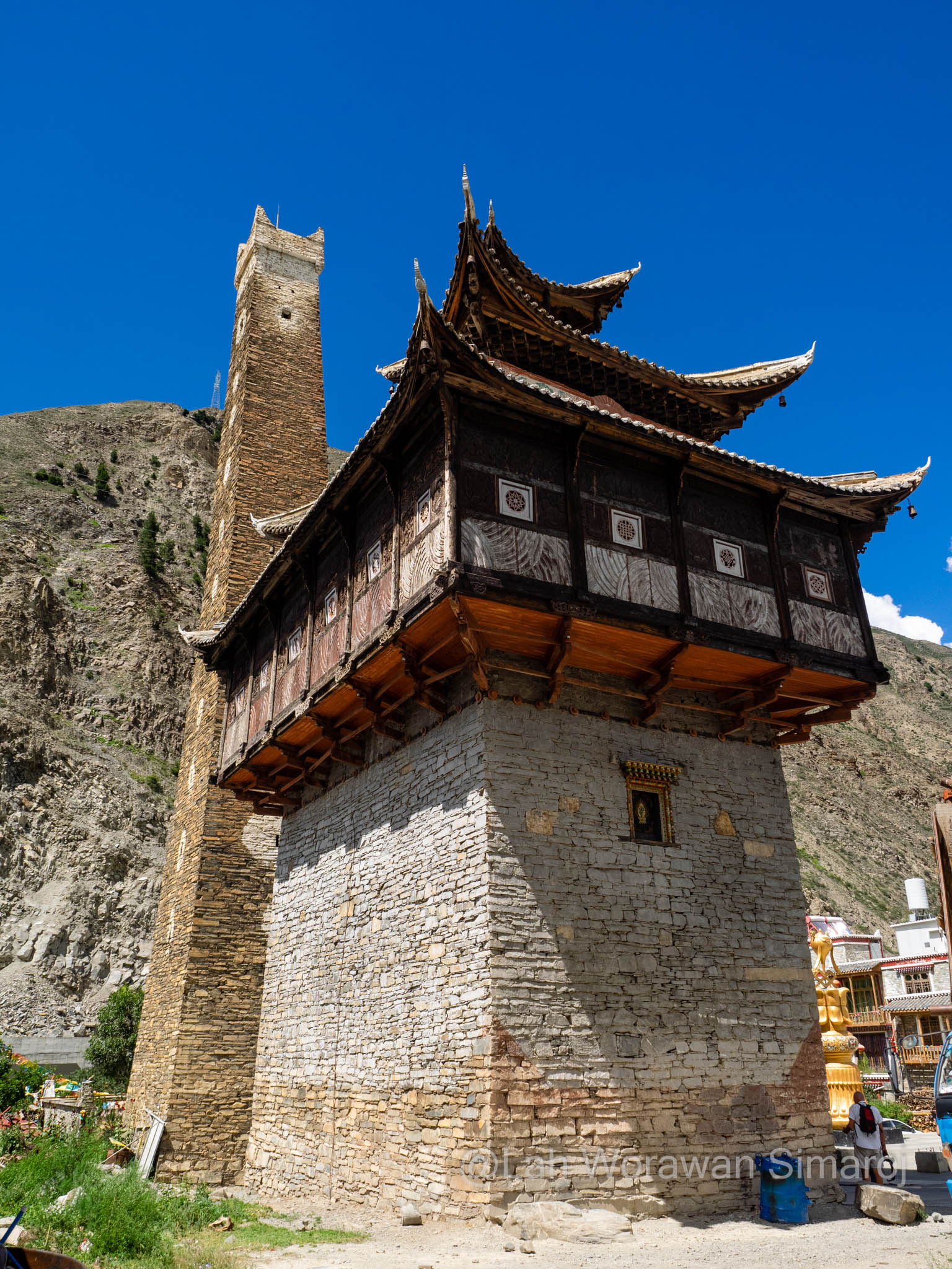 หลังจากรถติดอยู่ในตัวเมืองเฉินตูประมาณหนึ่งชั่วโมงกว่าๆ ในที่สุดรถของเราก็หลุดเข้าสู่เส้นทางที่เริ่มเข้าสู่เขตที่ราบสูงของมณฑลเสฉวนและส่วนหนึ่งของเทือกเขา Hengduan (เหิงต้วน) ถนนเลาะเลี้ยวไปตามแม่น้ำ มีอุโมงค์ที่ทะลุผ่านภูเขาเป็นระยะๆ ก่อนที่จะค่อยๆไต่ความสูงขึ้นไปที่สามพันกว่าเมตร ระหว่างเส้นทางสามารถมองเห็นยอดภูเขาหิมะไกลๆของเทือกเขาแถบนี้ได้ โดยขึ้นอยู่กับสภาพอากาศที่เปิดปิดมากน้อยแค่ไหน ถนนเริ่มหักศอกคดเคี้ยวขึ้นไปถึงช่องเขาบริเวณใกล้ๆเทือกเขา Siguiniang (ซิกุยเนียน) หรือที่คนไทยเรียกว่าเทือกเขาสี่ดรุณี มีจุดพักรถชมวิวที่มีชาวบ้านเอาของที่หาได้ในดินแดนแทบนั้นมาวางขาย ซึ่งรวมถึงเนื้อบาบีคิวย่างสไตล์เสฉวน ผักป่า น้ำผึ้งป่า รวมไปถึงตัวกะท่างตากแห้ง! หลังจากนั้นเส้นทางจะลดระดับลงมาตามแนวไหล่เขาลัดเลาะไปตามแม่น้ำอีกครั้ง เนื่องจากครั้งนี้เป็นการเช่ารถมากันเอง พวกเราจึงสามารถบอกคนขับรถให้หยุดที่ไหนก็ได้ตามที่ต้องการ โดยนอกจากการพักเข้าห้องน้ำ (ข้างทาง) กินข้าว หยุดพักถ่ายรูปวิวทิวทัศน์เป็นระยะๆแล้ว จุดที่หยุดจริงจังจุดแรกคืออำเภอเล็กๆแห่งหนึ่งริมแม่น้ำ เนื่องจากมีอาคารหอคอยทรงแปลกตาขนาดใหญ่เรียกความสนใจของผู้ร่วมทางทุกคน อำเภอนี้มีชื่อว่า Worixiang (โหว่ยรืเซียง) ตั้งอยู่ริมแม่น้ำ Wori อาคารสูงแปลกตานี้เป็นหอคอยทรงสี่เหลี่ยมที่มีฐานสร้างจากหินและมีเก๋งสามชั้นสร้างจากไม้ในรูปแบบจีนทิเบตอยู่ด้านบนดูราวกับดอกเห็ด ตามประวัติเท่าที่หาได้หอคอยแห่งนี้สร้างขึ้นมา 200-300 ปีมาแล้วในสมัยต้นราชวงศ์ชิง (Qing) มีความสูงรวมทั้งหมดประมาณ 22.5 เมตร ถูกใช้เป็นป้อมปราการและเป็นหอเก็บคัมภีร์ในสมัยก่อน รอบๆหอคอยจะมีผู้เฒ่าผู้แก่นั่งจับกลุ่มหญิงชายคุยกันอยู่ ท่าทางอัธยาศัยใจดี ยิ้มให้นักเดินทางหน้าตาแปลกๆอย่างพวกเรา และพยายามจะพูดคุยด้วยท่าทางเป็นกันเอง เมื่อพบว่ามีคนพูดภาษาจีนได้แม้จะเพียงน้อยนิดอยู่ก็ตามอยู่ในกลุ่มของพวกเรา