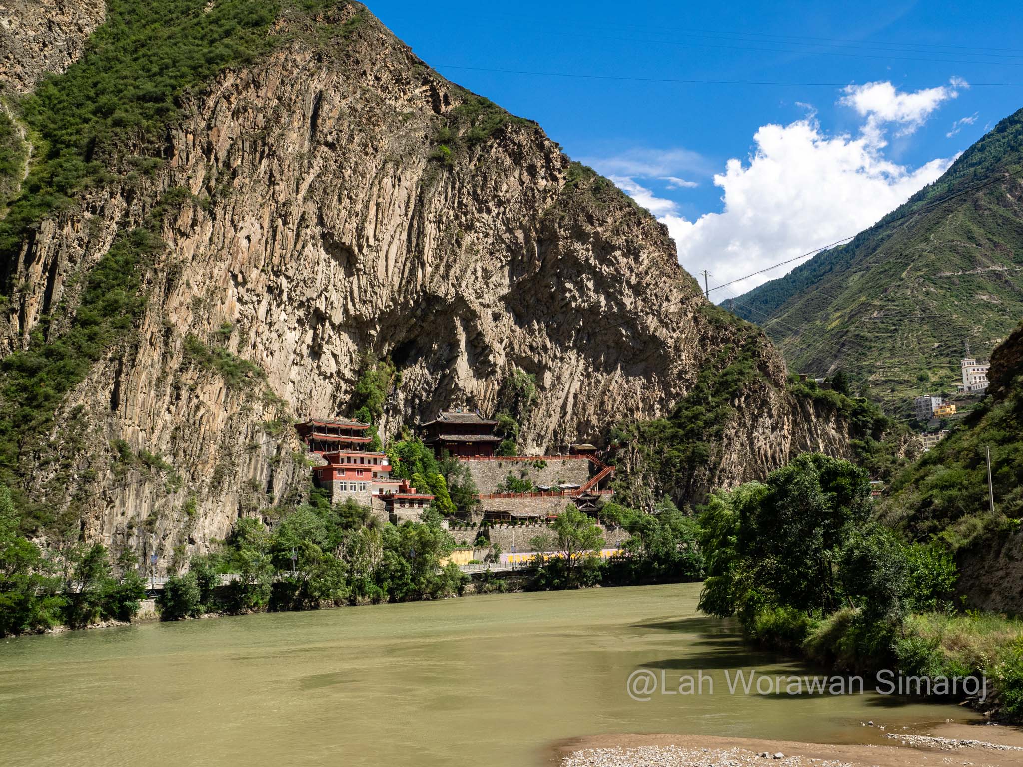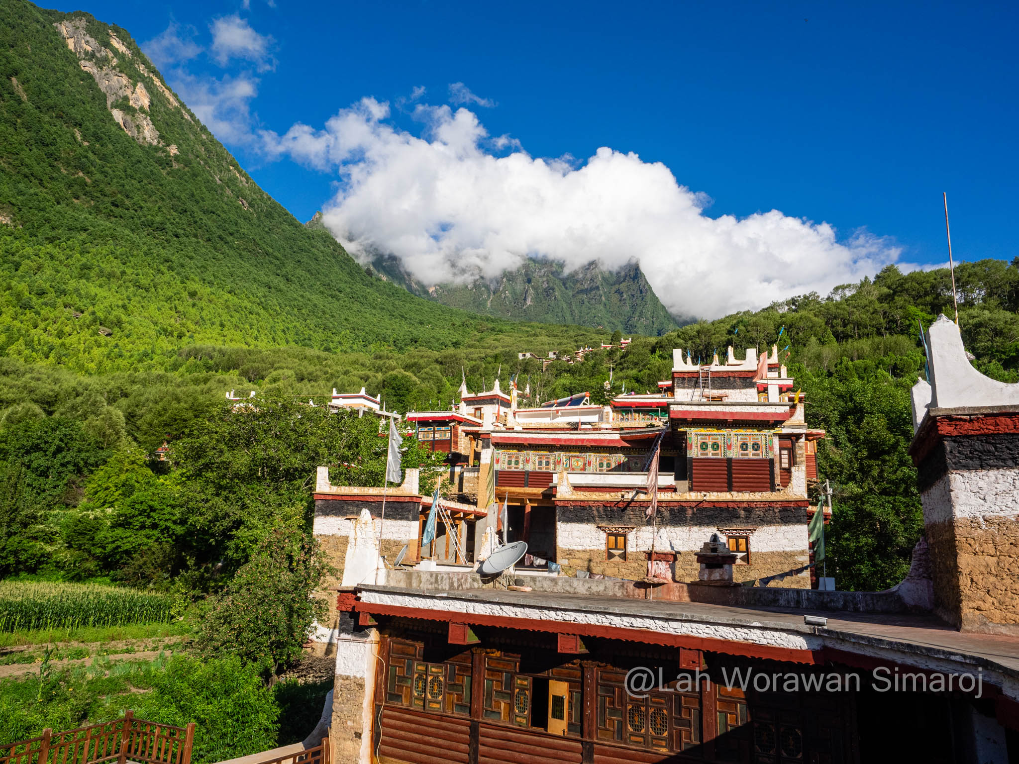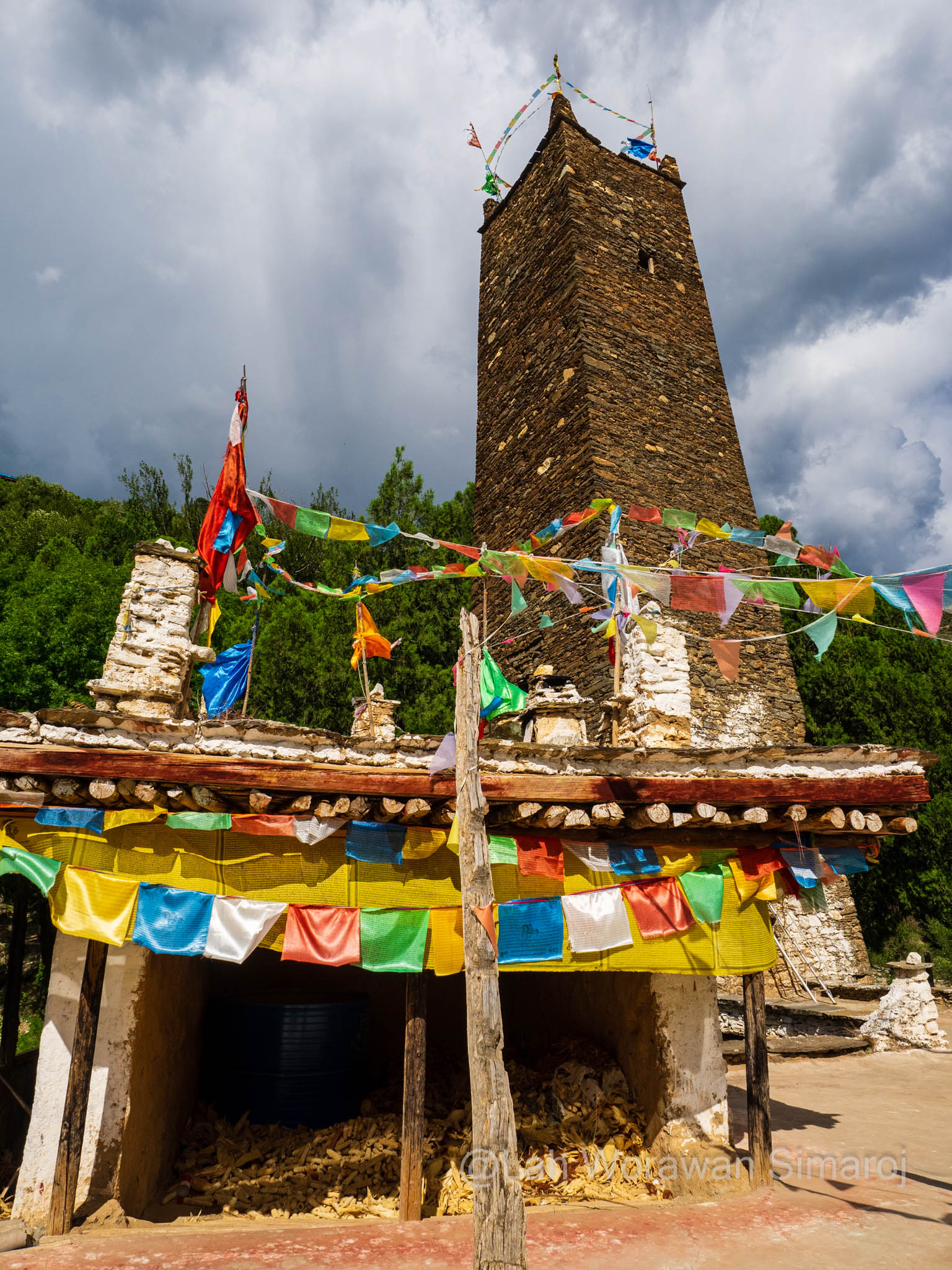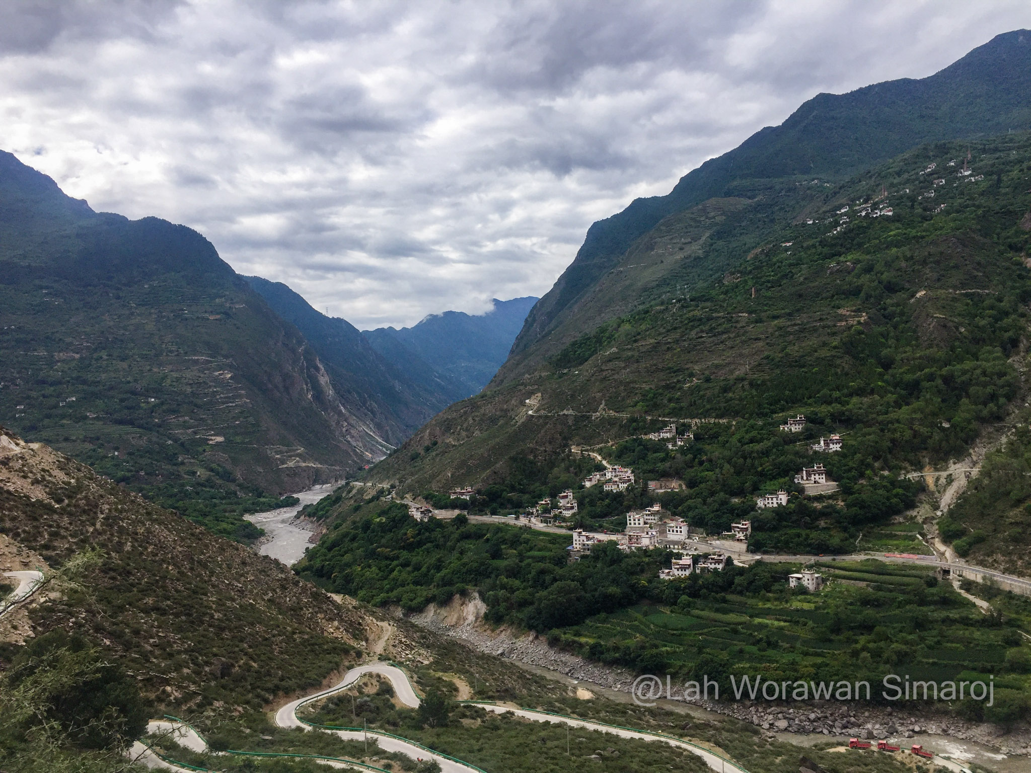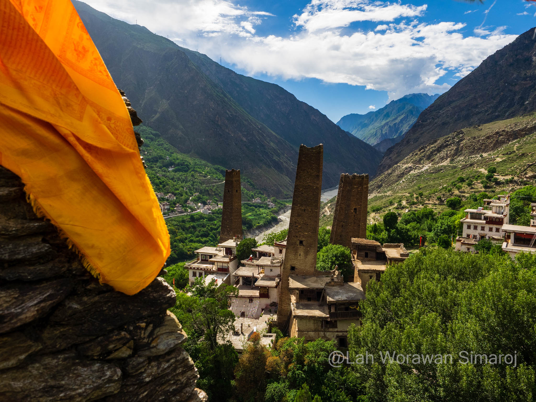 หลังจากรถติดอยู่ในตัวเมืองเฉินตูประมาณหนึ่งชั่วโมงกว่าๆ ในที่สุดรถของเราก็หลุดเข้าสู่เส้นทางที่เริ่มเข้าสู่เขตที่ราบสูงของมณฑลเสฉวนและส่วนหนึ่งของเทือกเขา Hengduan (เหิงต้วน) ถนนเลาะเลี้ยวไปตามแม่น้ำ มีอุโมงค์ที่ทะลุผ่านภูเขาเป็นระยะๆ ก่อนที่จะค่อยๆไต่ความสูงขึ้นไปที่สามพันกว่าเมตร ระหว่างเส้นทางสามารถมองเห็นยอดภูเขาหิมะไกลๆของเทือกเขาแถบนี้ได้ โดยขึ้นอยู่กับสภาพอากาศที่เปิดปิดมากน้อยแค่ไหน ถนนเริ่มหักศอกคดเคี้ยวขึ้นไปถึงช่องเขาบริเวณใกล้ๆเทือกเขา Siguiniang (ซิกุยเนียน) หรือที่คนไทยเรียกว่าเทือกเขาสี่ดรุณี มีจุดพักรถชมวิวที่มีชาวบ้านเอาของที่หาได้ในดินแดนแทบนั้นมาวางขาย ซึ่งรวมถึงเนื้อบาบีคิวย่างสไตล์เสฉวน ผักป่า น้ำผึ้งป่า รวมไปถึงตัวกะท่างตากแห้ง! หลังจากนั้นเส้นทางจะลดระดับลงมาตามแนวไหล่เขาลัดเลาะไปตามแม่น้ำอีกครั้ง เนื่องจากครั้งนี้เป็นการเช่ารถมากันเอง พวกเราจึงสามารถบอกคนขับรถให้หยุดที่ไหนก็ได้ตามที่ต้องการ โดยนอกจากการพักเข้าห้องน้ำ (ข้างทาง) กินข้าว หยุดพักถ่ายรูปวิวทิวทัศน์เป็นระยะๆแล้ว จุดที่หยุดจริงจังจุดแรกคืออำเภอเล็กๆแห่งหนึ่งริมแม่น้ำ เนื่องจากมีอาคารหอคอยทรงแปลกตาขนาดใหญ่เรียกความสนใจของผู้ร่วมทางทุกคน อำเภอนี้มีชื่อว่า Worixiang (โหว่ยรืเซียง) ตั้งอยู่ริมแม่น้ำ Wori อาคารสูงแปลกตานี้เป็นหอคอยทรงสี่เหลี่ยมที่มีฐานสร้างจากหินและมีเก๋งสามชั้นสร้างจากไม้ในรูปแบบจีนทิเบตอยู่ด้านบนดูราวกับดอกเห็ด ตามประวัติเท่าที่หาได้หอคอยแห่งนี้สร้างขึ้นมา 200-300 ปีมาแล้วในสมัยต้นราชวงศ์ชิง (Qing) มีความสูงรวมทั้งหมดประมาณ 22.5 เมตร ถูกใช้เป็นป้อมปราการและเป็นหอเก็บคัมภีร์ในสมัยก่อน รอบๆหอคอยจะมีผู้เฒ่าผู้แก่นั่งจับกลุ่มหญิงชายคุยกันอยู่ ท่าทางอัธยาศัยใจดี ยิ้มให้นักเดินทางหน้าตาแปลกๆอย่างพวกเรา และพยายามจะพูดคุยด้วยท่าทางเป็นกันเอง เมื่อพบว่ามีคนพูดภาษาจีนได้แม้จะเพียงน้อยนิดอยู่ก็ตามอยู่ในกลุ่มของพวกเรา