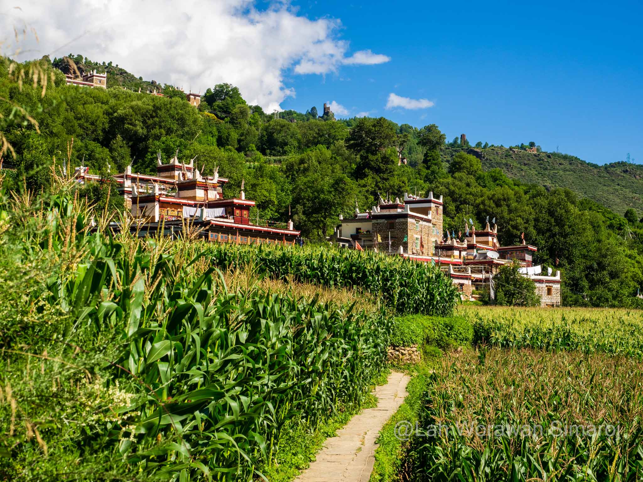 หากใครมีเวลาก็สามารถเดินเล่นไปตามถนนเล็กๆผ่านบ้านผู้คน คันนา ไร่ข้าวโพด ป่าละเมาะ ฯลฯ เพื่อชมหมู่บ้านได้อย่างอิสระเสรี เรียกว่ามีมุมให้ถ่ายรูปได้เรื่อยๆ มีที่ตั้งของหินศักดิ์สิทธิ์ประจำหมู่บ้าน ไปจนถึงจุดชมวิวตัวหมู่บ้าน ที่มีของขาย มีรถทัวร์มาลง เป็นต้น หลังจากที่พักที่หมู่บ้านนี้หนึ่งคืน ฉันวางเป้าหมายไว้ว่าจะไปนอนที่อีกหมู่บ้านหนึ่งที่ได้ชื่อว่าสวยงามไม่แพ้กันคือหมู่บ้าน Zhouglu (จรงหลู่) ที่ตั้งอยู่ในอีกหุบเขาหนึ่ง แต่เมื่อไปถึงแล้ว กลับพบว่าสะพานข้ามแม่น้ำที่ข้ามไปยังหมู่บ้านนี้กำลังก่อสร้าง รถผ่านไปไม่ได้ ต้องไปใช้อีกสะพานที่ต้องเดินข้ามเอา และโฮมสเตย์ที่คิดว่าจะไปพักก็ยังต้องเดินขึ้นเขาต่อไปอีกกะดูแล้วน่าจะประมาณ 2-3 กิโลเมตร ดูจากสภาพของตัวเองและสัมภาระที่หอบมาด้วยแล้ว พวกเราได้แต่ถอดใจและเปลี่ยนเป้าหมายไปที่หมู่บ้าน Suopo (โซโป) ทางตอนใต้ของตัวเมือง Danba ห่างไปประมาณ 12 กิโลเมตรแทน
