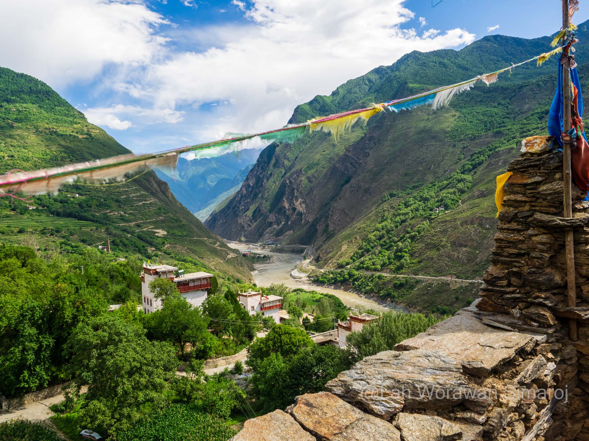 หลังจากที่ได้ที่พักเรียบร้อย ก็ได้เวลาสำรวจหมู่บ้านจริงๆจังๆ พวกเราเดินซอกซอนไปตามหอคอยต่างๆ เพื่อหาจุดถ่ายรูปสวยๆ ไปๆมาๆก็เจอบ้านที่น่าจะเป็นเจ้าของหอคอยแห่งหนึ่งที่ตั้งชิดกับตัวบ้าน เขามีกุญแจไขประตูเปิดอนุญาตให้พวกเราปีนขึ้นไปบนหอคอยได้ โดยไต่ไปตามบันไดไม้เก่าๆ ท่าทางเสี่ยงๆพอสมควร ด้านบนเป็นแค่ลานสี่เหลี่ยมเล็กๆ มองเห็นแม่น้ำ Dadu (ต้าตู่) ที่ไหลผ่านหมู่บ้าน รวมถึงหอคอยเก่าแก่อื่นๆ ในบริเวณใกล้เคียง มีธงมนตร์ผูกติดอยู่บนหอคอยด้านบนด้วย