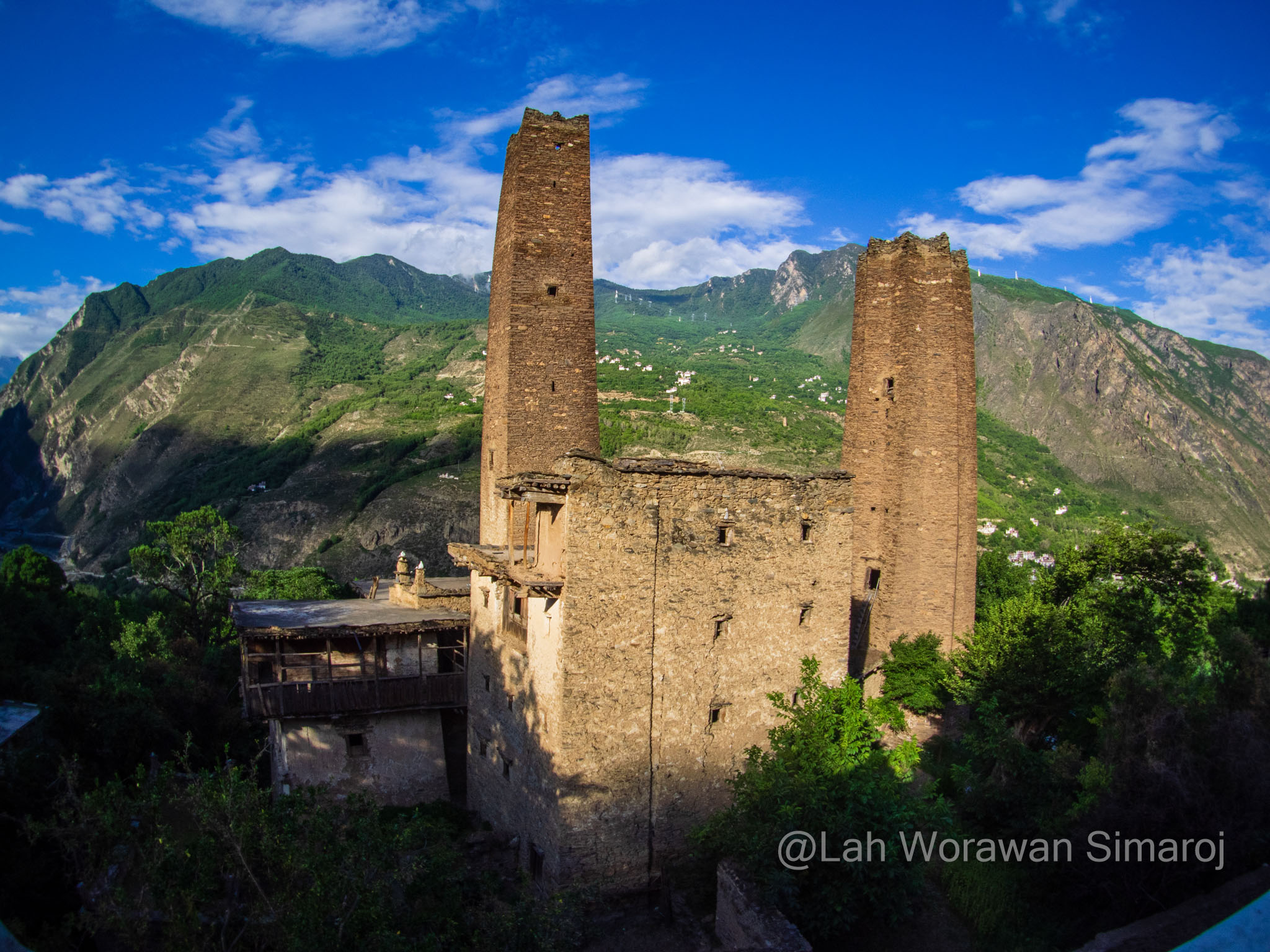 หลังจากผ่านเส้นทางออฟโรดริมหน้าผาหฤโหดอันเนื่องมาจากสะพานหลักปิดซ่อม และต้องอ้อมมาข้ามอีกสะพานแทน เราก็มาถึงหมู่บ้าน Suopo ซึ่งตั้งอยู่บนเขา Mo’erduo (มั่วเอ่อร์ตัว) อันมีชื่อเรื่องหอคอยโบราณ และพวกเราก็โชคดีได้ที่พักที่มีหอคอยโบราณขึ้นชื่อ ตั้งอยู่ตรงหน้าเลย เรียกได้ว่า ตื่นเช้ามาก็จิบชา ชมหอคอยกันที่ดาดฟ้าบ้านกันได้ จริงๆแล้ว หอคอยโบราณใน Danba มีเป็นพันๆ (ความสูงส่วนใหญ่ 20-60 เมตร) แต่ที่หมู่บ้านนี้มีความพิเศษ เพราะมีหอคอยที่สร้างเป็นรูปทรงแฉกแบบดาว มีความสูงถึง 60-70 เมตร (โดยทั่วไปหอคอยจะสร้างเป็นทรงสี่เหลี่ยม) และเป็นหนึ่งในหอคอยที่เก่าแก่ที่สุดของภูมิภาค มีการตรวจสอบไม้ที่เป็นส่วนหนึ่งของโครงสร้างหอคอยด้วยคาร์บอนแล้ว มีอายุย้อนกลับไปถึงช่วงศตวรรษที่ 12 เลยทีเดียว หอคอยเหล่านี้เชื่อกันว่าถูกสร้างโดยชาวเชียง ชาวพื้นเมืองเก่าแก่ของที่นี่ตามที่ได้กล่าวไปแล้ว โดยมีวัตถุประสงค์หลักเป็นหอคอยจุดไฟส่งสัญญาณเตือนภัย ในขณะเดียวกันก็ใช้เป็นที่เก็บสินค้าหรือผลิตผลทางการเกษตรต่างๆ รวมไปถึงการใช้เป็นสถานที่เซ่นไหว้สิ่งศักดิ์สิทธิ์ตามความเชื่อของผู้คนที่นี่อีกด้วย