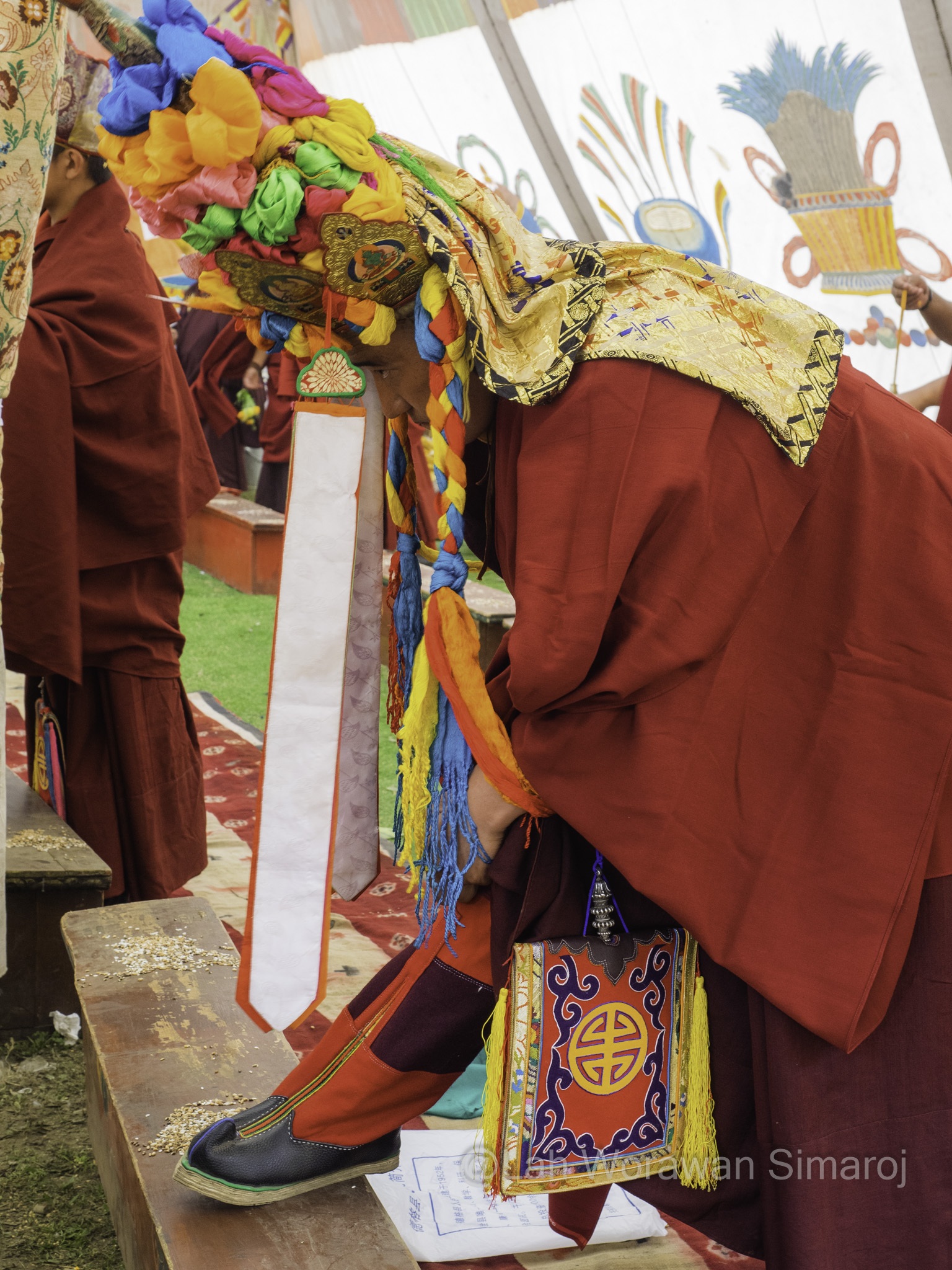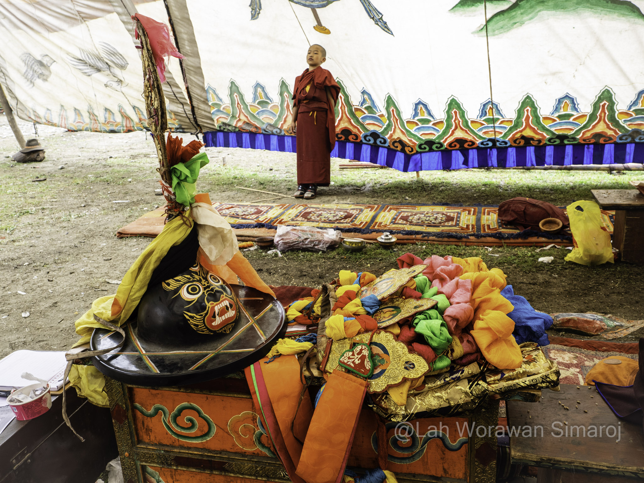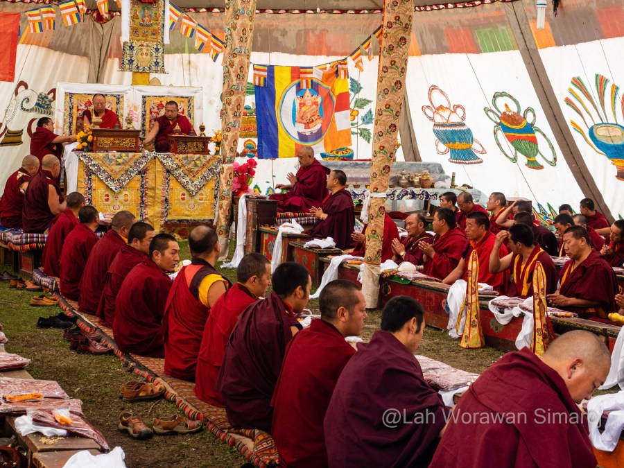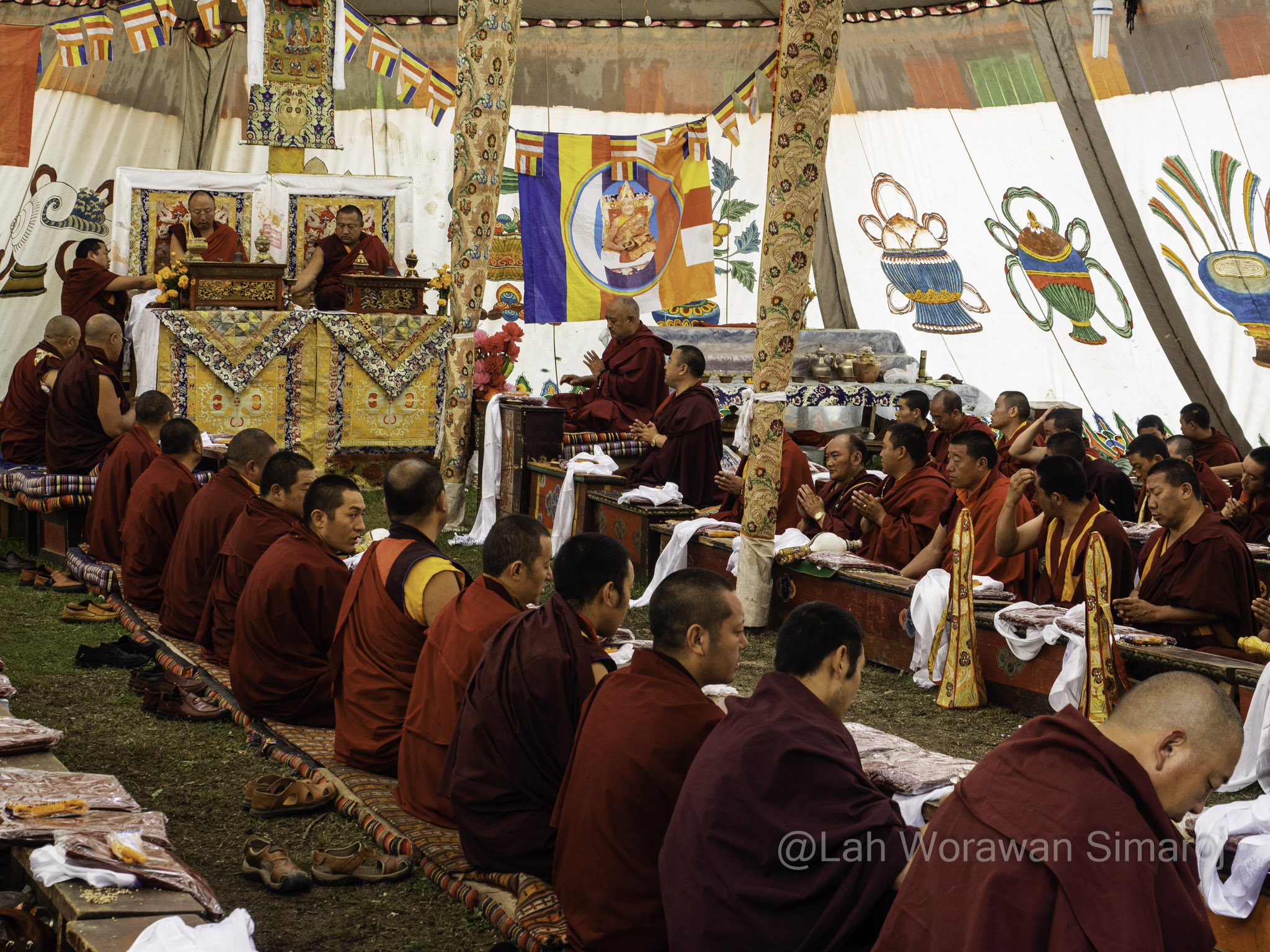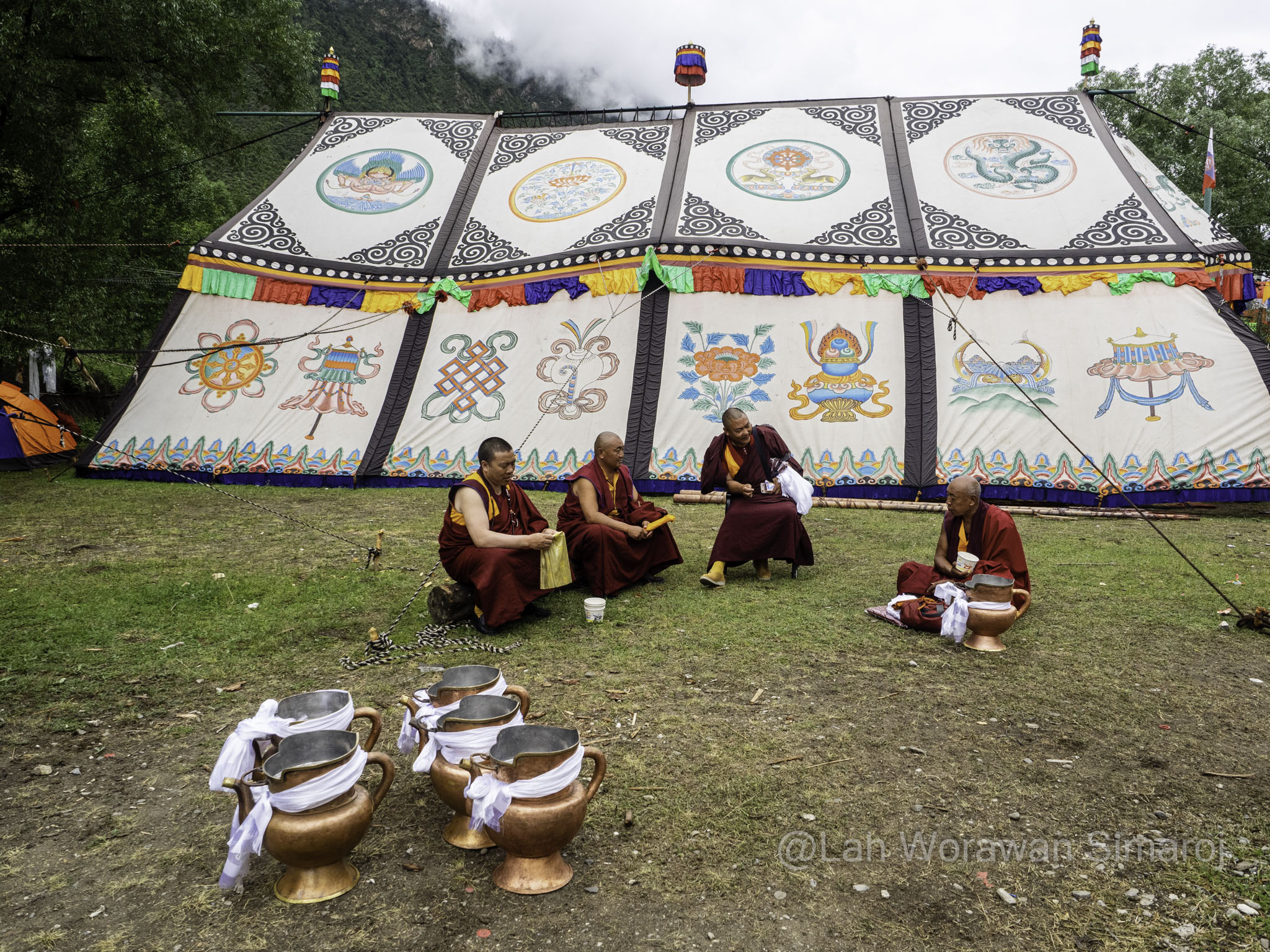 หลังจากเดินทางออกจากเมือง Dege ไปตามทางหลวง G317 ได้ไม่นาน ยังไม่ทันที่จะได้ไปจนถึงชายแดนที่จะเข้าสู่ทิเบตตามที่ตั้งใจไว้ จากเดิมที่สายตามองผ่านๆ วิวสองข้างทางที่เห็นแต่สายน้ำที่ถนนลัดเลาะไปกับภูเขาและทุ่งหญ้าโล่งๆเสียส่วนใหญ่ ถ้าไม่ผ่านเข้าเขตหมู่บ้านอะไร ก็มีผู้คนให้เห็นน้อยเต็มที ทันใดนั้นสายตาทุกคู่บนรถต่างก็เหลือบไปเห็นกลุ่มเต๊นท์และธงสีสันสดใสตั้งเด่นเป็นสง่าอยู่ไม่ไกลจากริมถนน ซึ่งเรียกความสนใจของพวกเราแน่นอนตามสไตล์การเดินทางแบบเจออะไรอยากแวะก็แวะ ค่ำไหนนอนนั่น พวกเราบอกให้คนขับรถขับไปยังความคึกคักที่เห็นนั้นทันที ในใจฉันคิดว่าฤาจะมีงานเทศกาลรื่นเริงอะไรกันอีกแล้ว? แล้วก็ไม่ผิดหวัง คราวนี้ไม่ใช่งานรื่นเริงของชาวบ้านแบบที่ผ่านมา แต่กลายเป็นเต๊นท์ผ้ามีลวดลายแบบทิเบตขนาดใหญ่ที่มีพระลามะกำลังสวดมนต์กันอยู่ ตรงกลางลานมีธงมนต์สีสันสดใสประดับด้านบนทำเหมือนเป็นกระโจมขนาดใหญ่ ชาว Khampa (ชาวทิเบตที่อยู่ในดินแดน Kham) ต่างมารวมตัวกันนั่งล้อมวงลานตรงกลางที่มีหญ้าเทียมปูอยู่ราวกับมีงานบุญอะไรสักอย่าง หลังจากที่พระลามะสวดมนต์เสร็จ ก็เริ่มแต่งตัวเพื่อเตรียมตัวออกมาร่ายรำกัน เท่านั้นแหละนักเดินทางที่พลัดหลงเข้ามาแบบพวกเราเหมือนเจอดินแดนมหัศจรรย์ ต่างรุดกันไปเตรียมกล้องเตรียมแบตเตอรี่ให้พร้อมกันยกใหญ่ จากตอนแรกที่นึกว่าจะเข้ามาเดินดูเล่นๆว่าเขามีอะไรกัน และเดินติดตัวมาแค่โทรศัพท์มือถือหรือไม่ก็กล้องตัวเล็กๆเท่านั้น