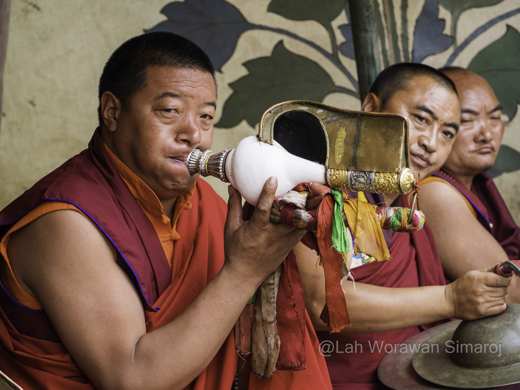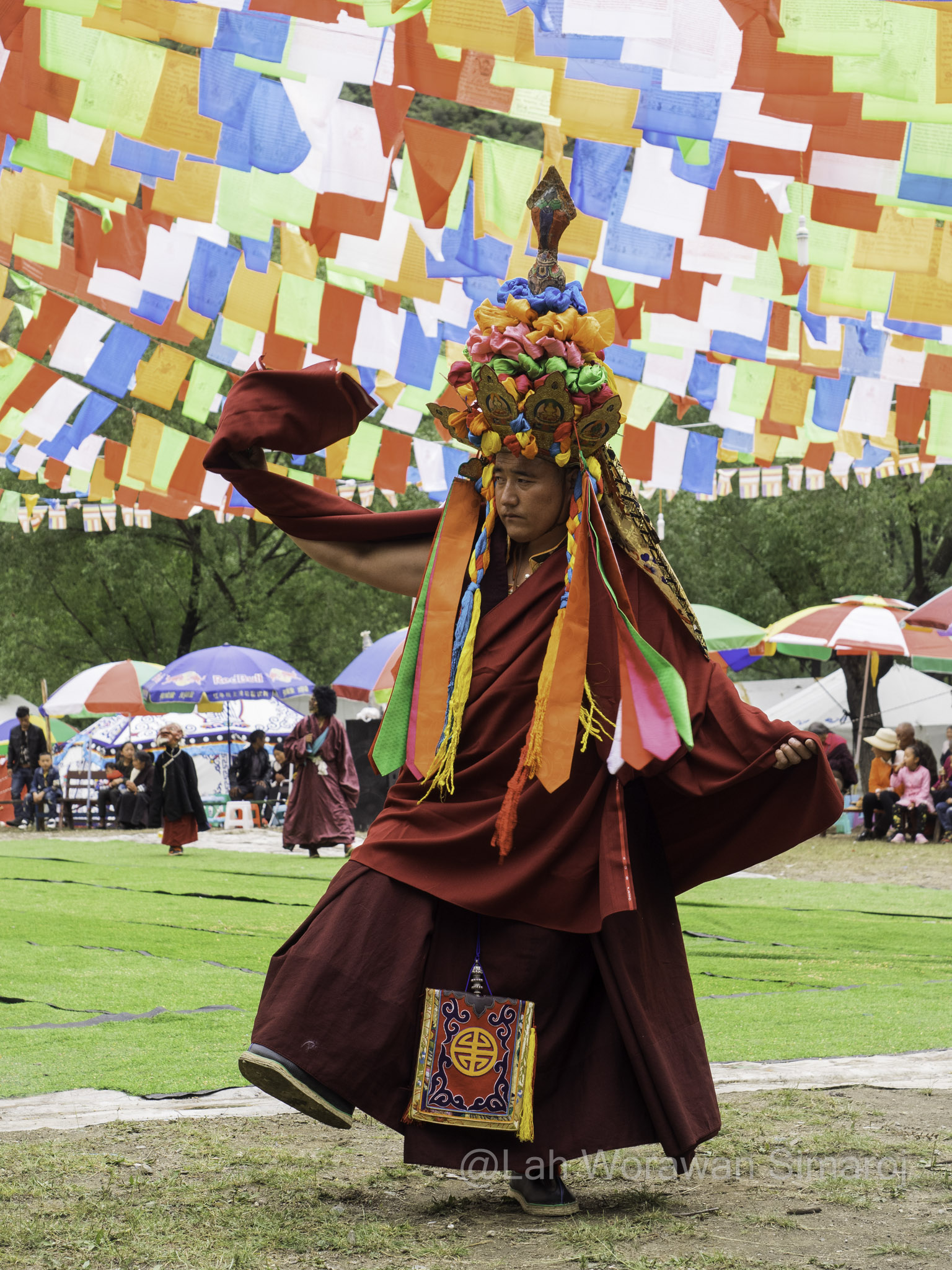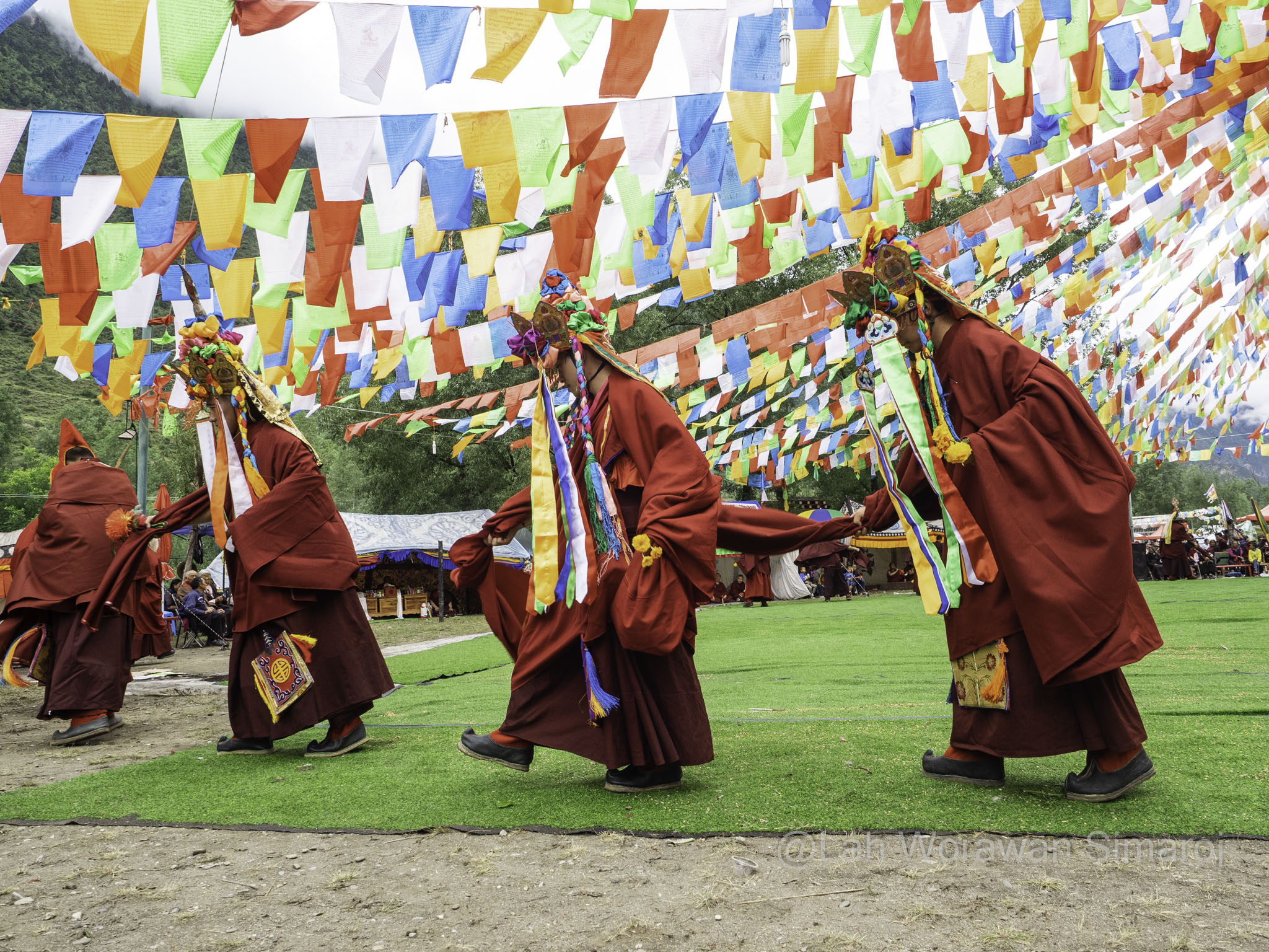 จากประสบการณ์ที่ผ่านมา ฉันเคยได้ไปดูการเต้นรำศักดิ์สิทธิ์ของพระลามะทิเบตที่เรียกว่า Cham Dance อยู่บ้าง ซึ่งส่วนใหญ่ที่รู้จักกันเป็นอย่างดีคือการเต้นรำที่พระสวมหน้ากากแต่งตัวด้วยเสื้อผ้าสีสดใส โดยต้องไปดูที่วัดหรือวิหารขนาดใหญ่ของศาสนาพุทธแบบทิเบตให้ถูกที่ถูกเวลางานเทศกาล (สามารถหาดูได้ทั้งในลาดัก อินเดีย ในทิเบต ในภูฏาน ในจีนเอง หรือที่อื่นๆที่มีพุทธฯแบบทิเบต (วชิรญาณหรือตันตระ) ตั้งมั่นอยู่ คราวนี้ฉันเลยแปลกใจอยู่ไม่น้อยที่มาเจอการเต้นรำศักดิ์สิทธิ์นี้เอากลางลานสาธารณะ ไม่ใช่ในลานวัดแบบที่อื่นๆ แถมยังได้เห็นพระและเณรตั้งแต่เริ่มแต่งตัวกันอยู่ในเต๊นท์ จนค่อยๆเดินออกไปร่ายรำเป็นวงอยู่ด้านนอก แม้ว่าจะไม่ใช่การเต้นรำใส่หน้ากากแต่งตัวเต็มยศแบบที่เคยเห็น แต่ก็เป็นหนึ่งใน Cham Dance ของทิเบตที่เป็นวัฒนธรรมเก่าแก่กว่าพันปีแน่นอน ว่ากันว่าการร่ายรำแบบนี้ก็เพื่อขจัดอุปสรรคต่างๆ ที่กีดขวางความสุขในชีวิตของคนเรา เช่นความเศร้าหมอง หรือความไม่รู้ถึงสาเหตุของความทุกข์เป็นต้น ถือเป็นหนึ่งในการทำสมาธิอย่างหนึ่งของชาวทิเบตทั้งตัวลามะที่เป็นพระเองและชาวบ้านทั่วไปที่เข้ามาชม ที่มุมหนึ่งรอบๆลานเต้นรำจะมีพระลามะเล่นดนตรีประกอบการร่ายรำ ทั้งแตร ปี่ยาว หอยสังข์ กลอง ฯลฯ ที่เป็นเครื่องดนตรีพื้นเมืองแบบทิเบตให้เห็น ว่ากันว่าการร่ายรำที่พระลามะหมุนตัวไปมาเป็นวงๆแบบนี้ ยิ่งเต้นนานก็จะยิ่งศักดิ์สิทธิ์ ยิ่งเต้นนานคนร่ายรำก็จะยิ่งเข้าสู่การเข้าฌาณ ในขณะเดียวกันก็มีเรื่องราวที่ถ่ายทอดสู่พุทธศาสนิกชนที่เข้ามาชมการร่ายรำไปด้วย