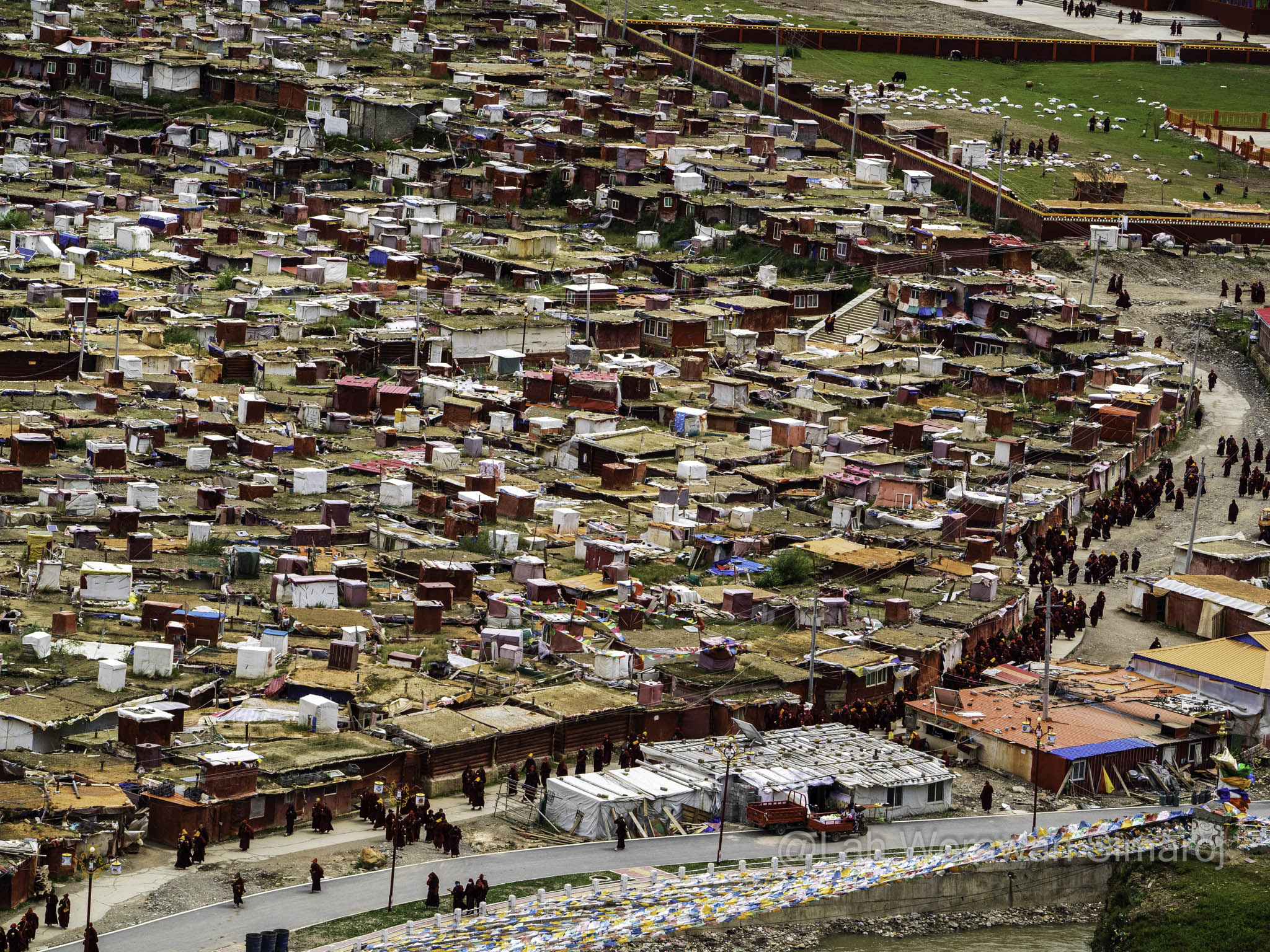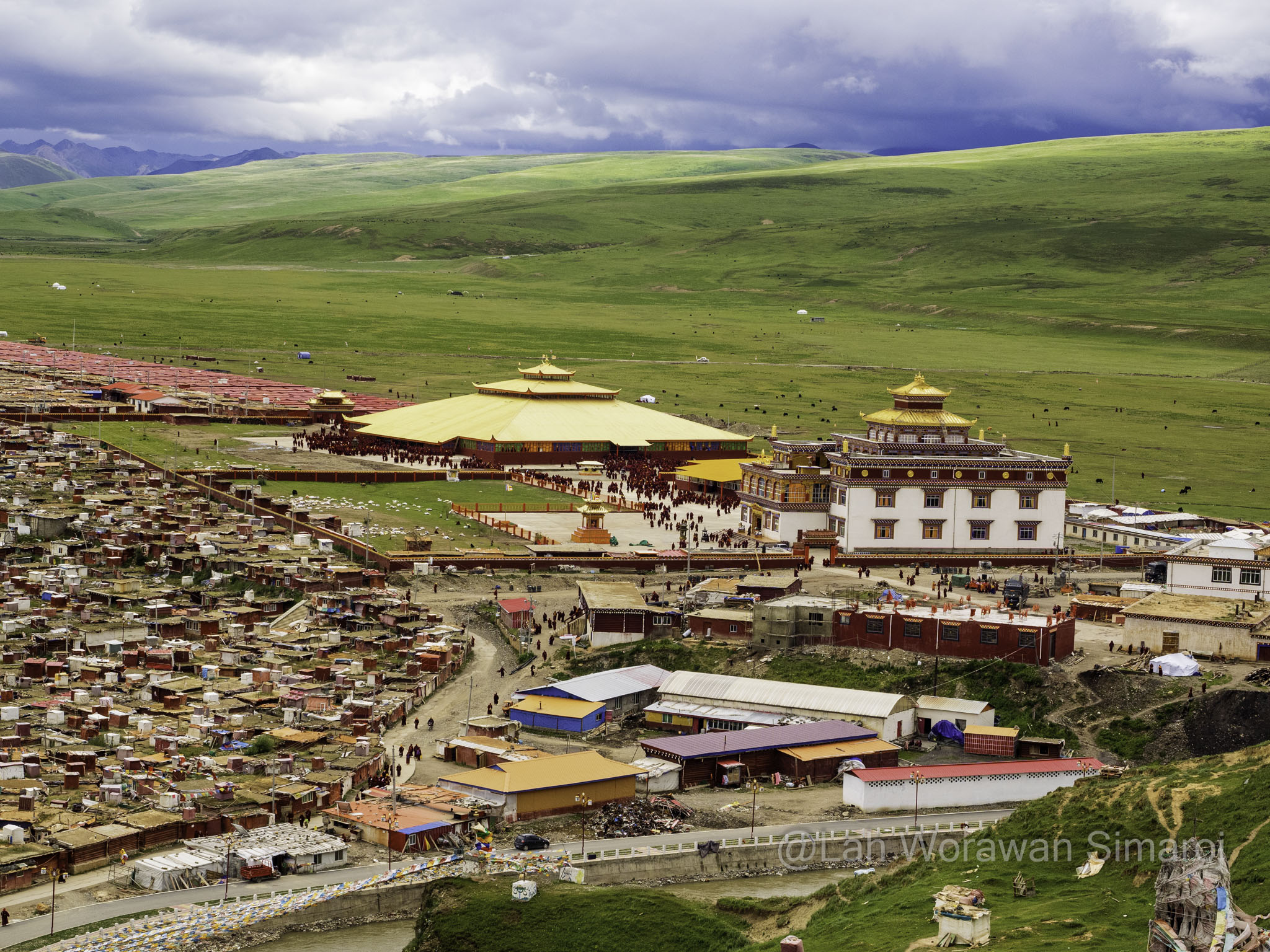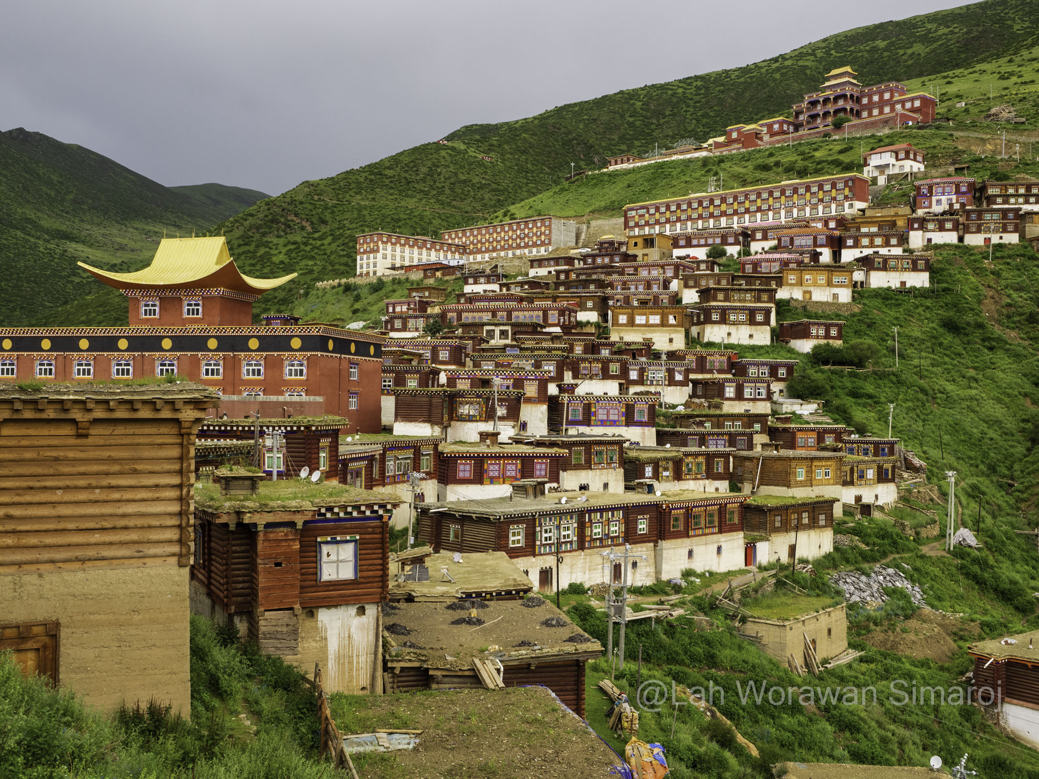 Yarchen Gar หรือมีชื่อเป็นทางการว่า Yaqên Orgyän Temple (วัดยาเชนออร์กยัน) ตั้งอยู่บนหุบเขาที่ความสูงสี่พันเมตรในเขตปกครอง Baiyü (ไป่ยู๋) บริเวณนี้เป็นที่ตั้งของวัด สถาบันศึกษาพุทธศาสนาและที่พักอาศัยของนักบวชอันได้แก่ภิกษุและภิกษุณีของศาสนาพุทธแบบทิเบต นิกาย Nyingma (ญิงมา) หรือนิกายหมวกแดง โดยนักบวชที่นี่ส่วนใหญ่จะเป็นผู้หญิงที่อาศัยรวมๆกันอยู่เป็นหมื่นคน จนได้ชื่อว่าเป็น “City of Nuns” ถ้าอยากเห็นภาพของชุมชนนี้อย่างชัดเจนจะต้องเดินขึ้นไปบนเนินสูงนอกชุมชน ดูจากบนเนินไกลๆแบบนี้ ชุมชนที่เป็นเหมือนเมืองตรงกลาง (ที่ไม่ใช่ตัววัด) ดูคล้ายชุมชนแออัด (จริงๆนี่คือที่พักของเหล่าภิกษุณี) เต็มไปด้วยบ้านพักเล็กๆสร้างเป็นกล่องๆง่ายๆอย่างหนาแน่น มีโค้งน้ำโอบรับและล้อมรอบไปด้วยภูเขาทุ่งหญ้า ให้ภาพที่สวยแปลกตาเอามากๆ และเป็นภาพที่ดึงดูดให้นักท่องเที่ยวมาเยือนที่นี่ จากจุดนี้ฉันได้เห็นภิกษุณีในชุดสีแดงเลือดหมูเป็นพันๆเดินเรียงแถวออกมาจากวัด ที่คาดว่าจะไปเดินจงกรมกันรอบเขา นอกจากนี้ยังมีวัดใหม่ขนาดใหญ่ตั้งอยู่ด้วย ที่นี่เป็นที่เลื่องลือเรื่องการขับไล่ที่ของรัฐบาลจีนโดยอ้างว่าเป็นชุมชนแออัด แต่แฝงด้วยการเมืองที่ต้องการทำลายชุมชนชาวทิเบตขนาดใหญ่ จนมีเรื่องเกรียวกราวในหน้าข่าวของชาวทิเบตหลายต่อหลายครั้งถึงการละเมิดสิทธิมนุษยชน…Yarchen Gar จึงเป็นสถานที่หนึ่งที่เปิดๆปิดๆสำหรับชาวต่างชาติตามความพอใจของรัฐบาลจีนในแต่ละช่วงเวลา