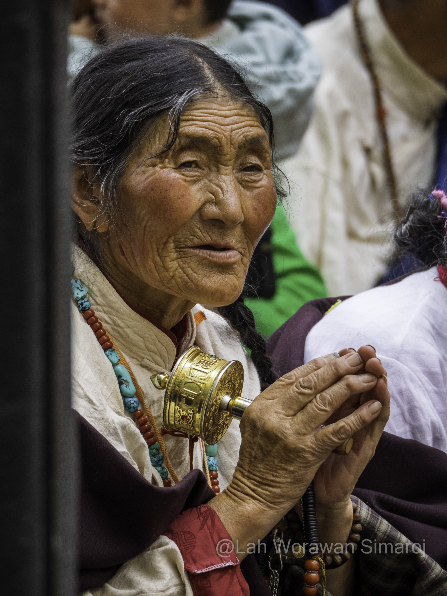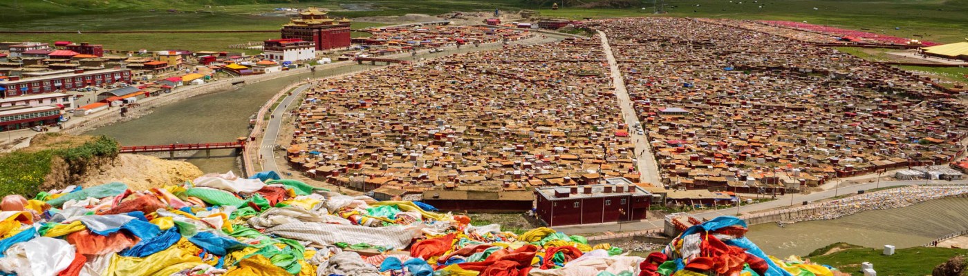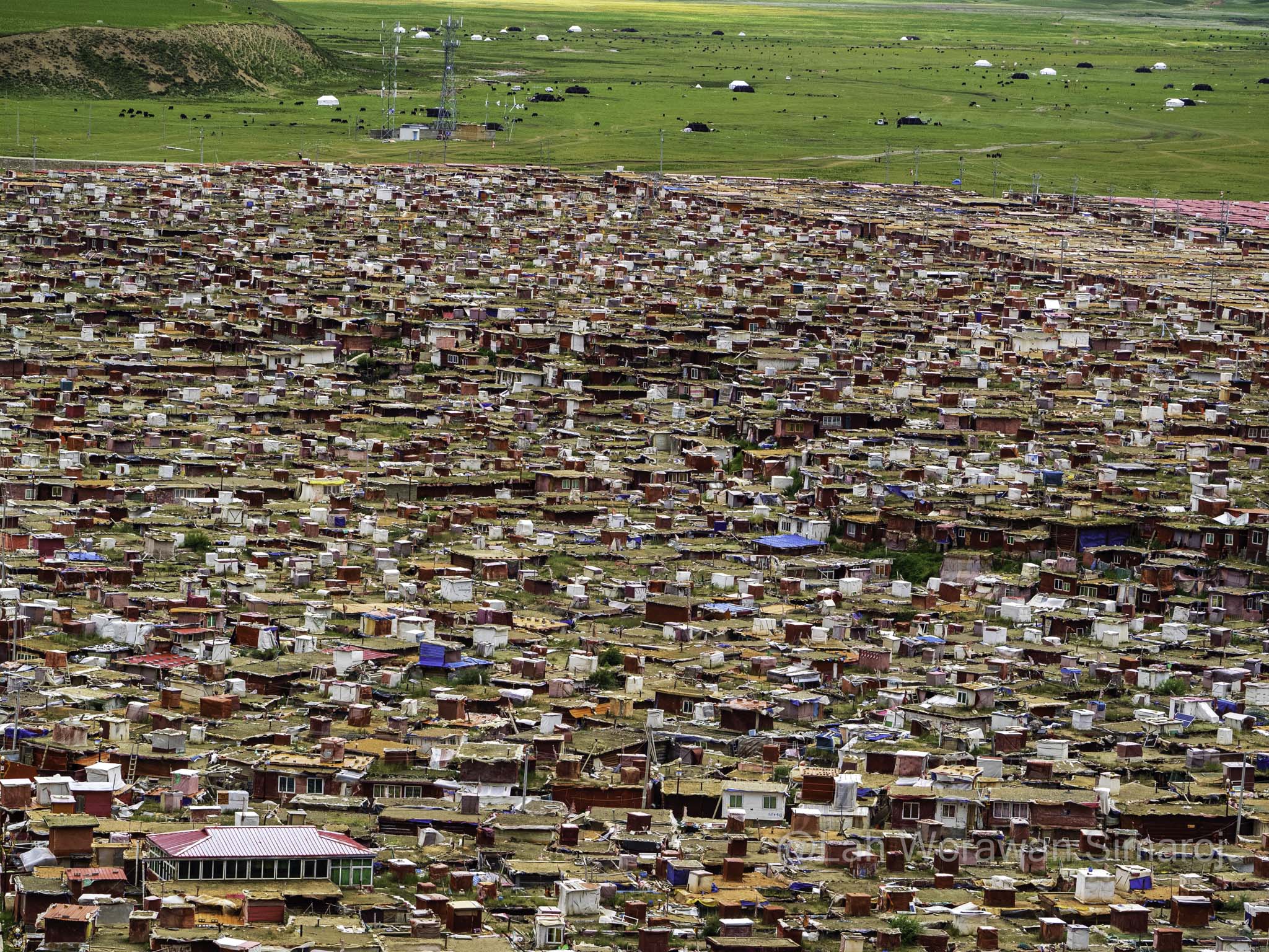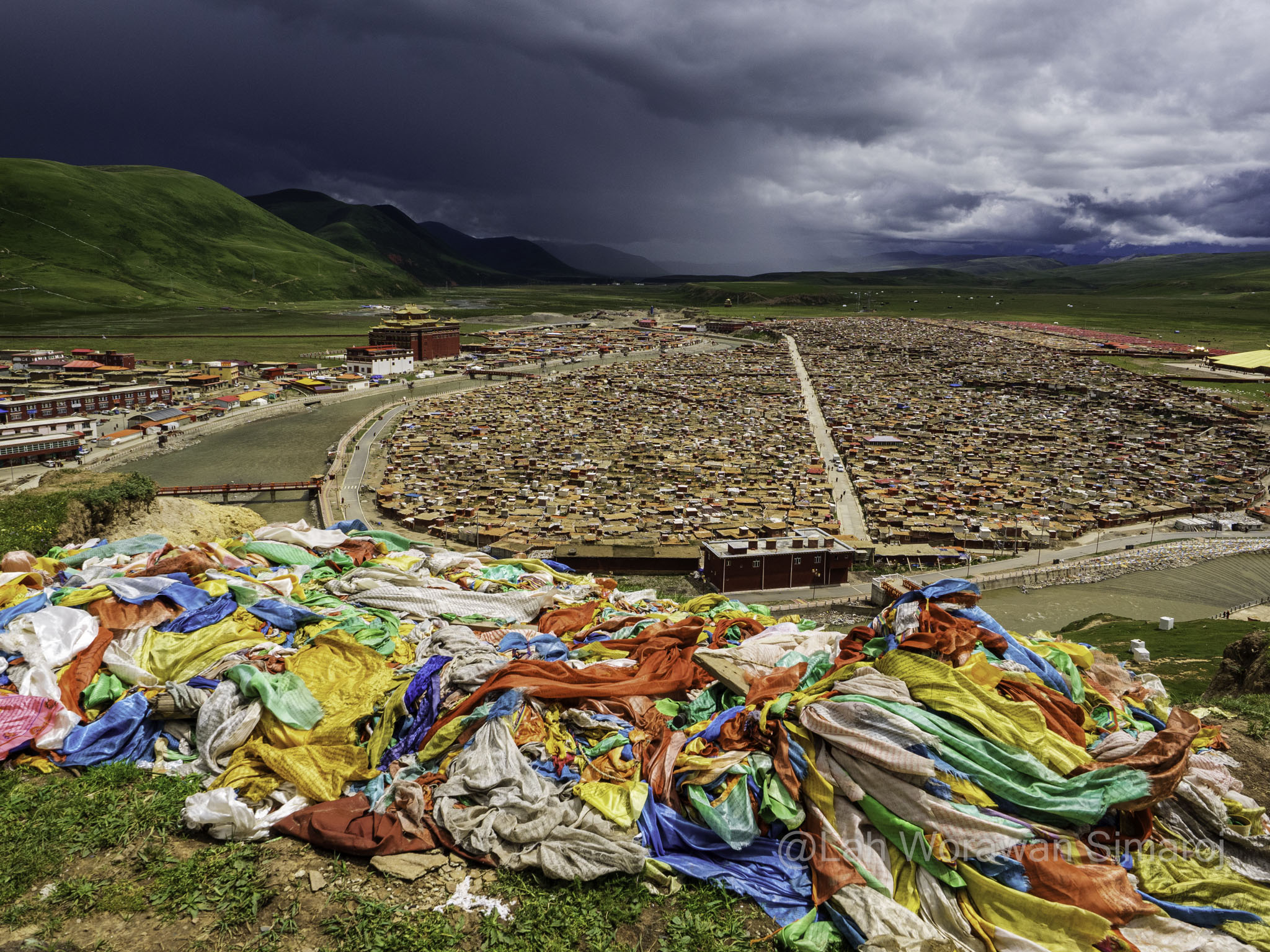 Yarchen Gar หรือมีชื่อเป็นทางการว่า Yaqên Orgyän Temple (วัดยาเชนออร์กยัน) ตั้งอยู่บนหุบเขาที่ความสูงสี่พันเมตรในเขตปกครอง Baiyü (ไป่ยู๋) บริเวณนี้เป็นที่ตั้งของวัด สถาบันศึกษาพุทธศาสนาและที่พักอาศัยของนักบวชอันได้แก่ภิกษุและภิกษุณีของศาสนาพุทธแบบทิเบต นิกาย Nyingma (ญิงมา) หรือนิกายหมวกแดง โดยนักบวชที่นี่ส่วนใหญ่จะเป็นผู้หญิงที่อาศัยรวมๆกันอยู่เป็นหมื่นคน จนได้ชื่อว่าเป็น “City of Nuns” ถ้าอยากเห็นภาพของชุมชนนี้อย่างชัดเจนจะต้องเดินขึ้นไปบนเนินสูงนอกชุมชน ดูจากบนเนินไกลๆแบบนี้ ชุมชนที่เป็นเหมือนเมืองตรงกลาง (ที่ไม่ใช่ตัววัด) ดูคล้ายชุมชนแออัด (จริงๆนี่คือที่พักของเหล่าภิกษุณี) เต็มไปด้วยบ้านพักเล็กๆสร้างเป็นกล่องๆง่ายๆอย่างหนาแน่น มีโค้งน้ำโอบรับและล้อมรอบไปด้วยภูเขาทุ่งหญ้า ให้ภาพที่สวยแปลกตาเอามากๆ และเป็นภาพที่ดึงดูดให้นักท่องเที่ยวมาเยือนที่นี่ จากจุดนี้ฉันได้เห็นภิกษุณีในชุดสีแดงเลือดหมูเป็นพันๆเดินเรียงแถวออกมาจากวัด ที่คาดว่าจะไปเดินจงกรมกันรอบเขา นอกจากนี้ยังมีวัดใหม่ขนาดใหญ่ตั้งอยู่ด้วย ที่นี่เป็นที่เลื่องลือเรื่องการขับไล่ที่ของรัฐบาลจีนโดยอ้างว่าเป็นชุมชนแออัด แต่แฝงด้วยการเมืองที่ต้องการทำลายชุมชนชาวทิเบตขนาดใหญ่ จนมีเรื่องเกรียวกราวในหน้าข่าวของชาวทิเบตหลายต่อหลายครั้งถึงการละเมิดสิทธิมนุษยชน…Yarchen Gar จึงเป็นสถานที่หนึ่งที่เปิดๆปิดๆสำหรับชาวต่างชาติตามความพอใจของรัฐบาลจีนในแต่ละช่วงเวลา