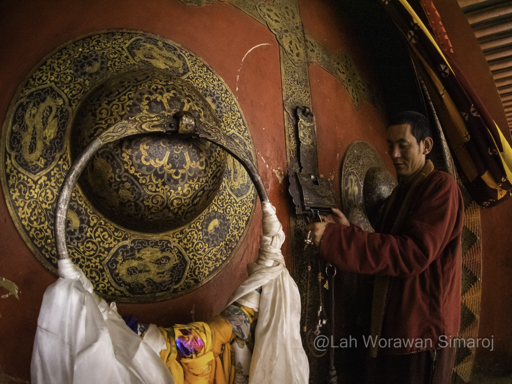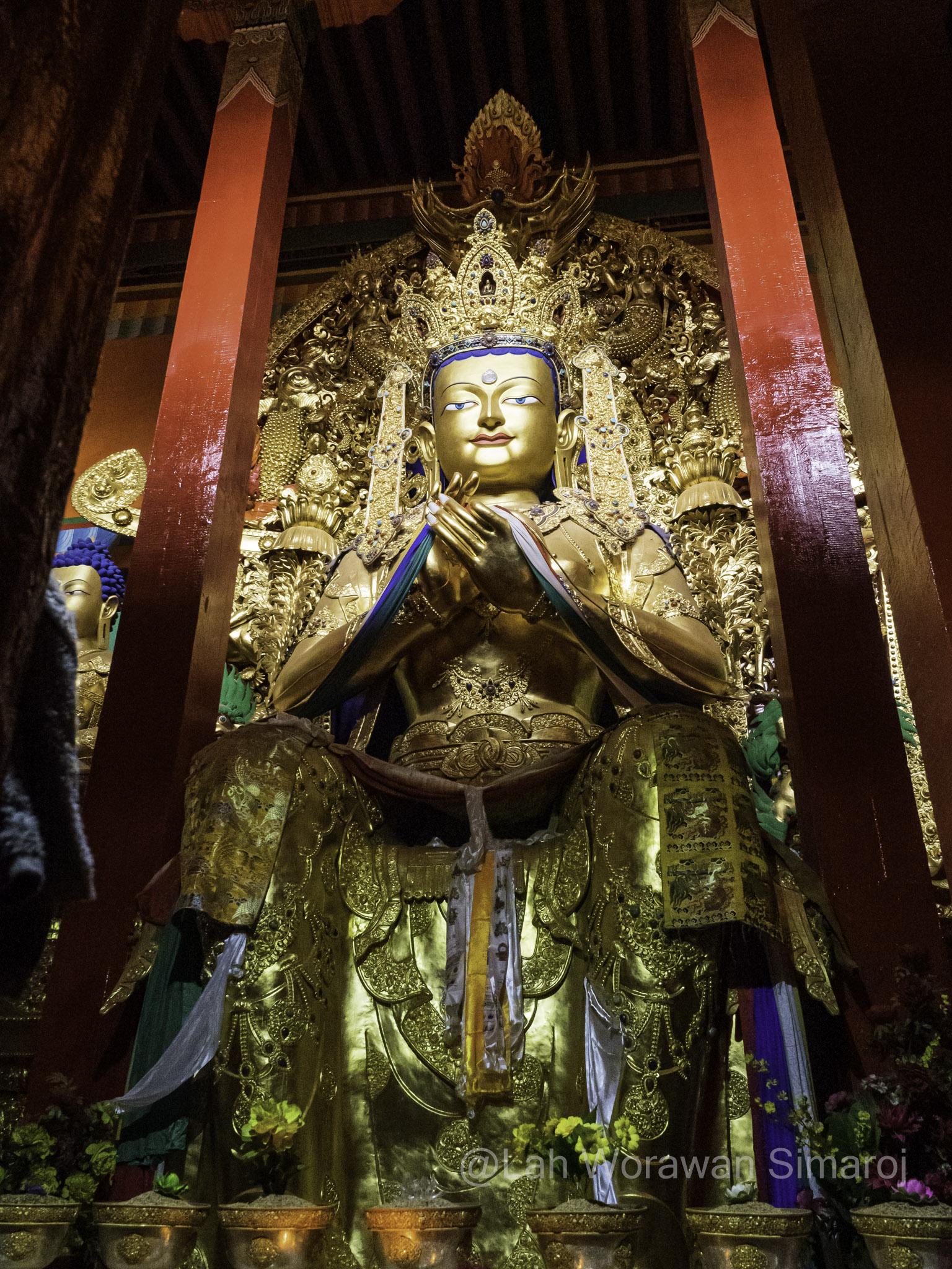ตัววัด Palpung มีอาคารอยู่หลายหลังตั้งลดหลั่นกันอยู่บนเนินเขาที่ความสูง 3,800 เมตร แต่พวกเราพุ่งเป้าไปที่อาคารหลังใหญ่ที่ดูเก่าแก่ที่สุด ซึ่งดูภายนอกออกจะทรุดโทรมแต่แฝงความขลังอยู่ในตัว พอเดินเข้าไปด้านในก็เห็นประตูไม้บานใหญ่อย่างสวย แต่ปิดล็อคอยู่ โชคดีที่เจอผู้หญิงโกนหัวโล้นคนหนึ่ง (น่าจะเป็นภิกษุณีหรือแม่ชีมาก่อน) ยืนรออะไรอยู่ หลังจากที่เข้าไปพยายามถามไถ่ไปๆมาๆ เธอก็โทรไปเรียกพระลามะรูปหนึ่งมาช่วยเปิดประตูให้เข้าไปชม ด้านในหลังประตูบานยักษ์ก็คล้ายๆวัดทิเบตทั่วไป คือมีประติมากรรมพระพุทธรูปและเทพต่างๆโดยรอบ ตรงกลางเป็นที่นั่งเป็นแถวๆสำหรับทำวัตรสวดมนต์ มีบัลลังค์ที่นั่งของพระผู้ใหญ่อยู่ด้านหนึ่ง ระหว่างที่เดินวนชมรอบๆอยู่อย่างสงบโดยไม่มีนักท่องเที่ยวหรือชาวบ้านคนอื่นอยู่เลย อยู่ดีๆพระที่มาเปิดประตูใหญ่ให้ ก็ไขกุญแจประตูไม้เก่าเล็กๆที่อยู่หลังพระพุทธรูปต่างๆให้ พอประตูแง้มเปิดออกเท่านั้น พวกเราทุกคนก็ตะลึงงันขึ้นมาทันที เนื่องจากด้านในประตูนั้นมีพระพุทธรูปสีทององค์โตที่มีพระพักตร์งดงามประดิษฐานอยู่อย่างโดดเด่นในบรรยากาศทึมๆของตัวอาคาร ให้ความรู้สึกเหมือนเดินทางผจญภัยมาเจอขุมทองยังไงชอบกล แถมยังโชคดีที่เขาให้ถ่ายภาพได้อีก (โดยมากวัดทิเบตมักไม่ค่อยอนุญาตให้ถ่ายภาพด้านใน) แม้ว่าจะมีเวลาเพียงไม่นานก็ตาม