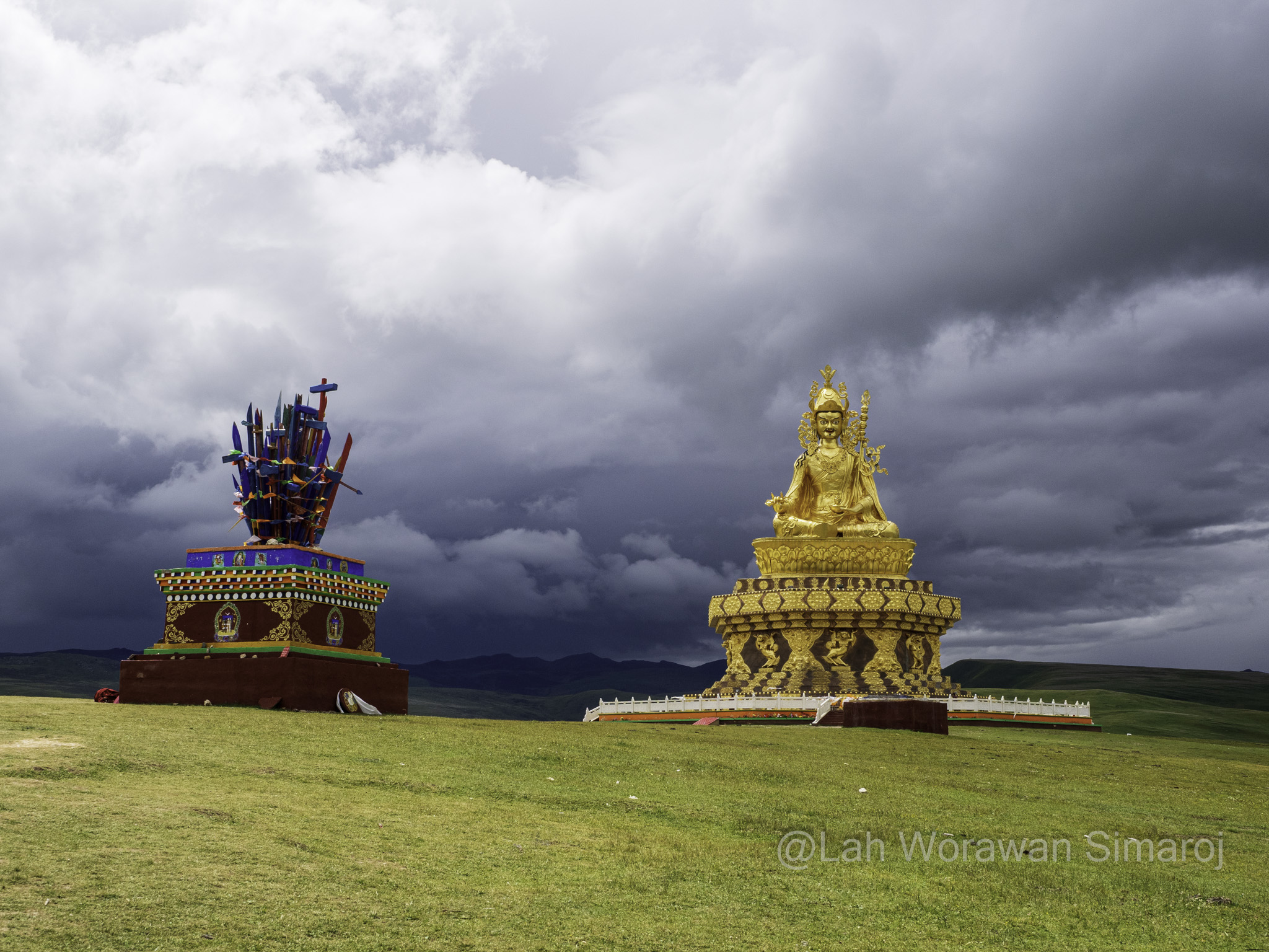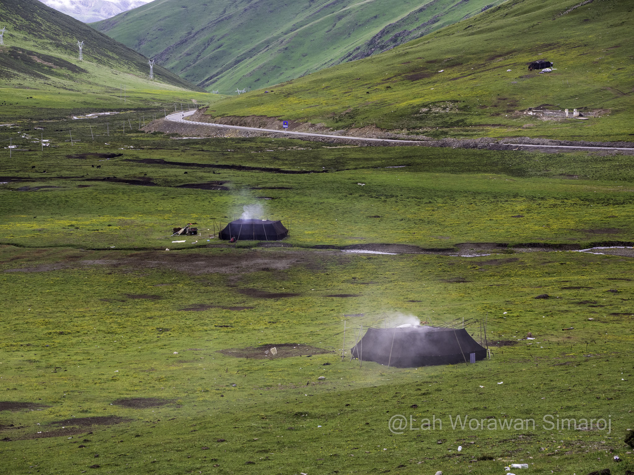 หลังจากที่ออกจากวัดนี้ พวกเราก็เดินทางผ่านภูเขาทุ่งหญ้าในพื้นที่สูง มองเห็นกระโจมสีน้ำตาลชาวเผ่าเร่ร่อนที่ย้ายที่เลี้ยงสัตว์เป็นระยะๆ และผ่านไปยังพื้นที่ชุมน้ำในที่สูงที่มีดอกไม้หน้าตาแปลกๆบานกันอยู่ริมน้ำอย่างสวยงาม โดยมีเป้าหมายที่อยู่นอกเส้นทางที่คิดเอาไว้ของเราในครั้งนี้คือไปเยี่ยมชม Yarchen Gar (ยาเชนการ์) อันขึ้นชื่อเรื่องชุมชนภิกษุณีชาวทิเบตที่น่าจะใหญ่ที่สุดในโลกและการทำลายล้างชุมชนของรัฐบาลจีน… เนื่องจากระหว่างเส้นทางที่ผ่านมา เราได้เห็นรูปภาพของที่นี่จากนักท่องเที่ยวชาวจีนคนอื่นที่เผอิญได้มาคุยกัน จากที่ตอนแรกไม่คิดว่าจะไปที่นี่ได้เนื่องจากทางการจีนค่อนข้างเข้มงวดกับการเข้าออกไปบริเวณนั้นโดยเฉพาะสำหรับคนต่างชาติ แต่จากคำบอกเล่าของชาวจีนที่เราเจอ เขาบอกว่าไปได้ เราก็เลยลองไปดูและก็ไปถึงจริงๆและได้เห็นภาพชุมชนภิกษุณีแห่งนี้จริงๆจากบนเนินเขารอบๆ (ไม่สามารถเข้าไปภายในชุมชนได้)